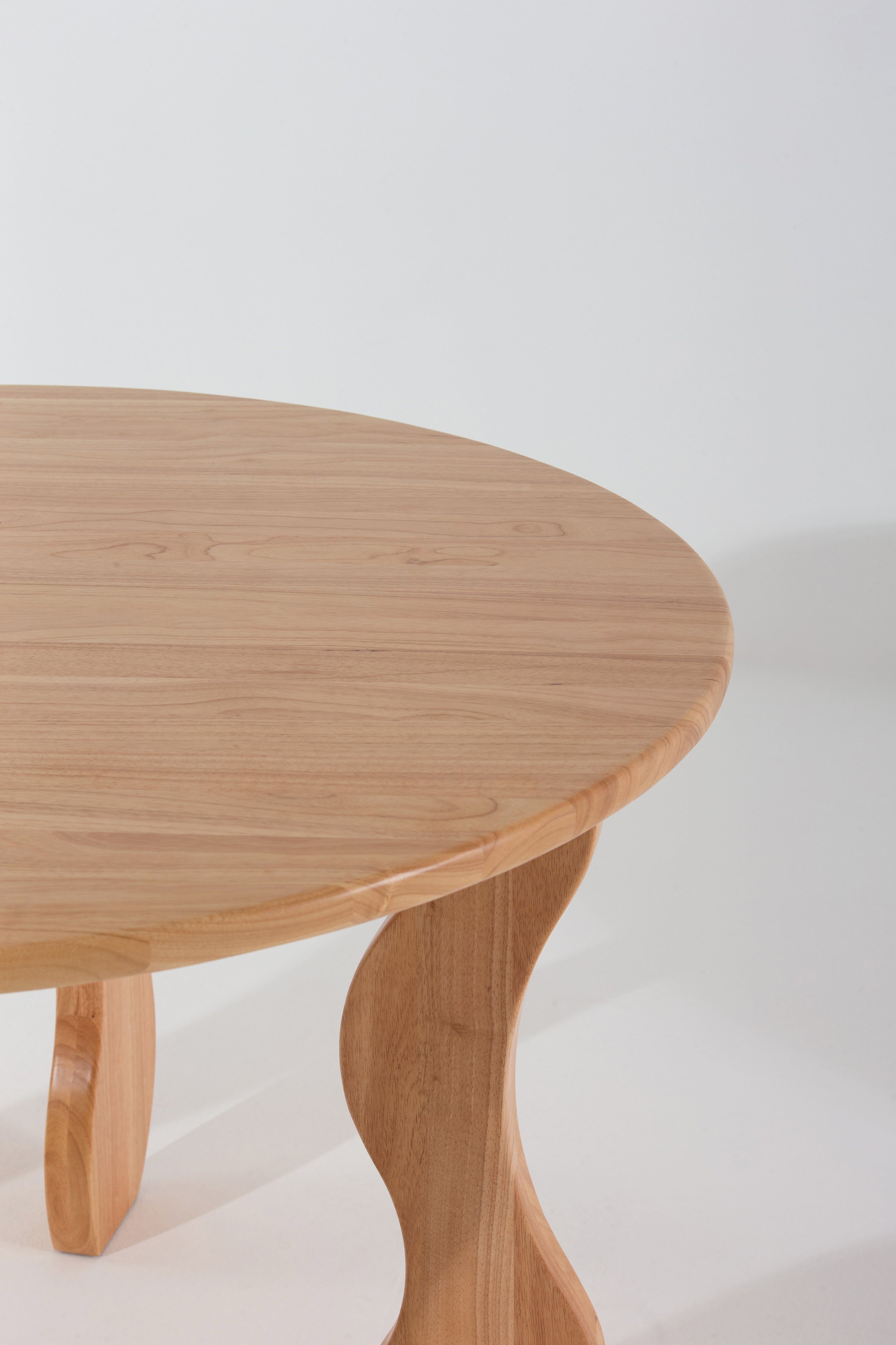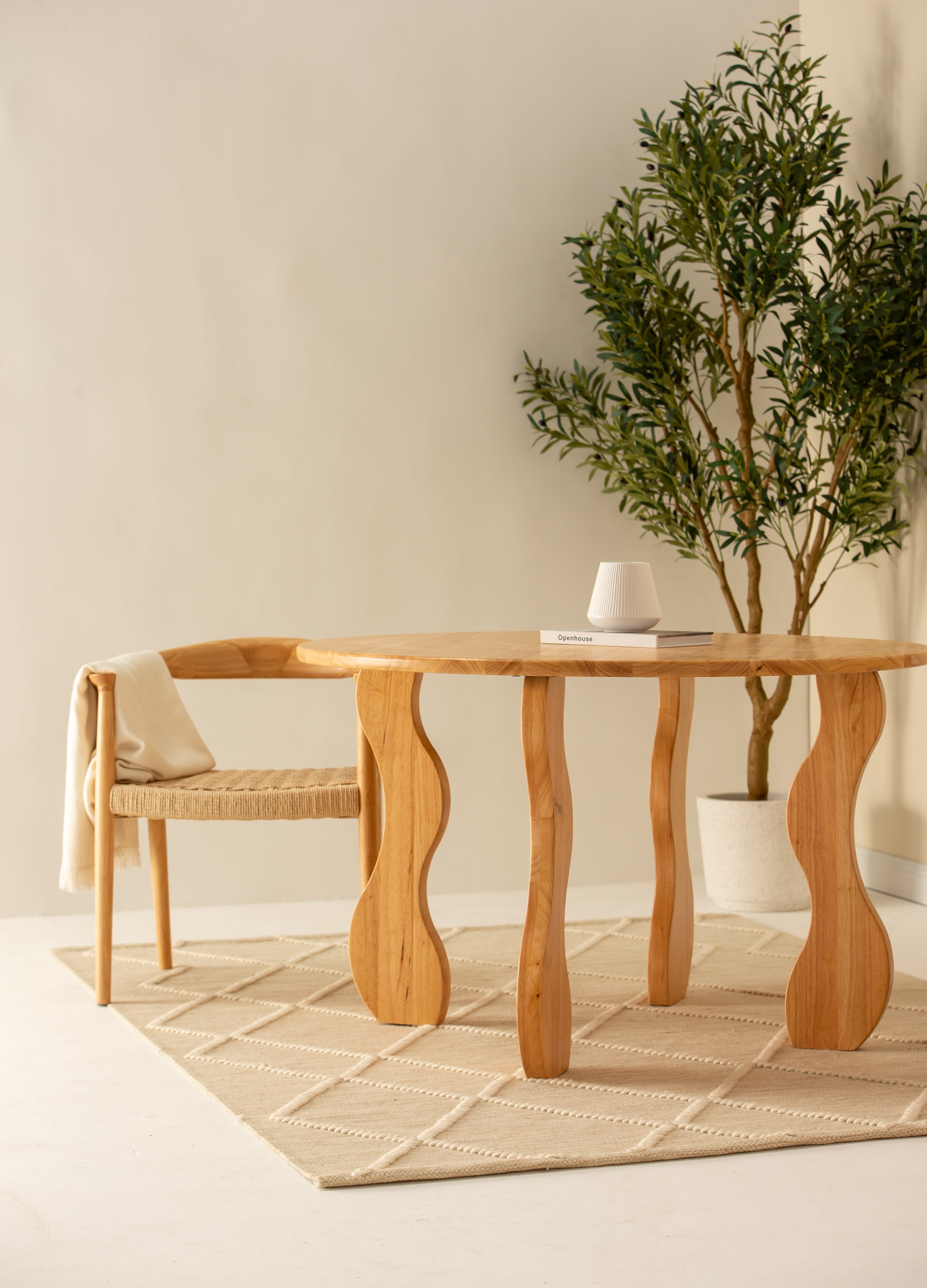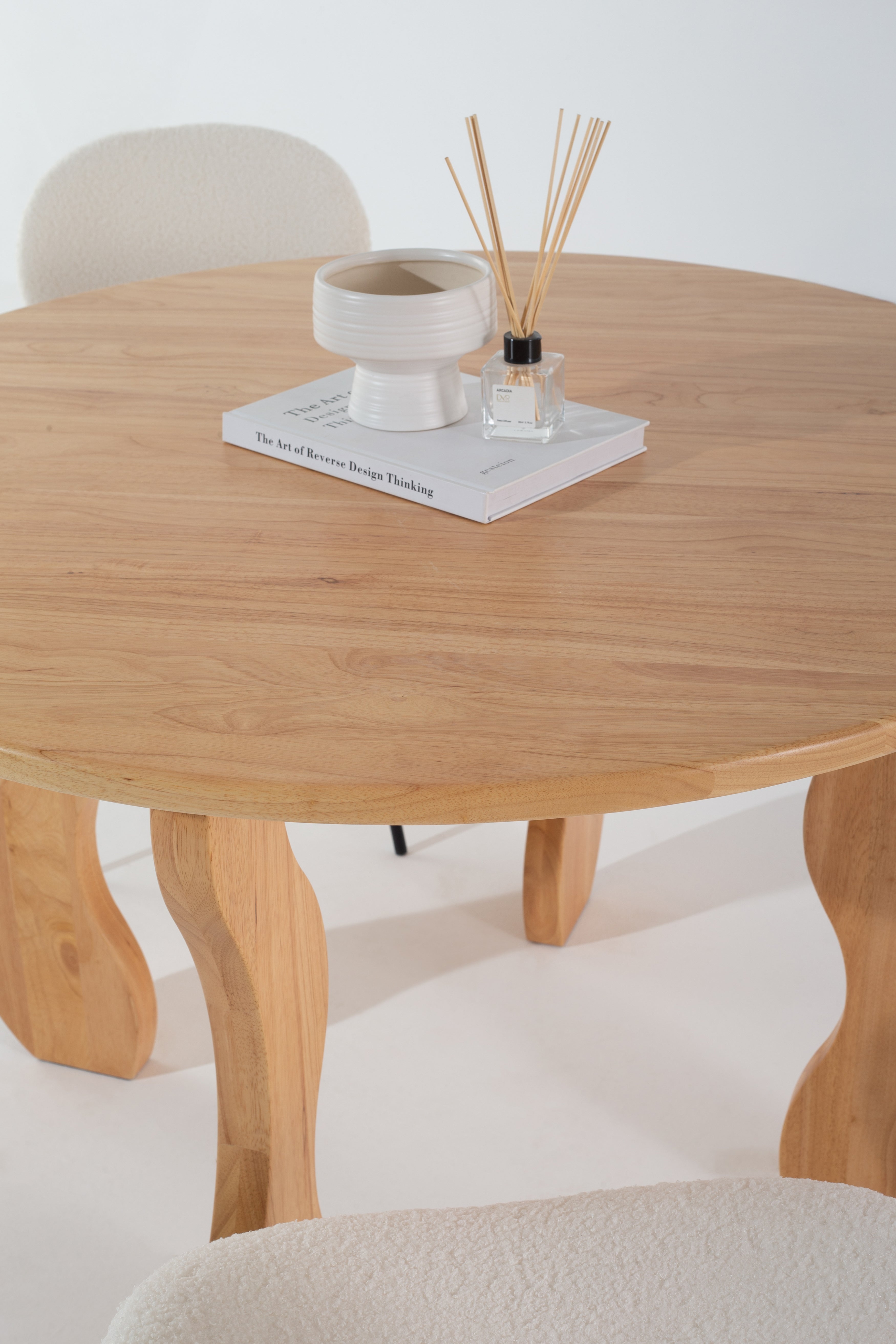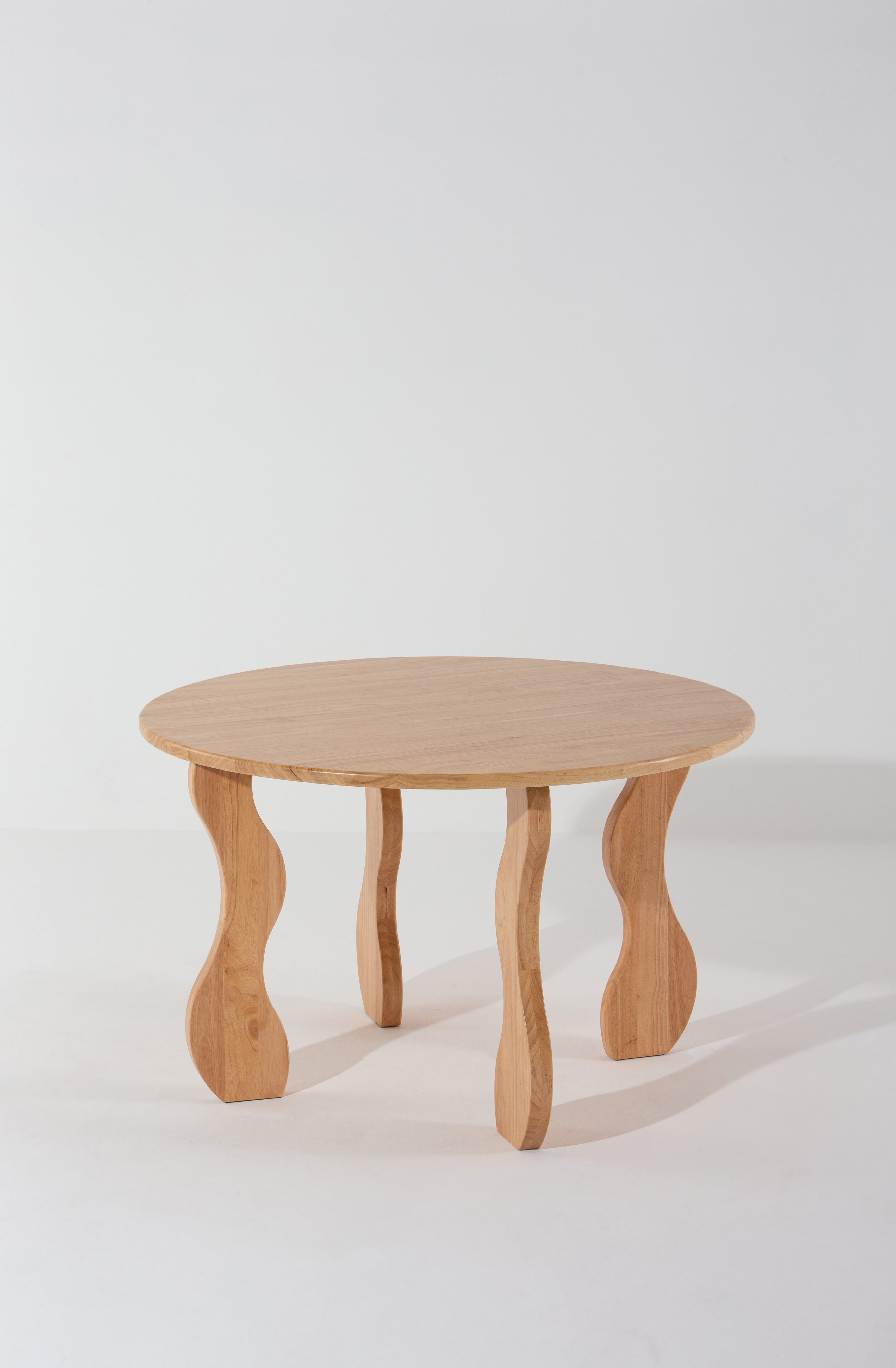 Make a statement in your dining space with this sculptural wooden dining table. Its round tabletop offers a smooth, natural finish, beautifully showcasing the organic wood grain. The standout feature? Bold, curved legs that add a touch of artistic flair while ensuring sturdy support. Whether hosting guests or enjoying a quiet meal, this table blends modern elegance with a timeless appeal. Perfect for contemporary, Scandinavian, or rustic interiors, it effortlessly becomes the focal point of any dining room.