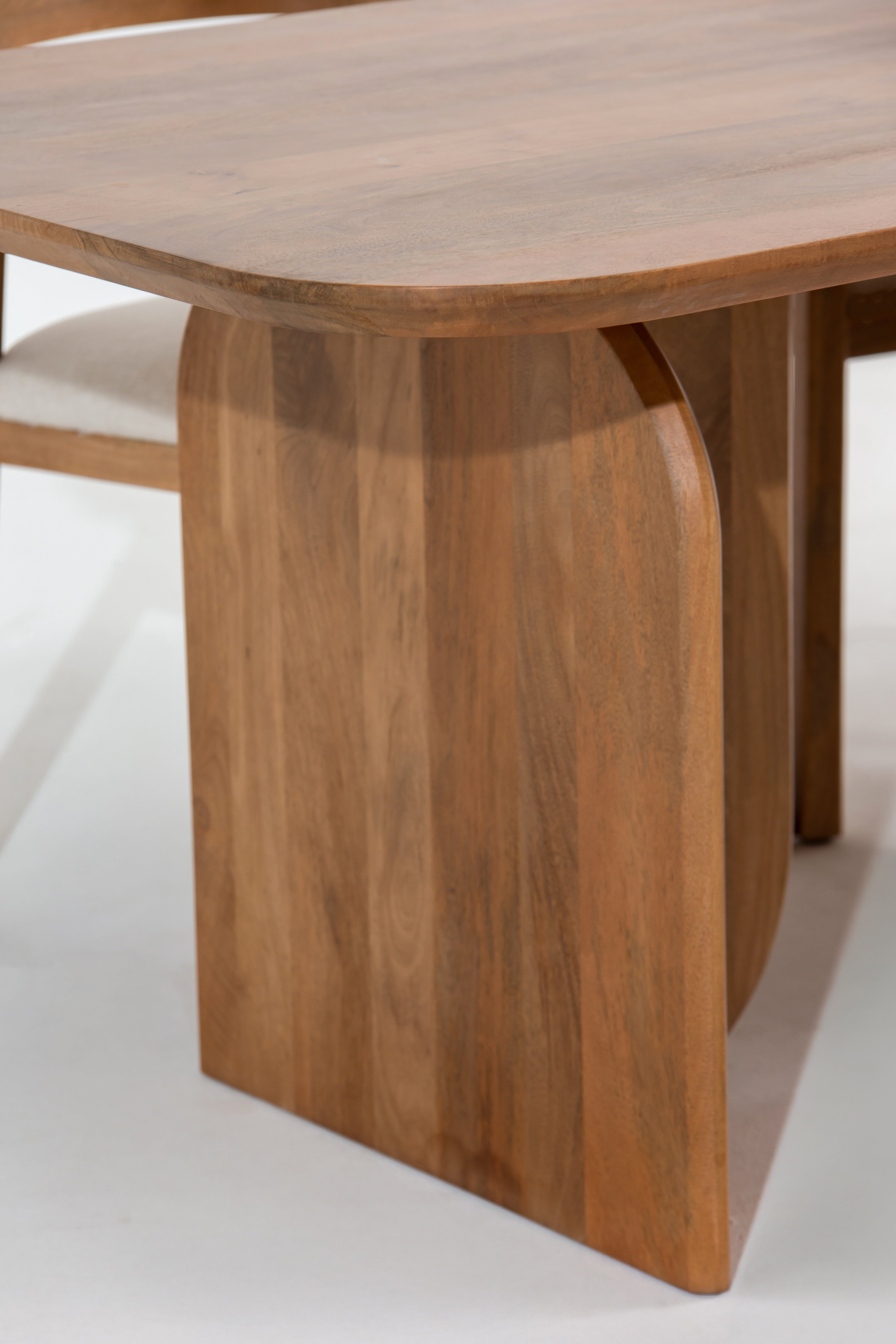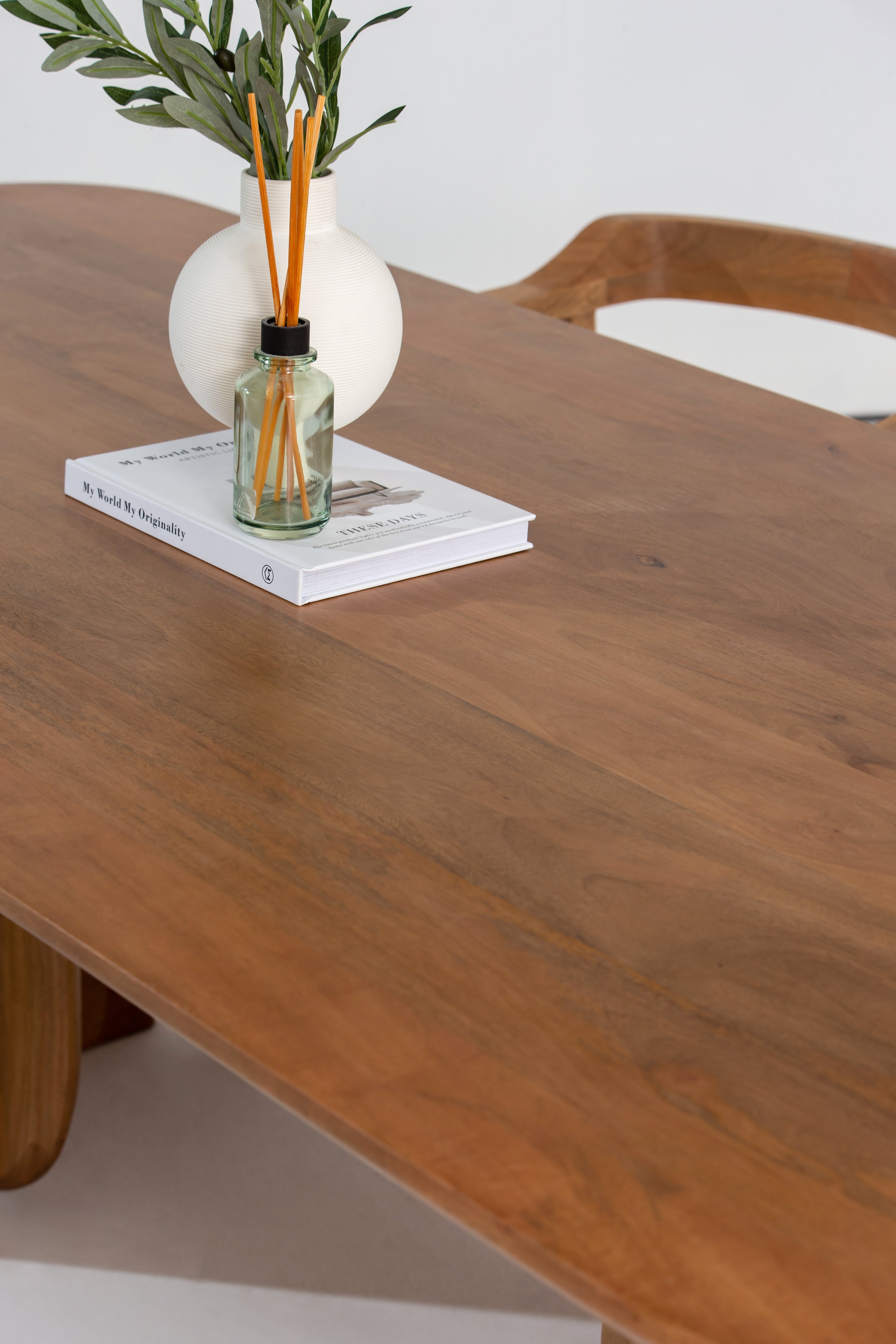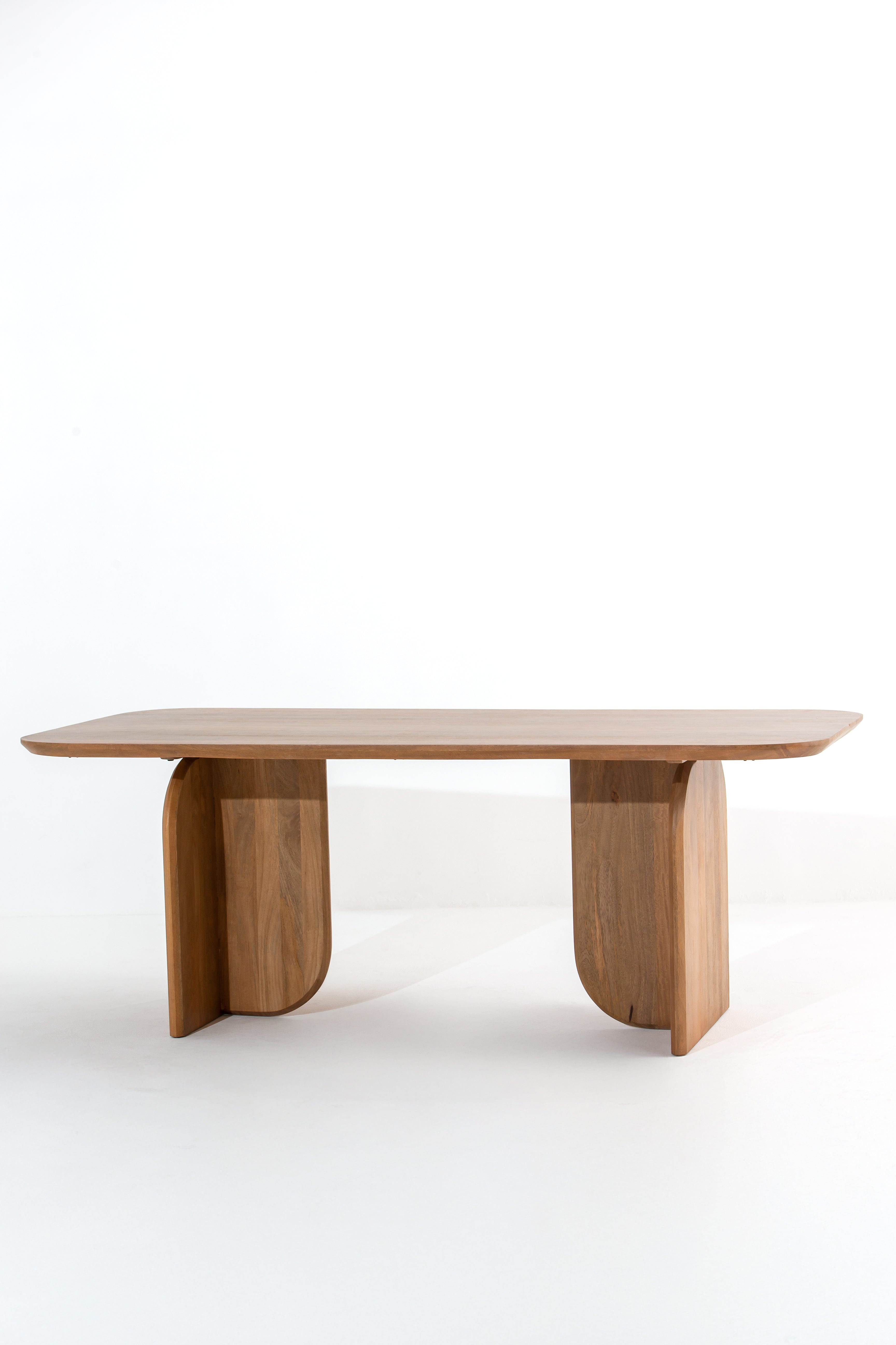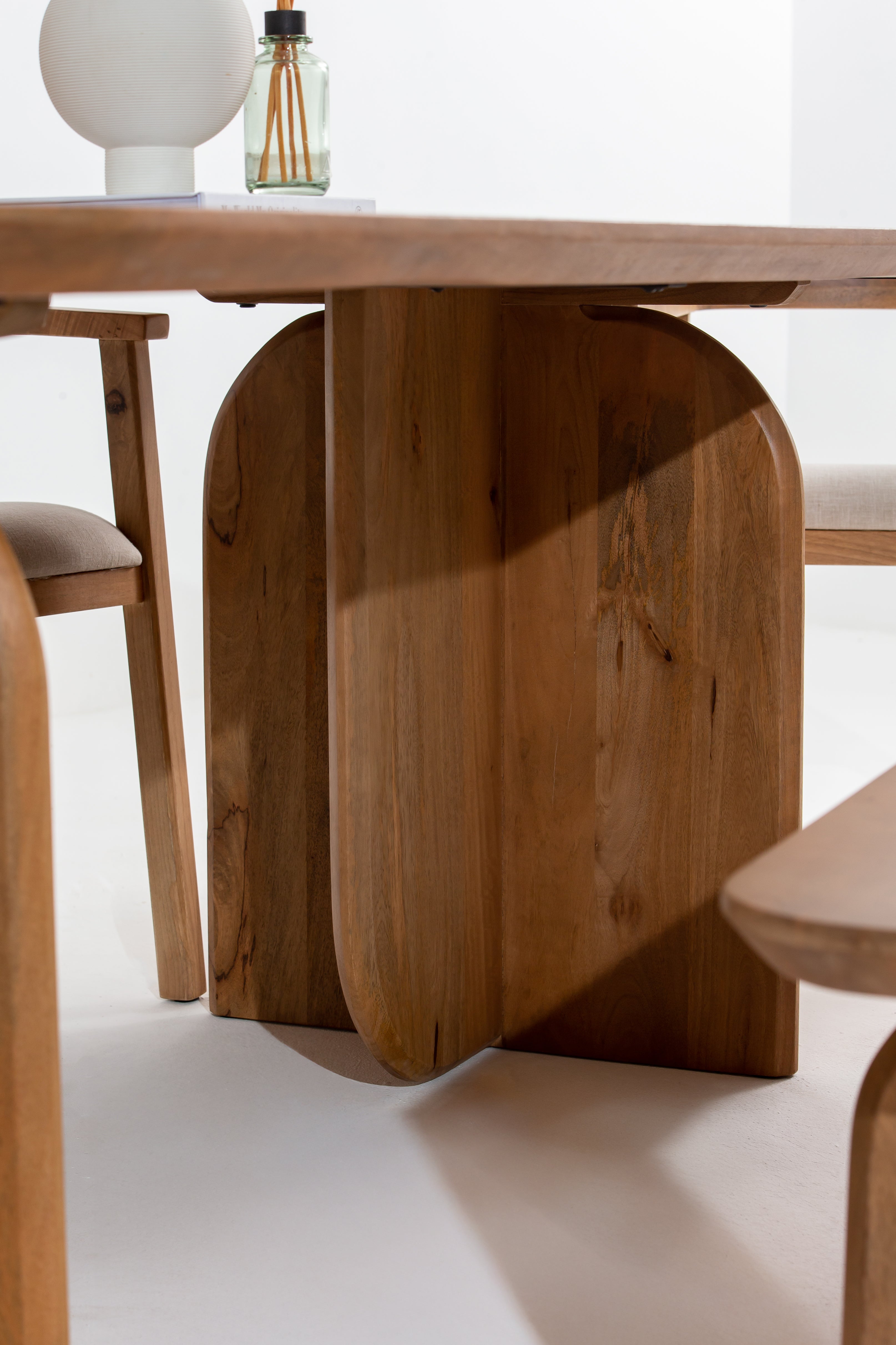 Elevate your dining experience with this exquisitely crafted solid mindi wood dining table, designed to merge sculptural form with timeless function. Featuring gracefully rounded edges and distinctive dual pedestal bases, this table offers a modern interpretation of organic minimalism. The rich texture and warm tone of the mindi wood highlight its natural grain, bringing earthy elegance into any dining setting. Ideal for both casual family meals and stylish dinner parties, this statement piece complements a range of interiors—from Scandinavian and Japandi to rustic contemporary. Whether paired with matching benches or upholstered chairs, it effortlessly transforms your space into a welcoming gathering spot.
