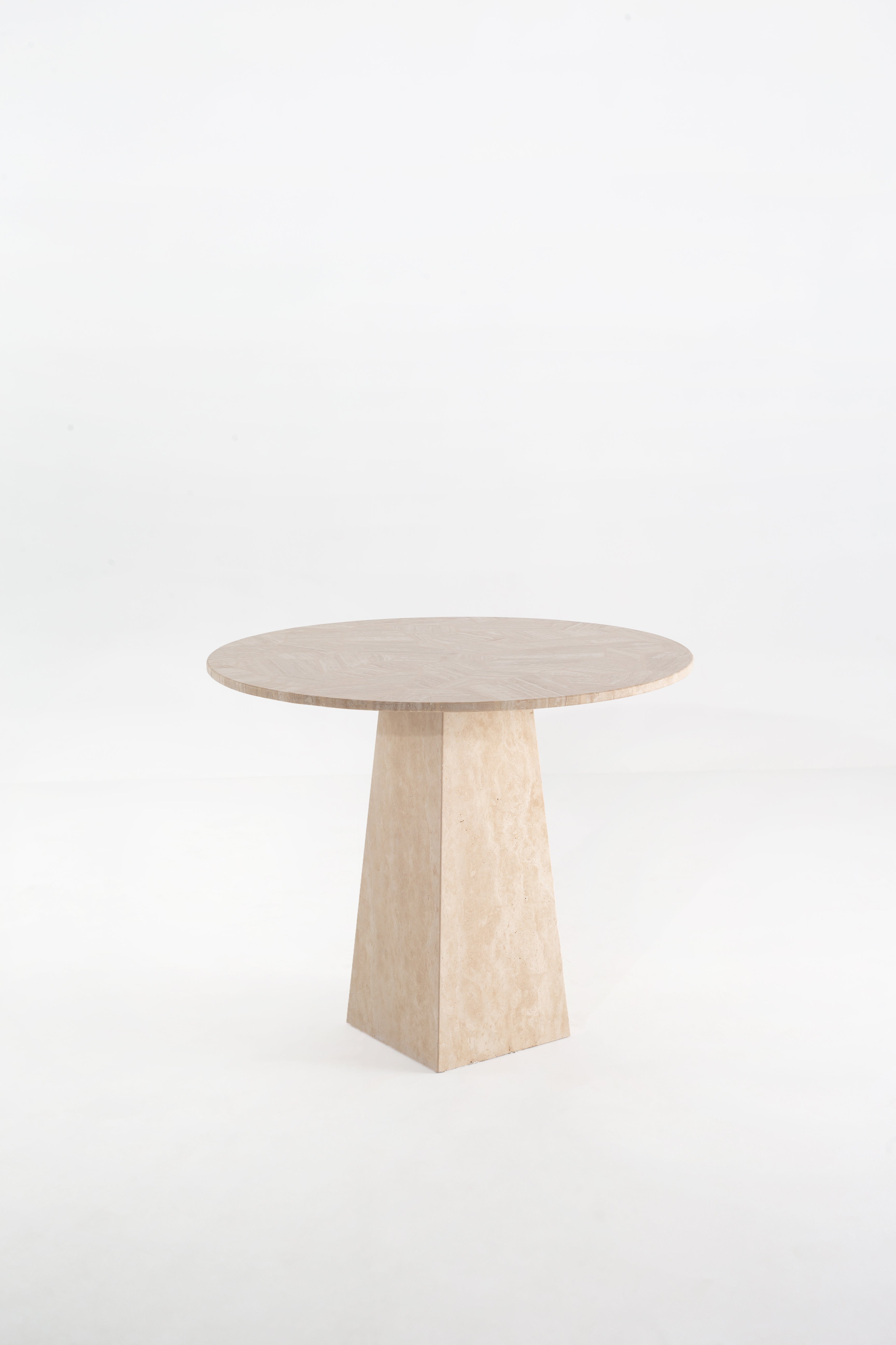 A round dining surface rests on a sculptural puzzle travertine base, creating a strong architectural presence. Natural stone texture brings warmth and visual depth. The solid form anchors the space with balance and clarity. Soft curves contrast the structured base. A refined centrepiece designed for modern dining interiors.