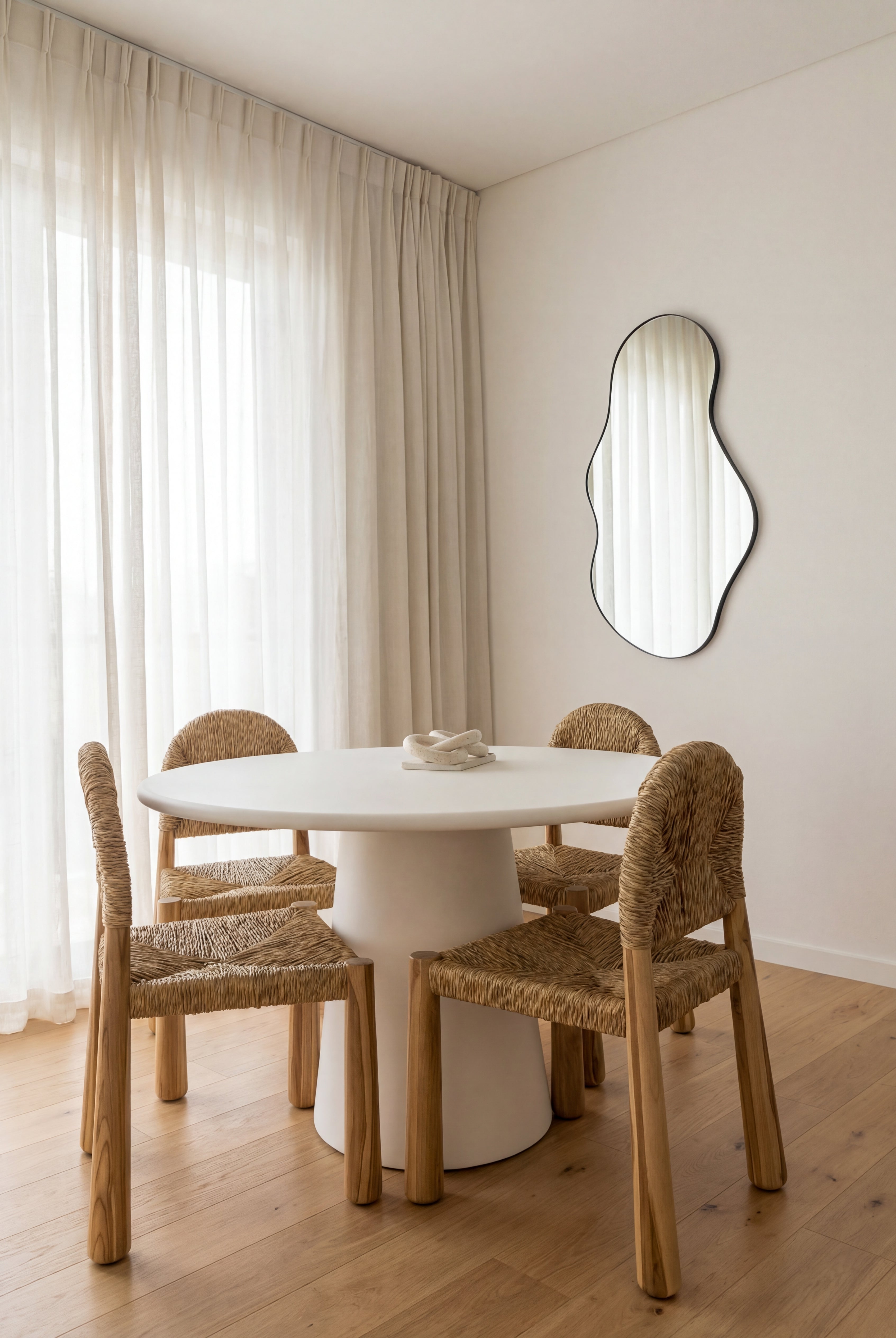 A round table is space-efficient, and at 150 centimeters in diameter, it comfortably accommodates six diners. Round tables can add a unique twist to the usual linear room designs, making your dining space feel warm and inviting. In contemporary kitchen settings, a round table with gentle, organic curves stands out while providing ample seating.