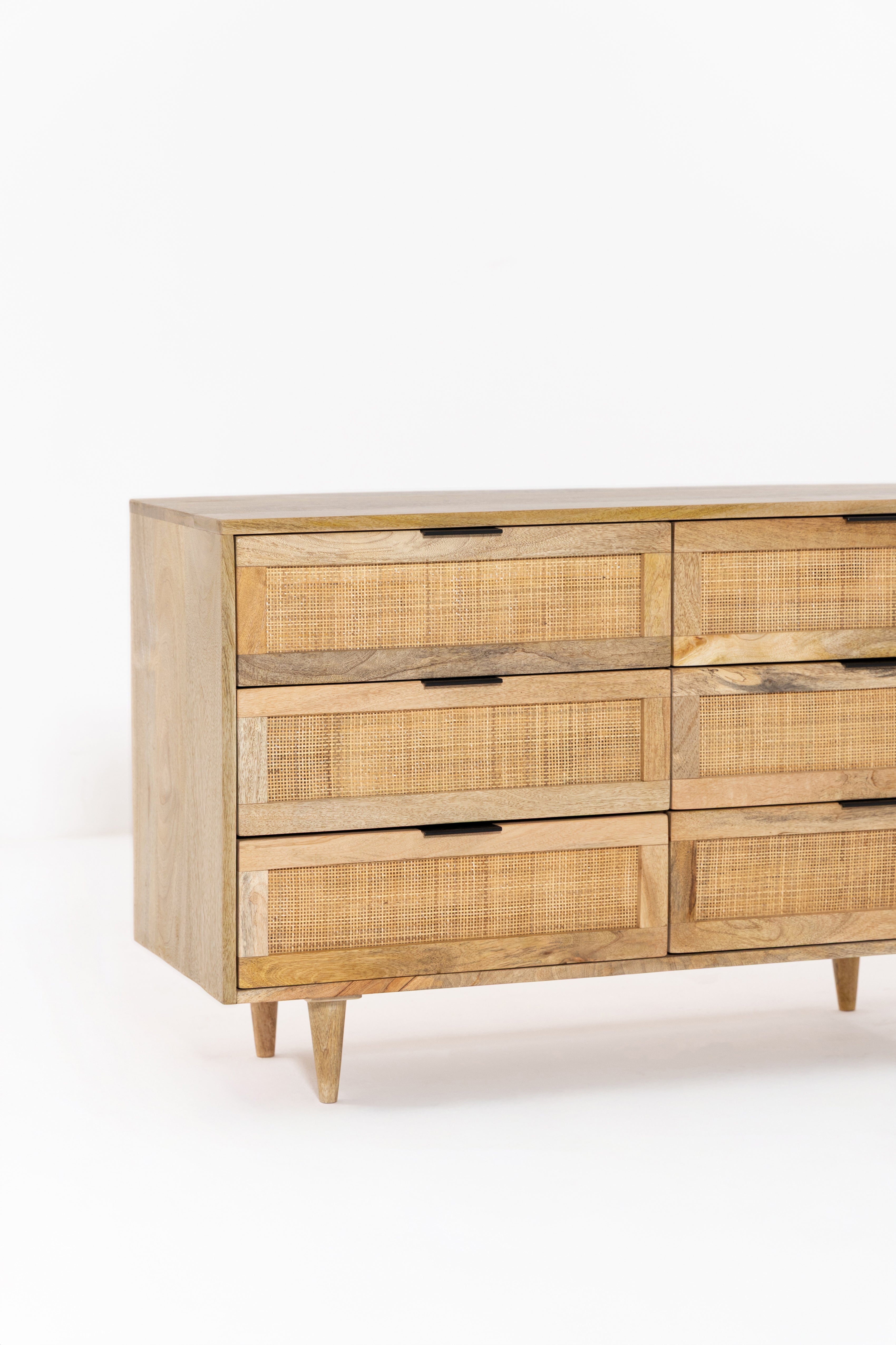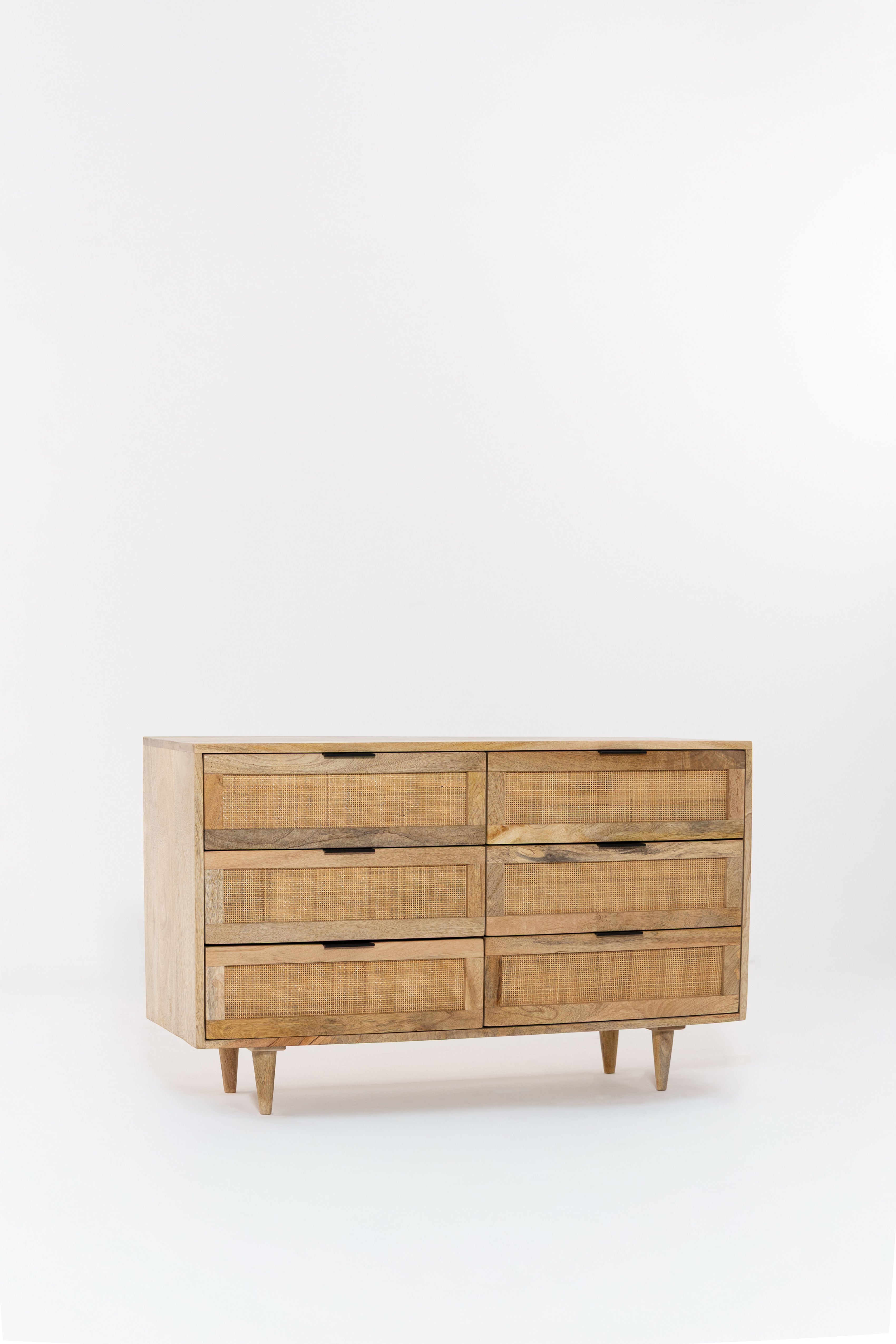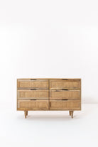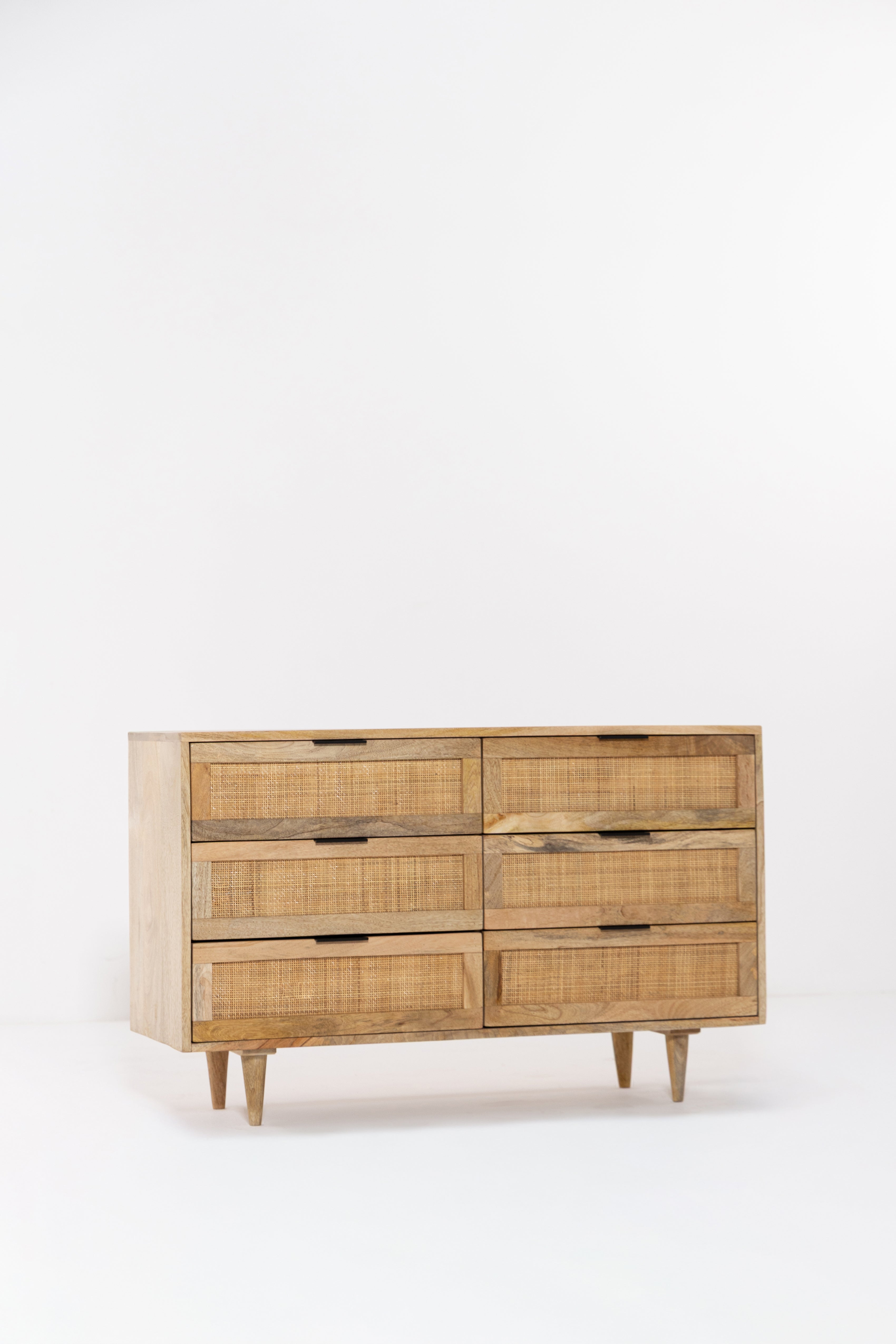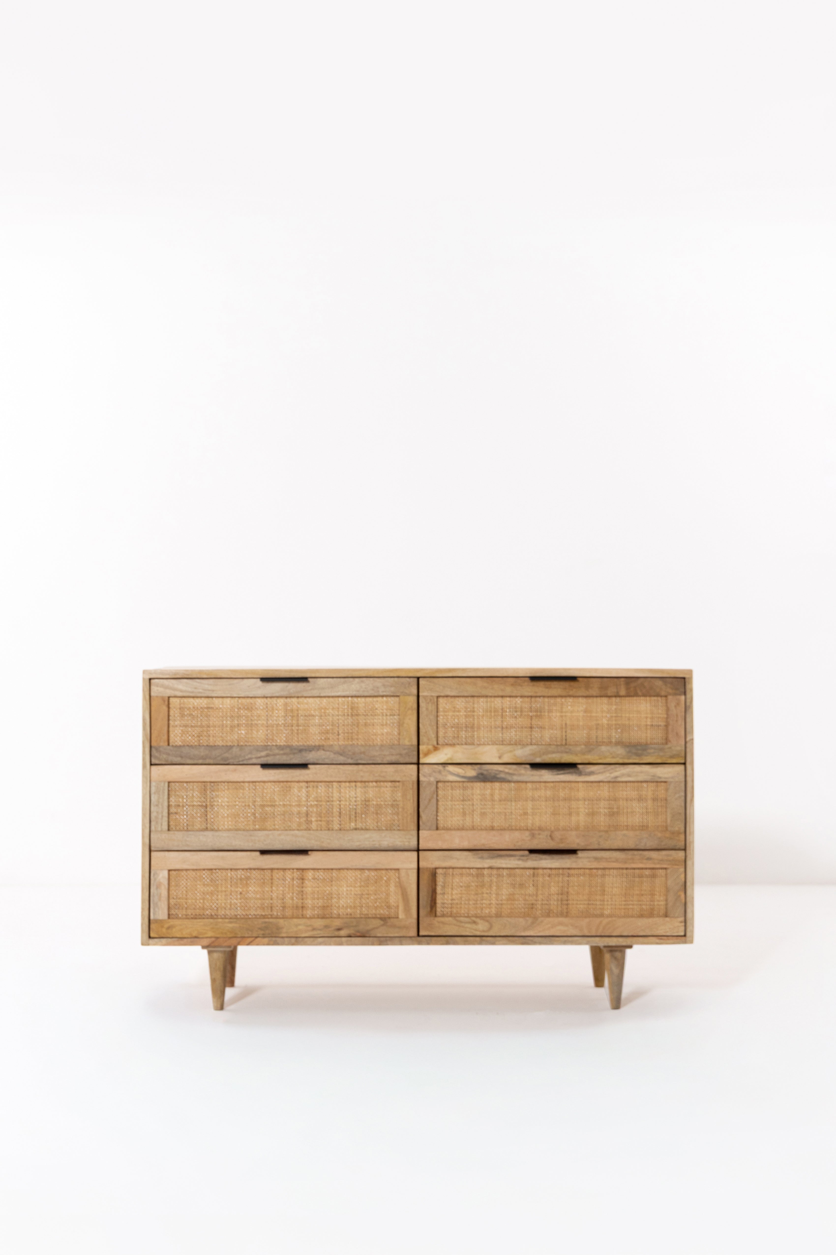 Crafted from warm solid wood with woven cane detailing, this dresser brings refined European character into the bedroom with ease. The balanced six drawer layout offers generous storage while maintaining a light and elegant presence through its tapered legs and natural textures. Designed to feel timeless yet modern, it pairs beautifully with calm interiors that value craftsmanship, warmth, and effortless organization.