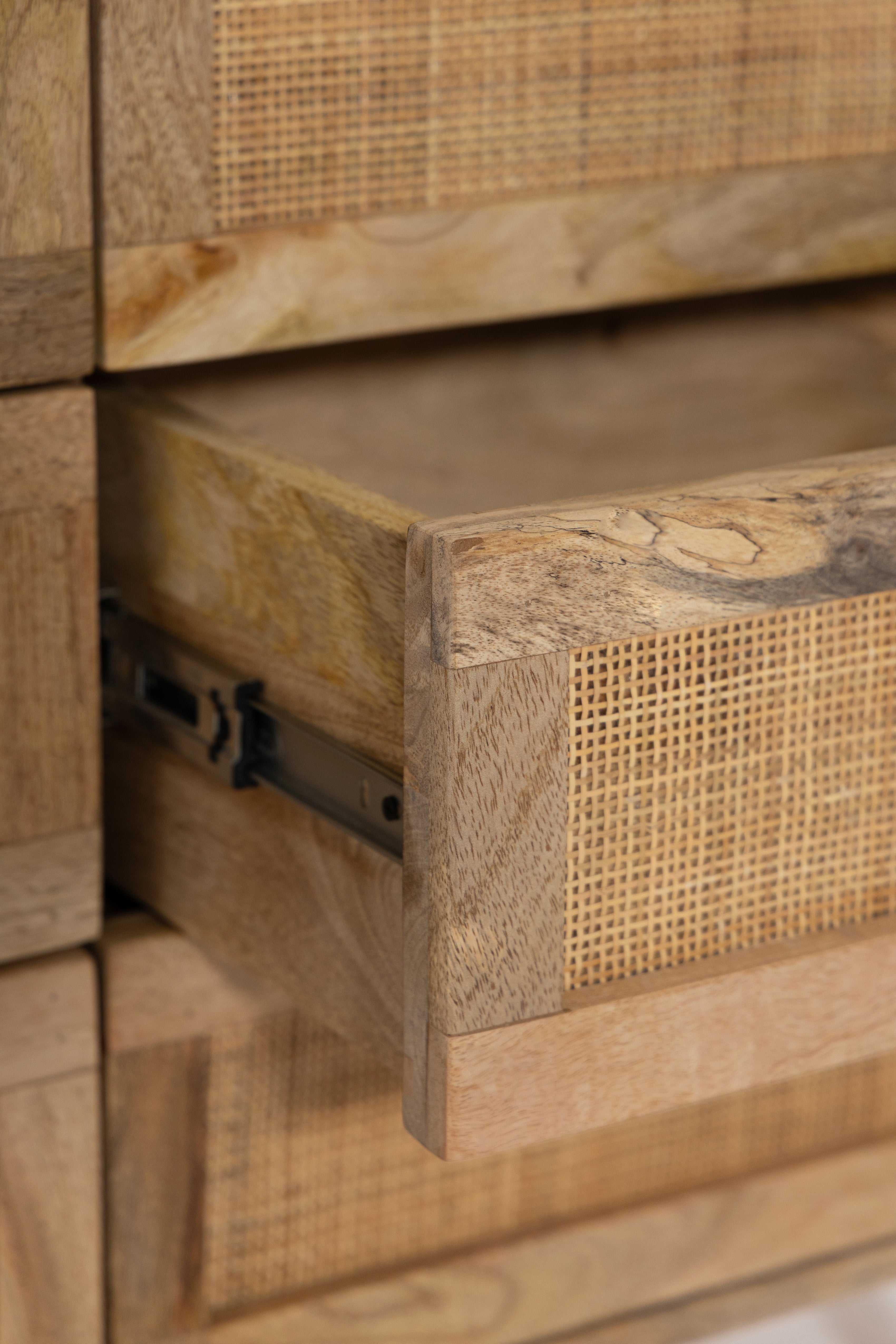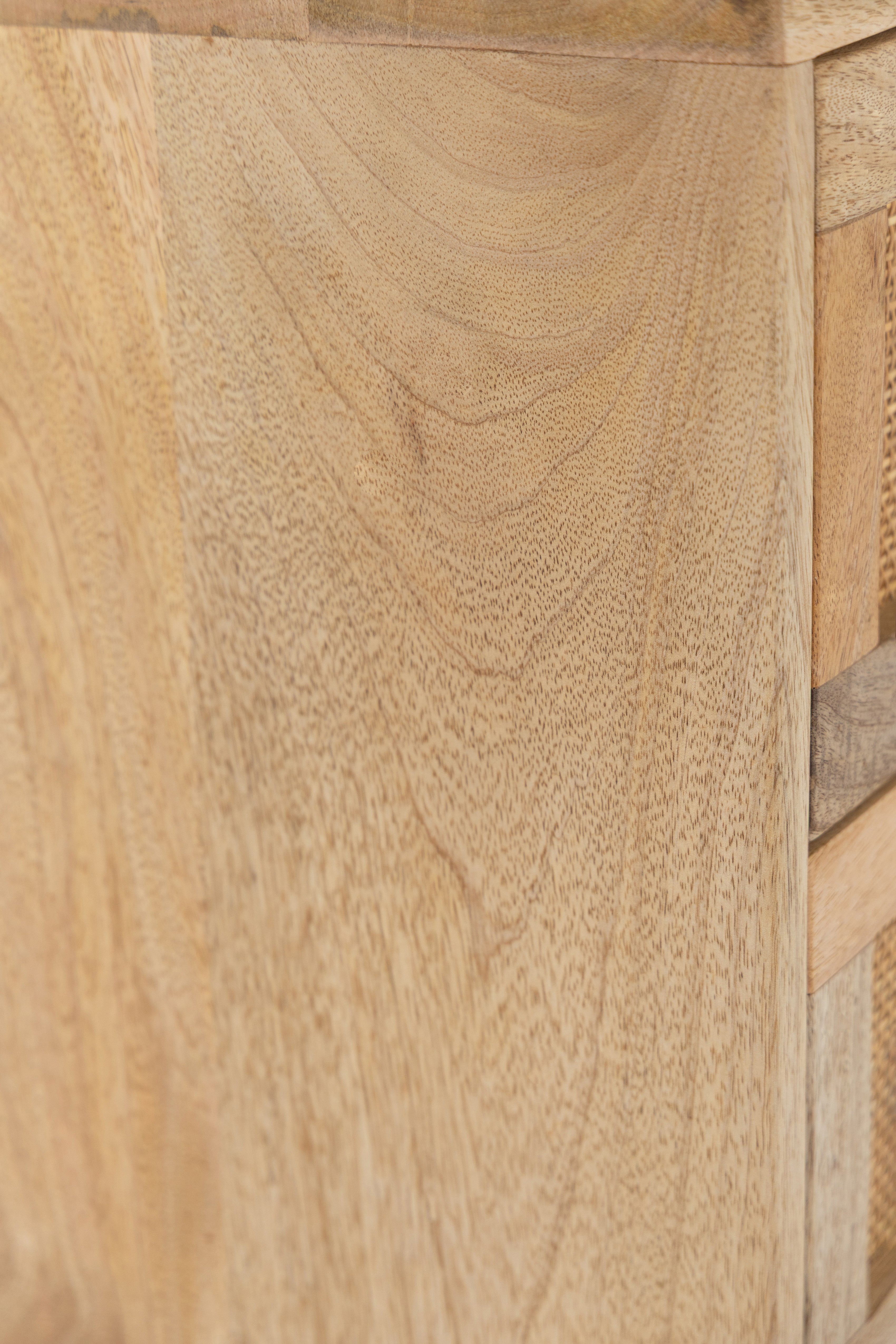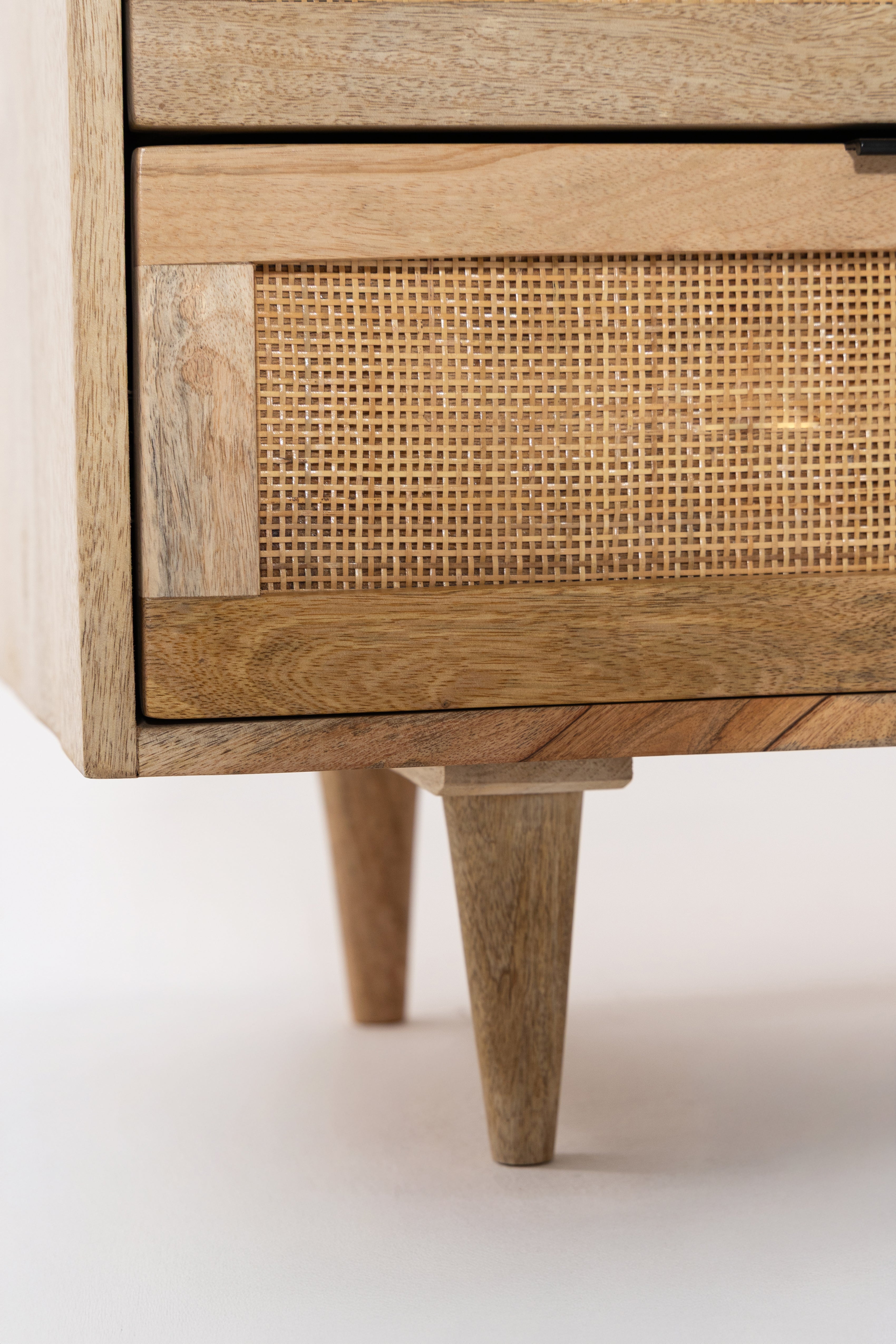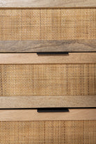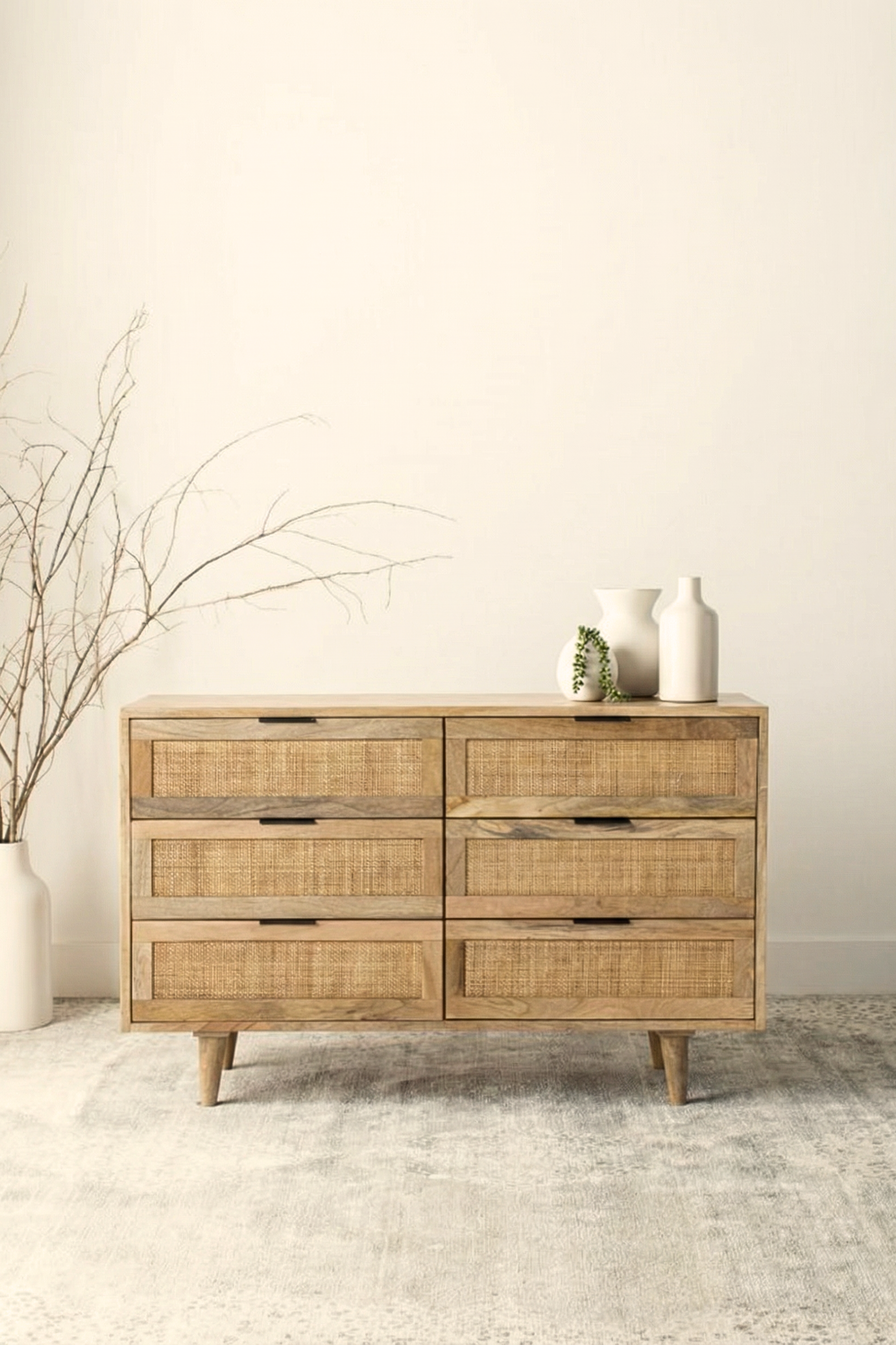 Crafted from warm solid wood with woven cane detailing, this dresser brings refined European character into the bedroom with ease. The balanced six drawer layout offers generous storage while maintaining a light and elegant presence through its tapered legs and natural textures. Designed to feel timeless yet modern, it pairs beautifully with calm interiors that value craftsmanship, warmth, and effortless organization.