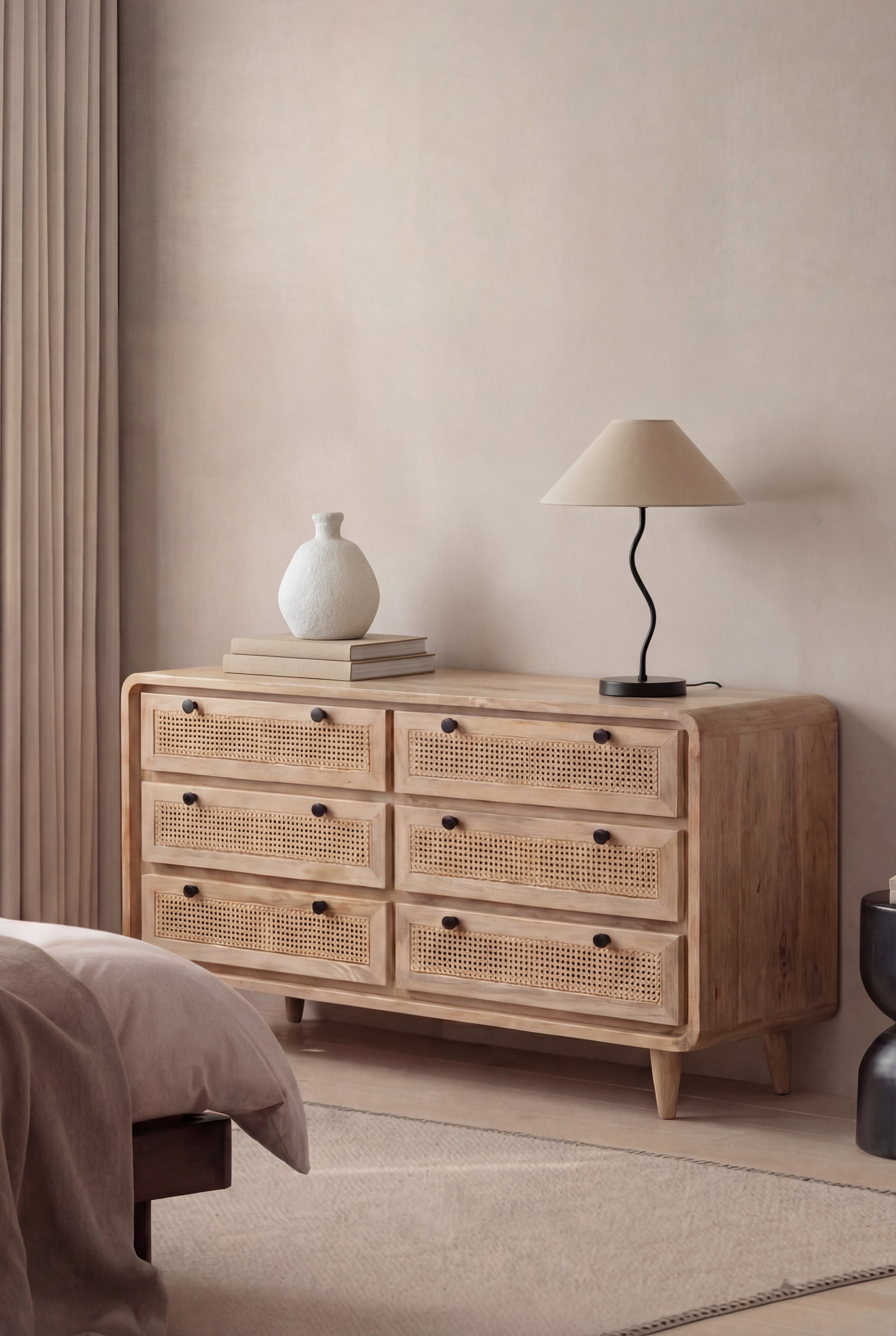 Expertly crafted from solid mango wood, this dresser blends natural warmth with airy rattan detailing for a refined yet relaxed bedroom statement. Six generously sized drawers feature handwoven cane panels that introduce texture and lightness, while sleek black knobs add a subtle modern contrast. The softly curved frame and tapered legs create a graceful silhouette that feels both timeless and contemporary. Designed for those who value elevated storage with organic character, it brings effortless sophistication and serene balance to your space.