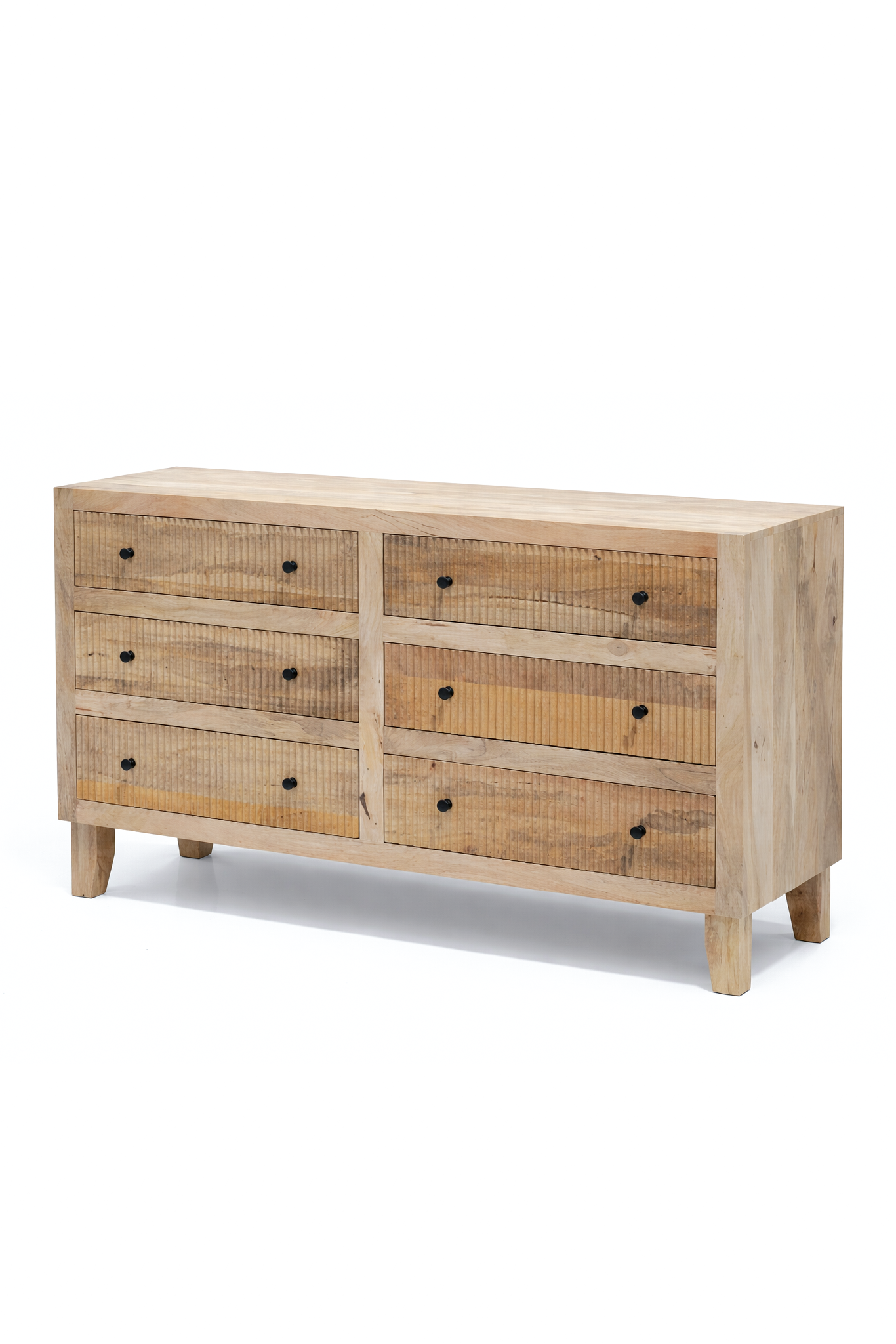 Crafted from solid mango wood, this dresser showcases natural grain variations that make every piece beautifully unique. The vertically textured drawer fronts add subtle dimension, while sleek black knobs introduce a refined modern contrast. With six spacious drawers, it offers generous storage to keep your bedroom effortlessly organized and serene. Elevated on sturdy legs, its clean silhouette blends warmth and structure, creating a timeless statement that enhances your everyday living experience.