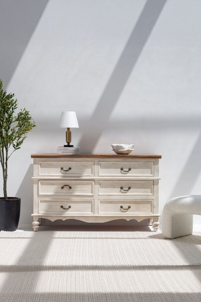 Elevate your bedroom with our stunning 6-drawer mango wood dresser, featuring a timeless Victorian design and a fresh white painted finish. Crafted from high-quality mango wood, this dresser is not only beautiful but also durable and sustainable. The six spacious drawers provide ample storage for your clothes, accessories, and other essentials, helping you keep your space organized and clutter-free. Whether you're looking to add a touch of elegance to your bedroom or complement your Victorian-inspired decor, this dresser is the perfect choice. Upgrade your bedroom with this stylish and functional piece today.