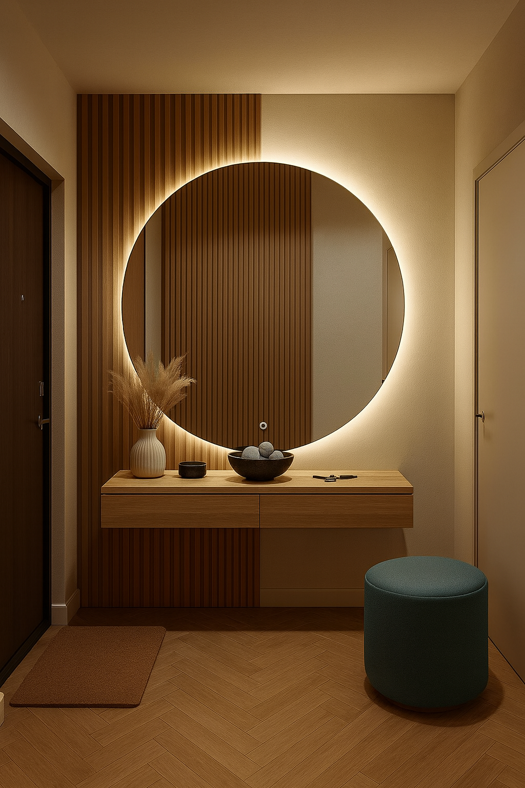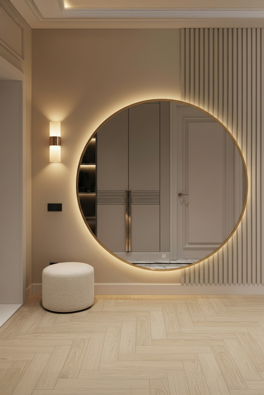 A bold statement in refined simplicity, this 150CM XL round mirror transforms any space with its sleek design and soft LED illumination. Framed by a subtle yet striking glow, it enhances depth and light while creating a luxurious ambiance. Perfect for entryways, living rooms, or bedrooms, this mirror merges function with aesthetic appeal, making it an elegant centerpiece for modern interiors.