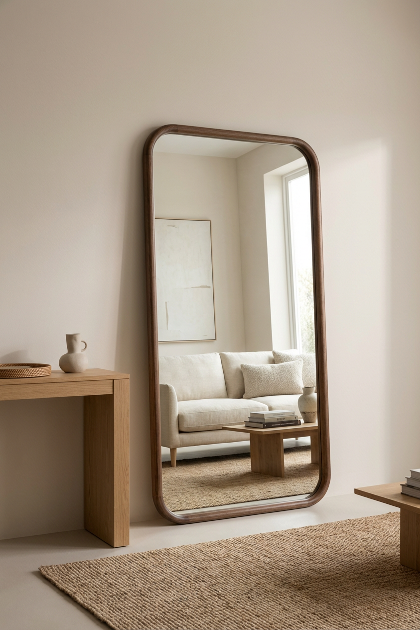 This rectangular mirror brings warmth and understated elegance to your space through its softly rounded wood frame and natural finish. Designed to enhance light and create a sense of openness, it blends seamlessly into serene bedrooms, living areas, or entryways while complementing neutral palettes and organic textures. Its timeless silhouette and warm tones add depth and balance, making it an effortless accent that elevates everyday interiors with quiet sophistication.