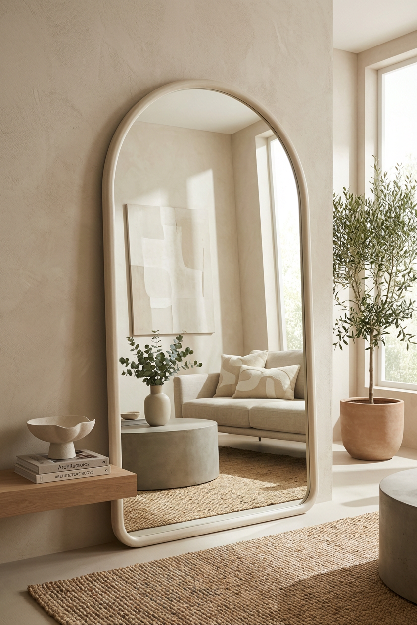This softly arched statement piece brings an effortless sense of calm to any room, reflecting light with a warm off white frame that feels sculptural yet serene. Its graceful curve elevates both intimate corners and spacious interiors while blending naturally with neutral palettes, organic textures, and botanical styling. Crafted for those who seek quiet luxury, it creates an inviting sense of openness that transforms the atmosphere with refined simplicity.