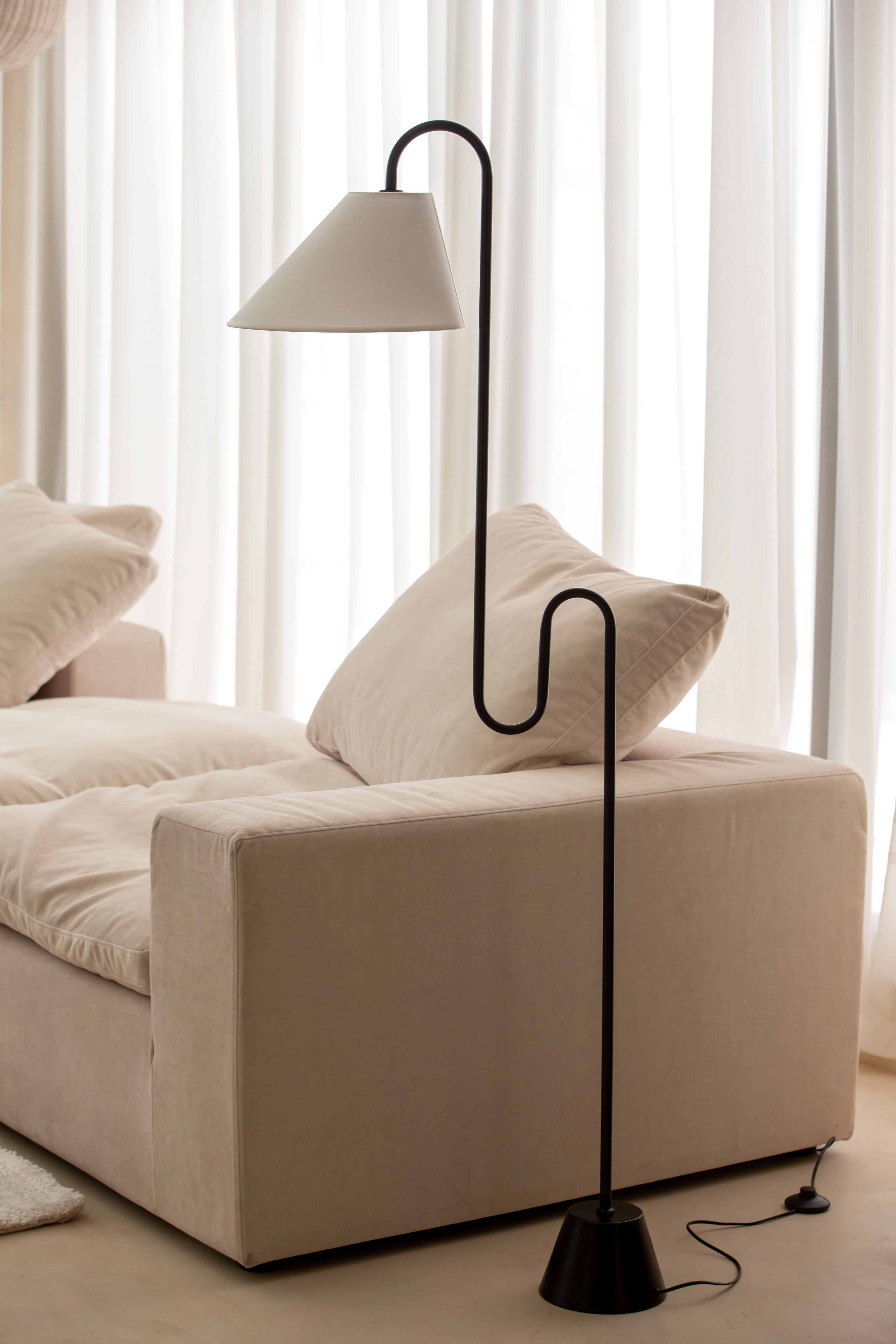 Introducing the Arcadia Floor Lamp—a striking blend of contemporary design and functional elegance. Crafted with a sleek black metal frame, this floor lamp features a graceful, curved silhouette that adds an artistic touch to any room. The conical fabric shade casts a warm, inviting glow, making it perfect for reading nooks or living spaces that require both style and substance.