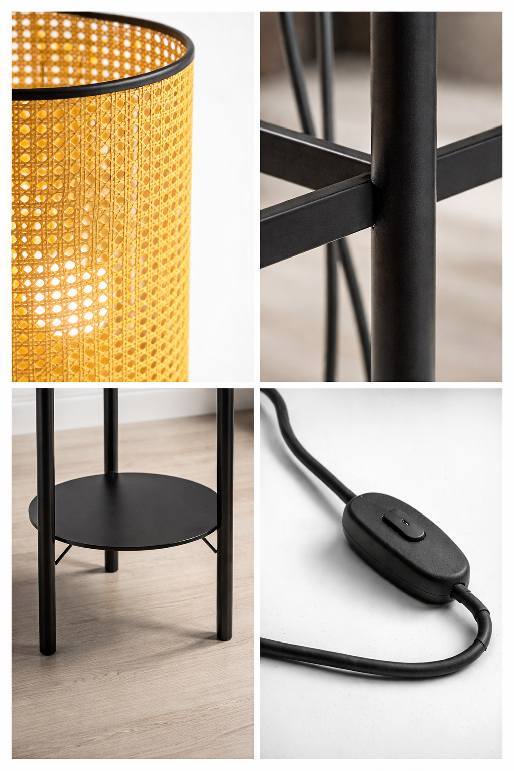 A refined statement piece with a relaxed, natural touch, this floor lamp blends a woven cane-style shade with a sleek black frame for a look that feels modern yet warmly organic. The open weave creates a beautiful play of light and shadow, while the inner diffuser softens the glow for a cozy, inviting ambience in living rooms, bedrooms, and reading corners.