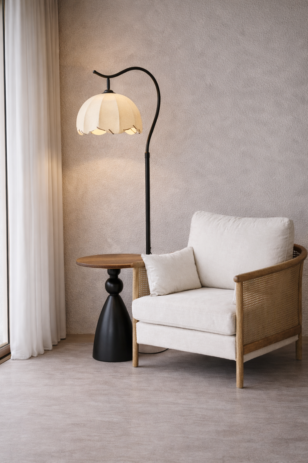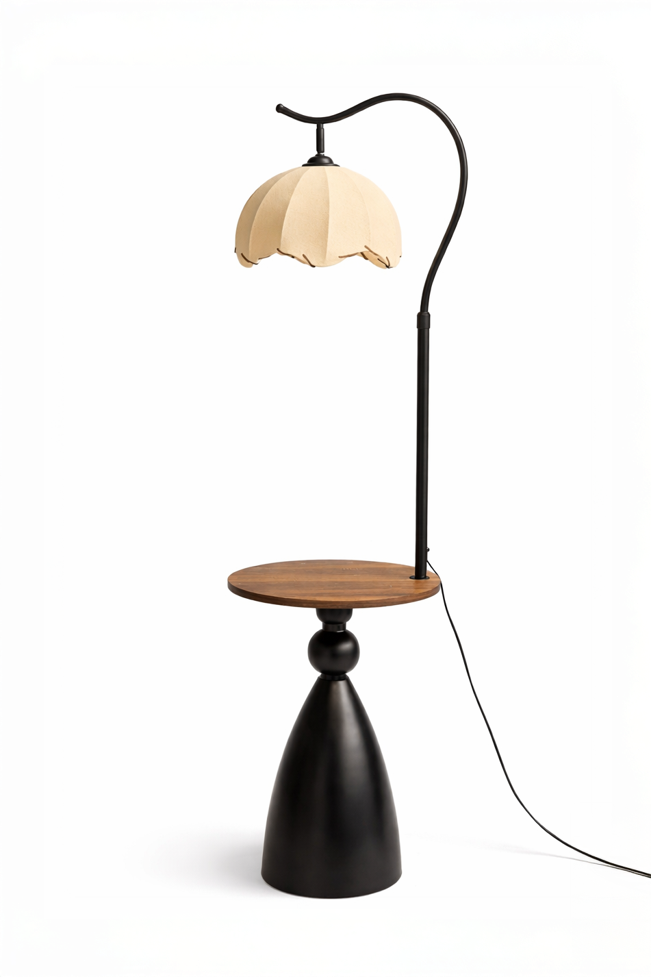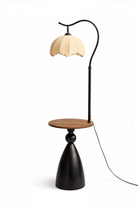 A bold yet refined accent for modern interiors, this black wooden floor lamp blends sculptural form with warm ambient lighting. Its curved arm silhouette adds a distinctive designer touch, while the pleated shade softly diffuses light for a cozy glow in living rooms, bedrooms, and reading corners. The deep black finish creates striking contrast against light neutrals and natural textures, and the built in round tabletop offers a practical surface for styling candles, books, or your evening drink. Elegant and functional, it brings a curated European inspired feel that instantly elevates your space.