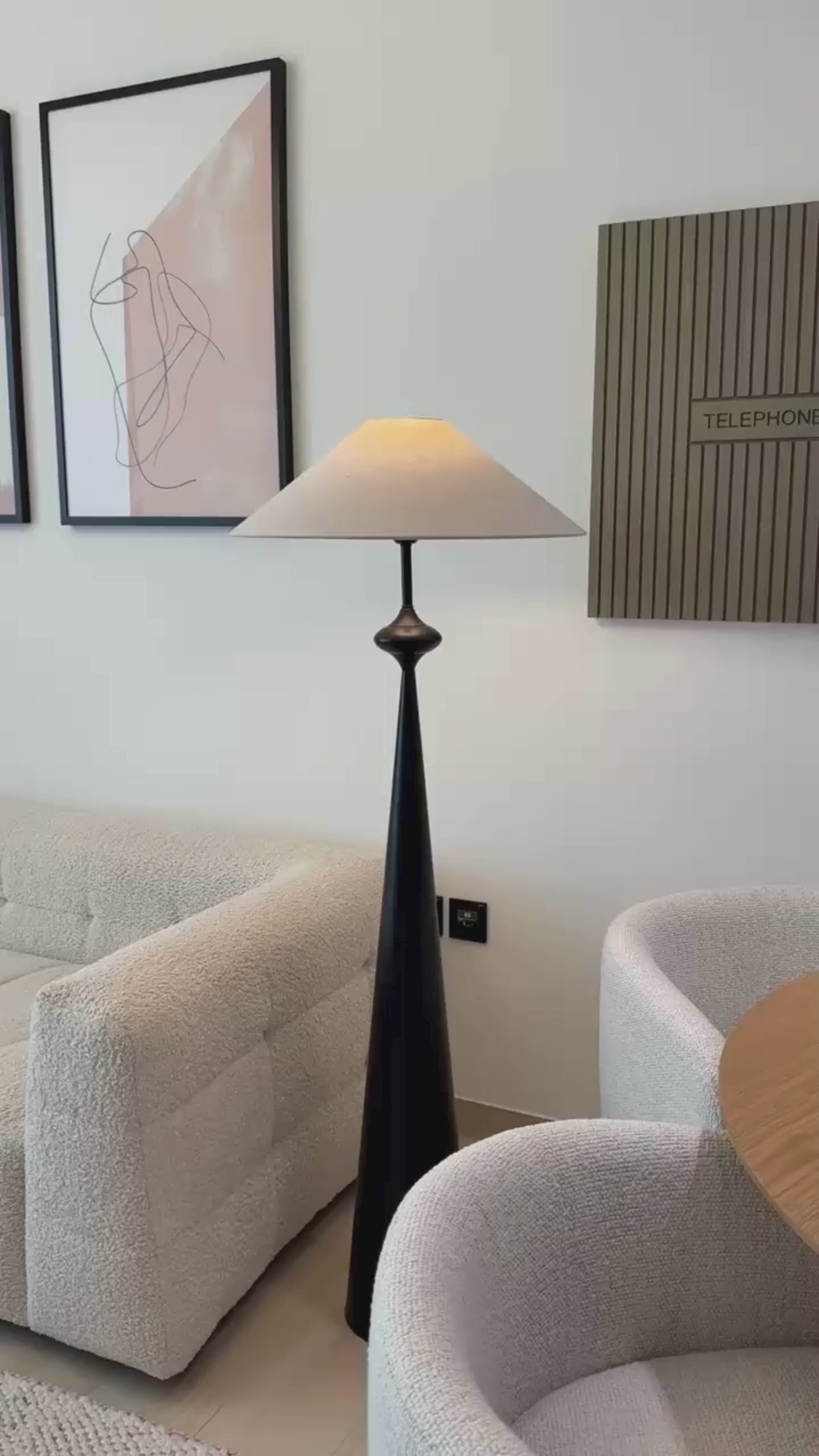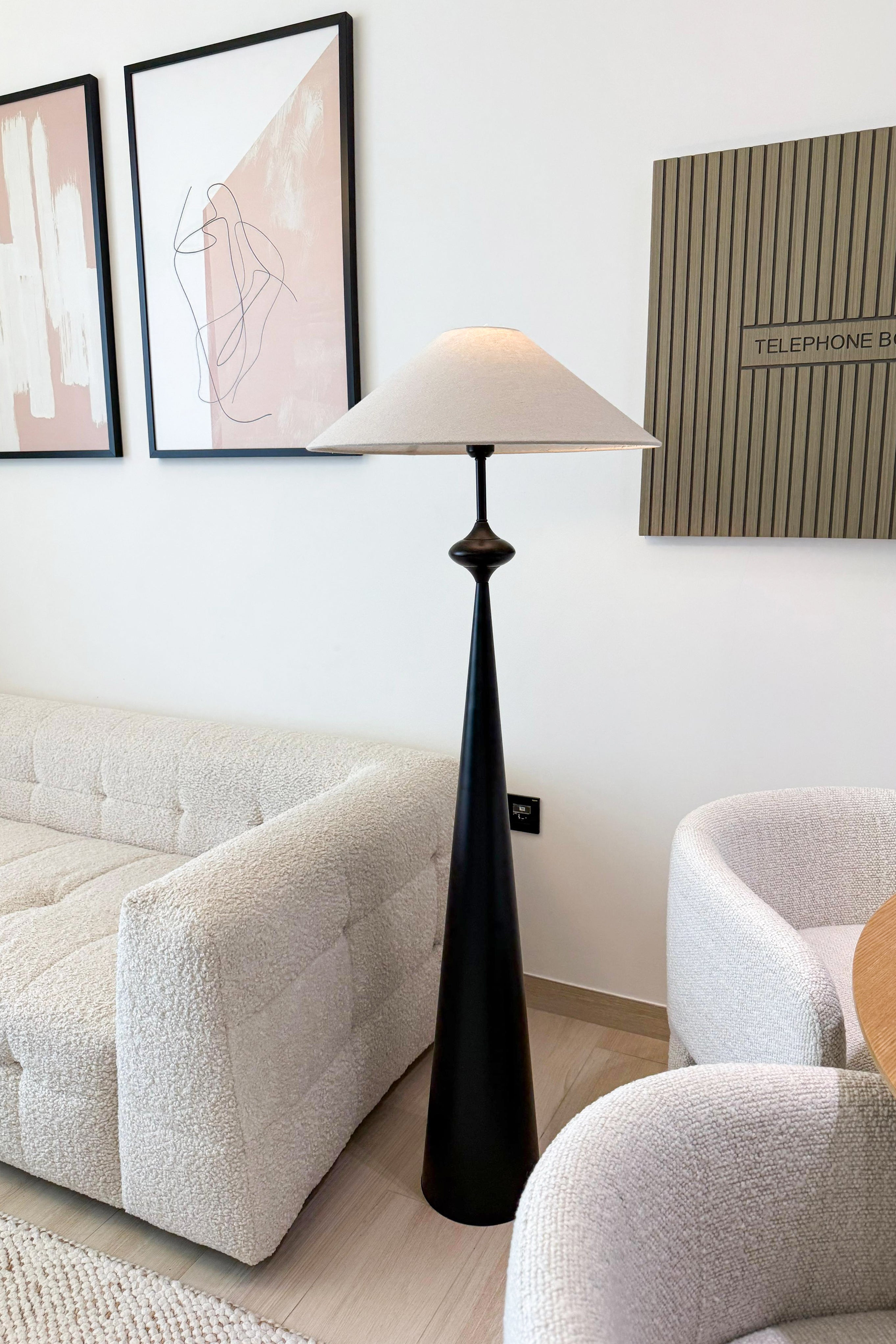 A striking blend of geometry and elegance, the Orpheus Floor Lamp stands tall with its sleek conical base in a deep matte black finish. Topped with a wide linen shade, it casts a warm, diffused glow, perfect for refined interiors. A sculptural brass accent adds a touch of vintage charm, making this lamp a statement piece for living rooms, bedrooms, or reading corners. Designed for modern spaces with timeless appeal.