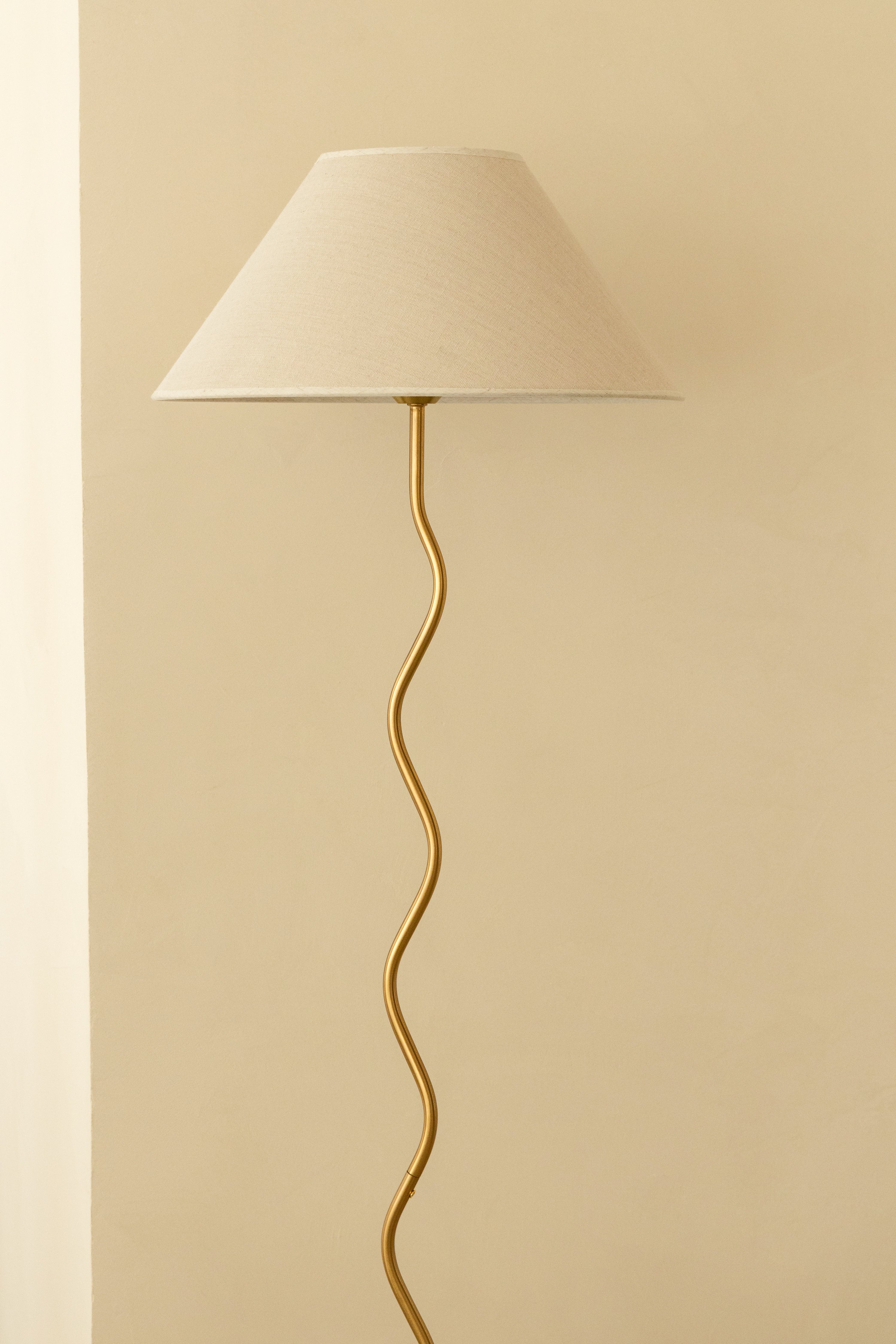 Illuminate your space with the SineWave Gold Base Floor Lamp—a sculptural lighting piece that blends luxury with modern design. Its sinuous, wave-like metal stem rises from a polished gold base, creating a dynamic silhouette that commands attention. The wide, conical fabric lampshade softly diffuses light, casting a warm, ambient glow ideal for living rooms, lounges, or reading corners. The smooth gold finish adds a touch of glamour, while the organic curves bring artistic flair and balance. Whether styled in a contemporary, minimalist, or transitional interior, you become the curator of sophistication with this elegant floor lamp that effortlessly elevates your home.