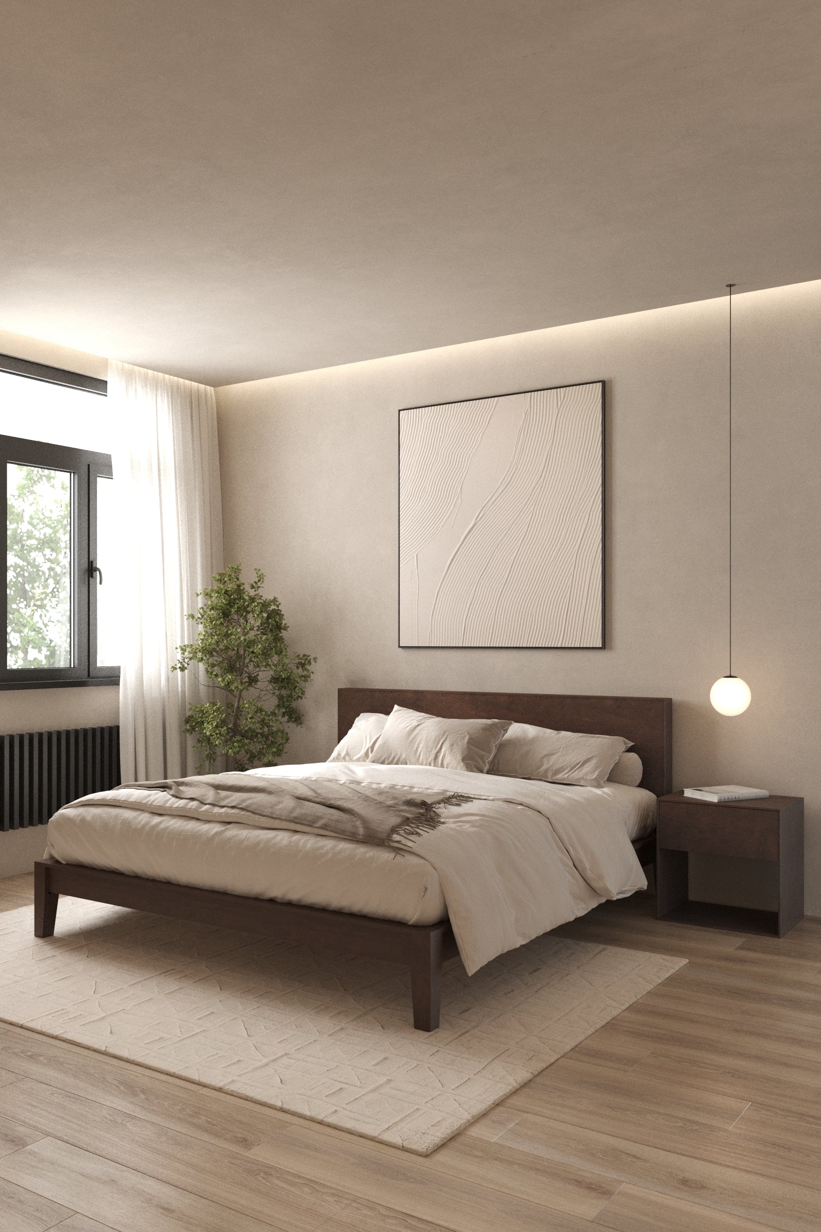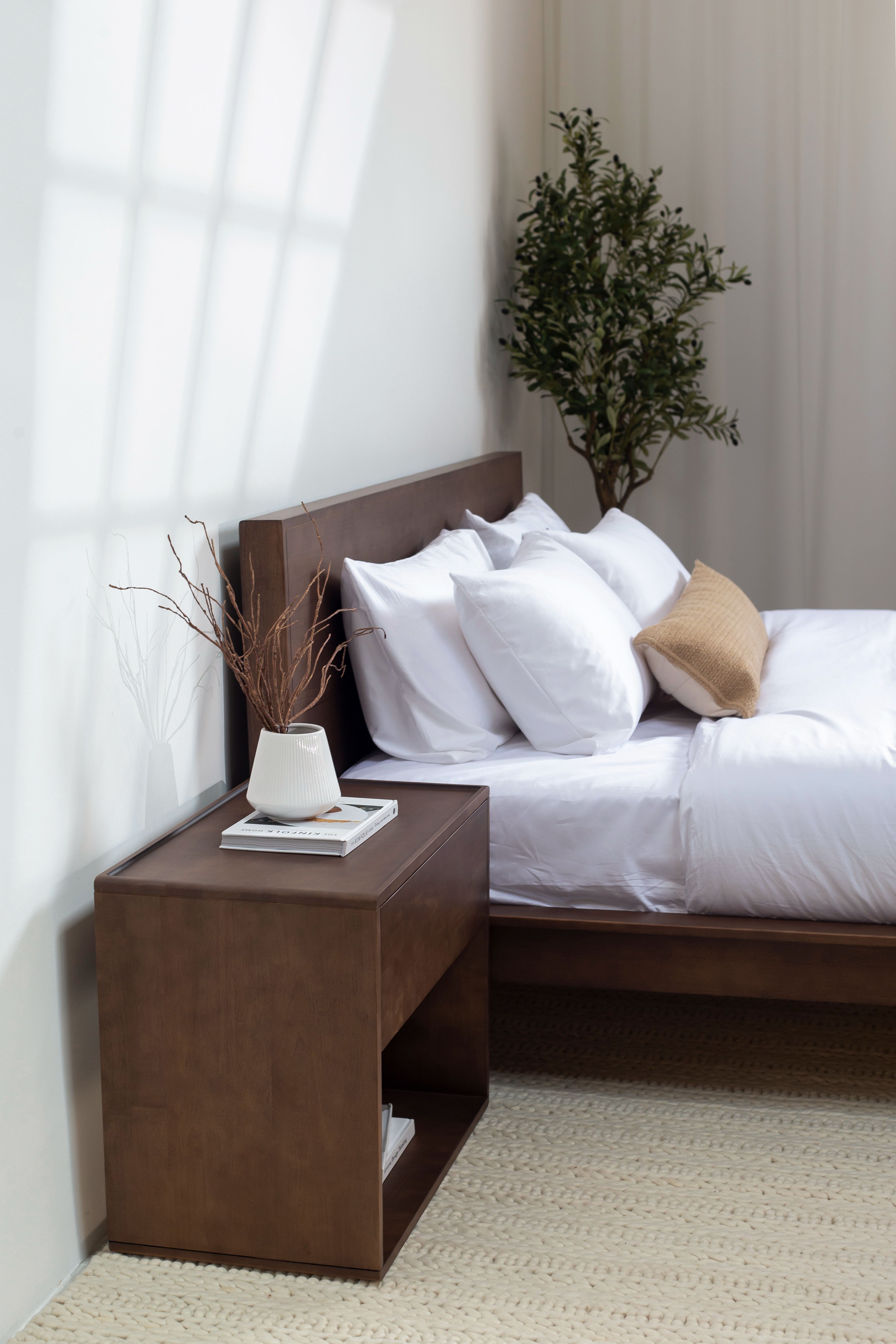 This Bed brings timeless elegance and minimalist design to your bedroom. Crafted with finger joint rubber wood and E2 plywood, its dark, rich wood tones exude warmth and sophistication. The sleek, straight-lined headboard and low-profile frame are inspired by traditional Japanese aesthetics, blending durability with understated beauty. The smooth texture and natural wood grains add depth and character, making this bed a perfect centerpiece for modern, rustic, or zen-inspired interiors. Experience the harmonious balance of style and craftsmanship with the Kohana Bed, designed to last and impress.
