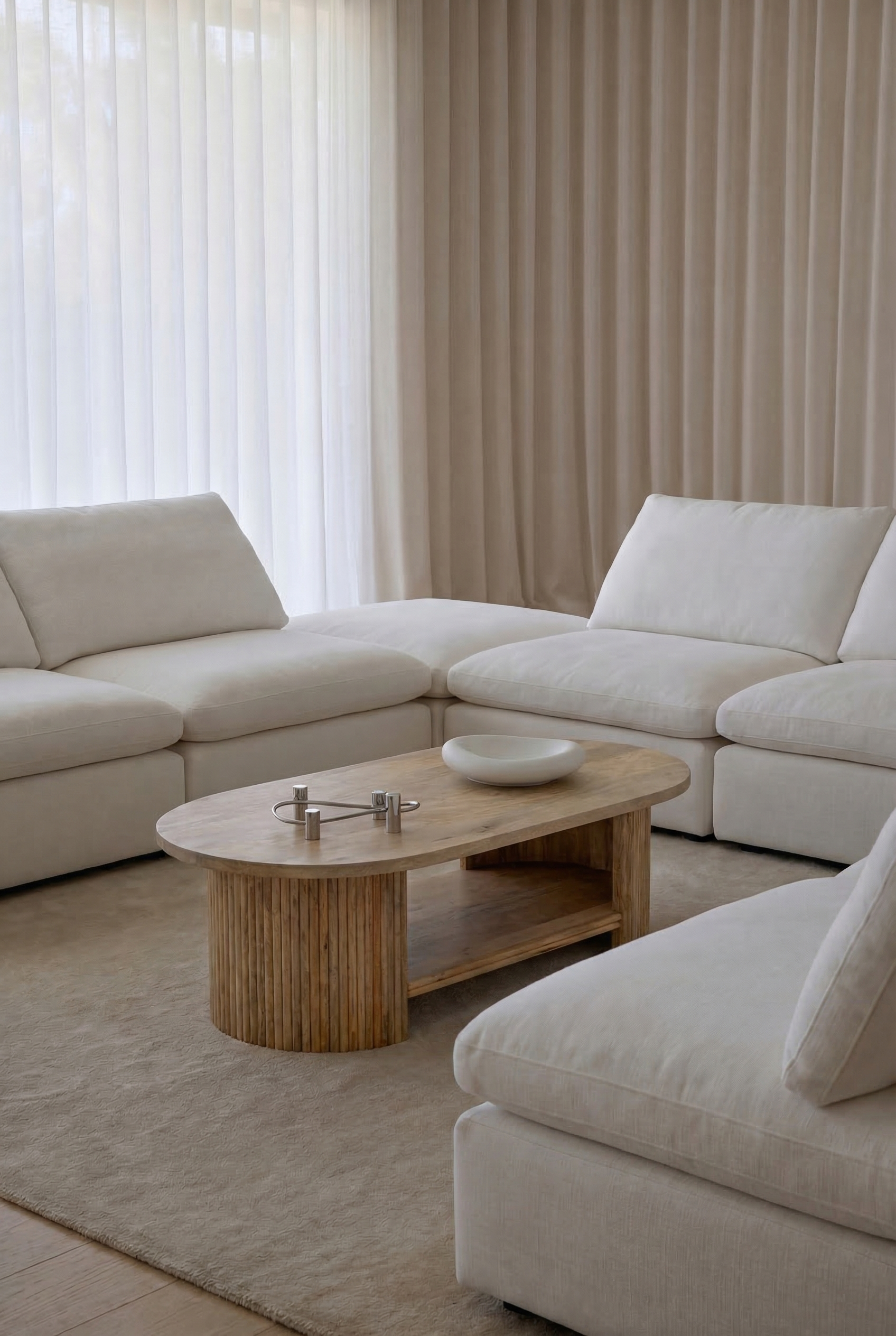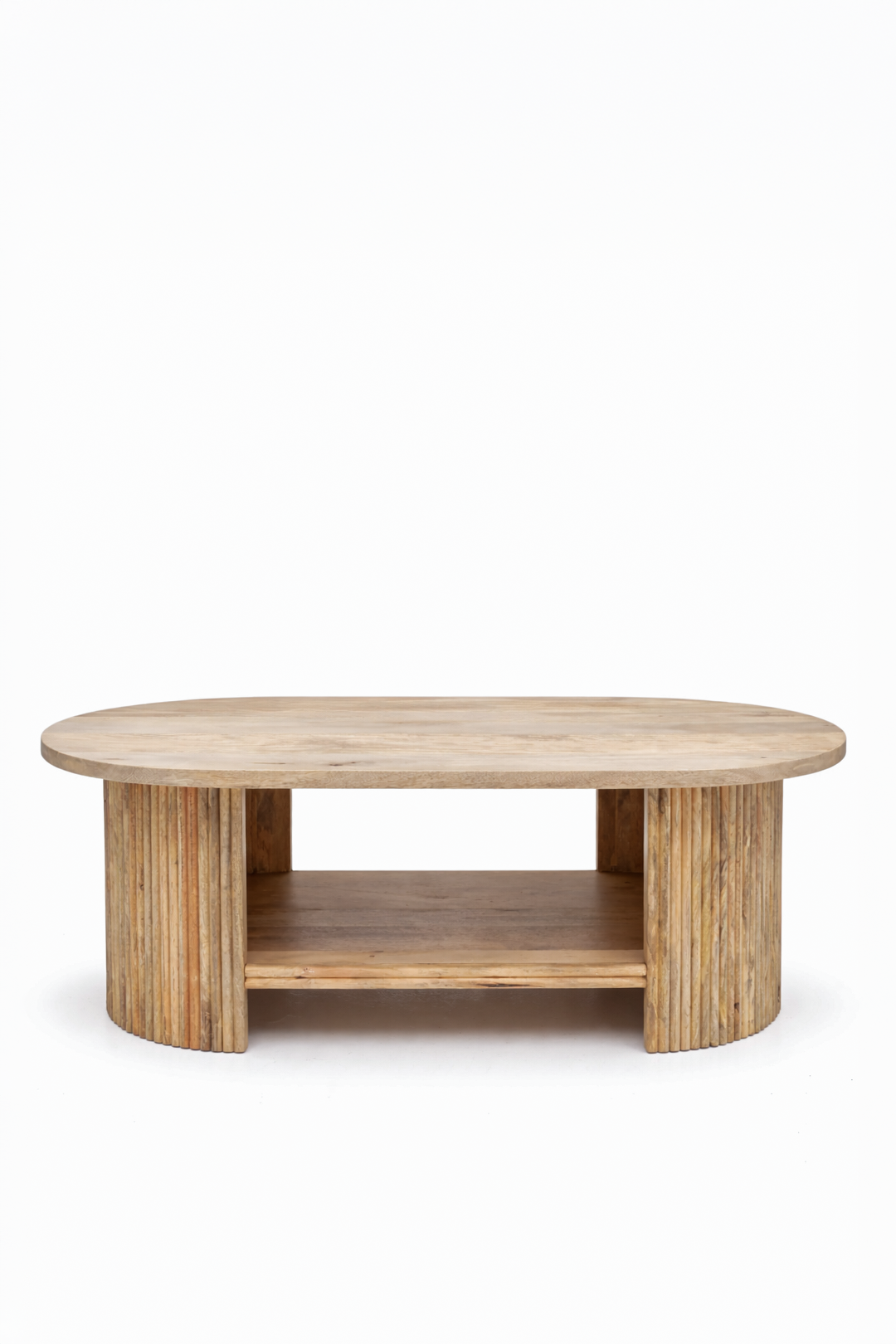 Crafted from warm natural wood, this coffee table features sculpted fluted column legs that create architectural depth and refined texture. The softly rounded top enhances its smooth organic silhouette, while flowing beige and honey toned grain patterns bring natural warmth into your living space. Designed with an open lower shelf for layered styling, it allows you to curate a balanced interior that feels grounded, elegant, and effortlessly modern with a touch of Mediterranean charm.