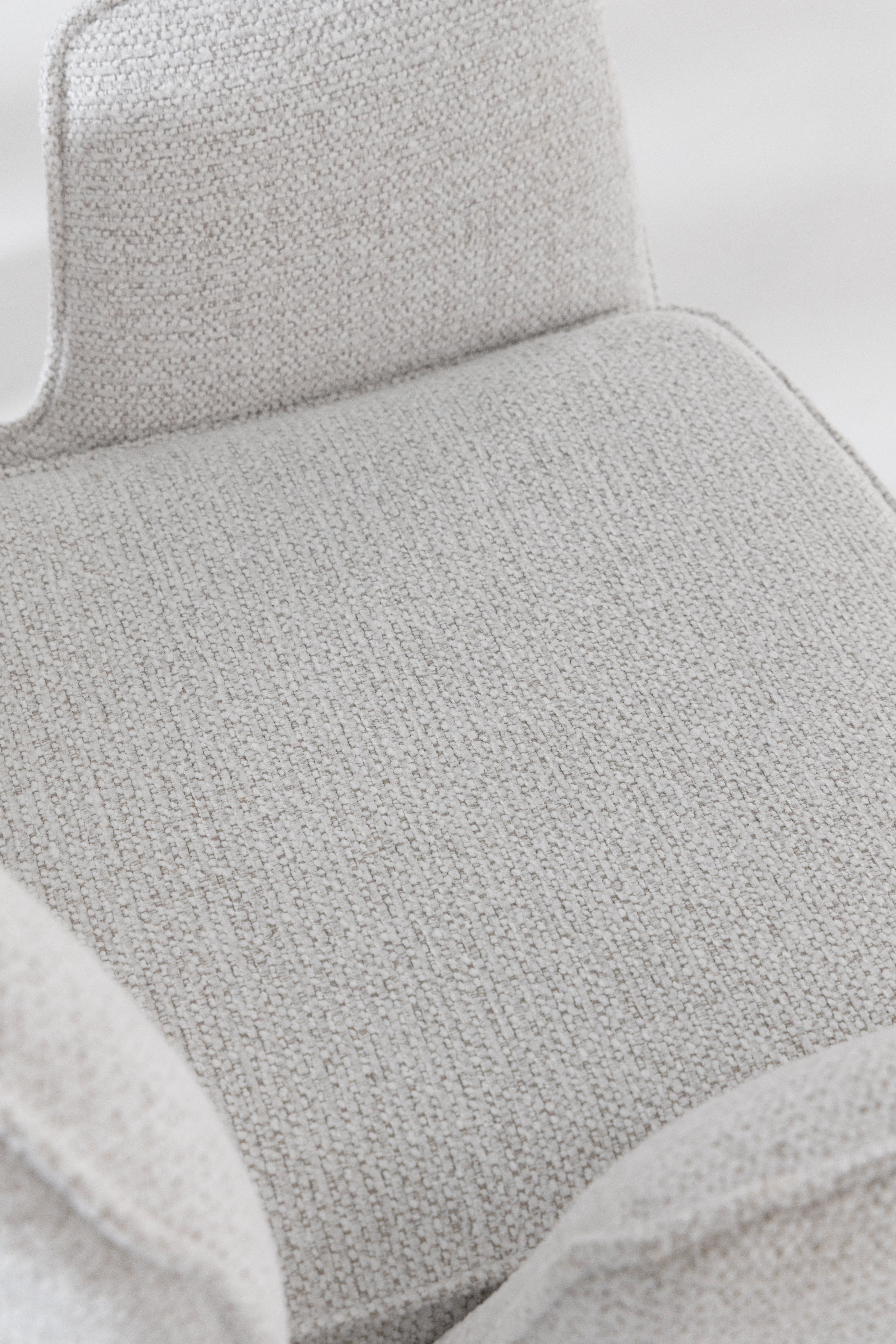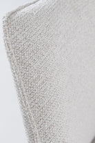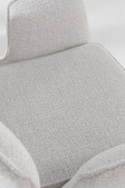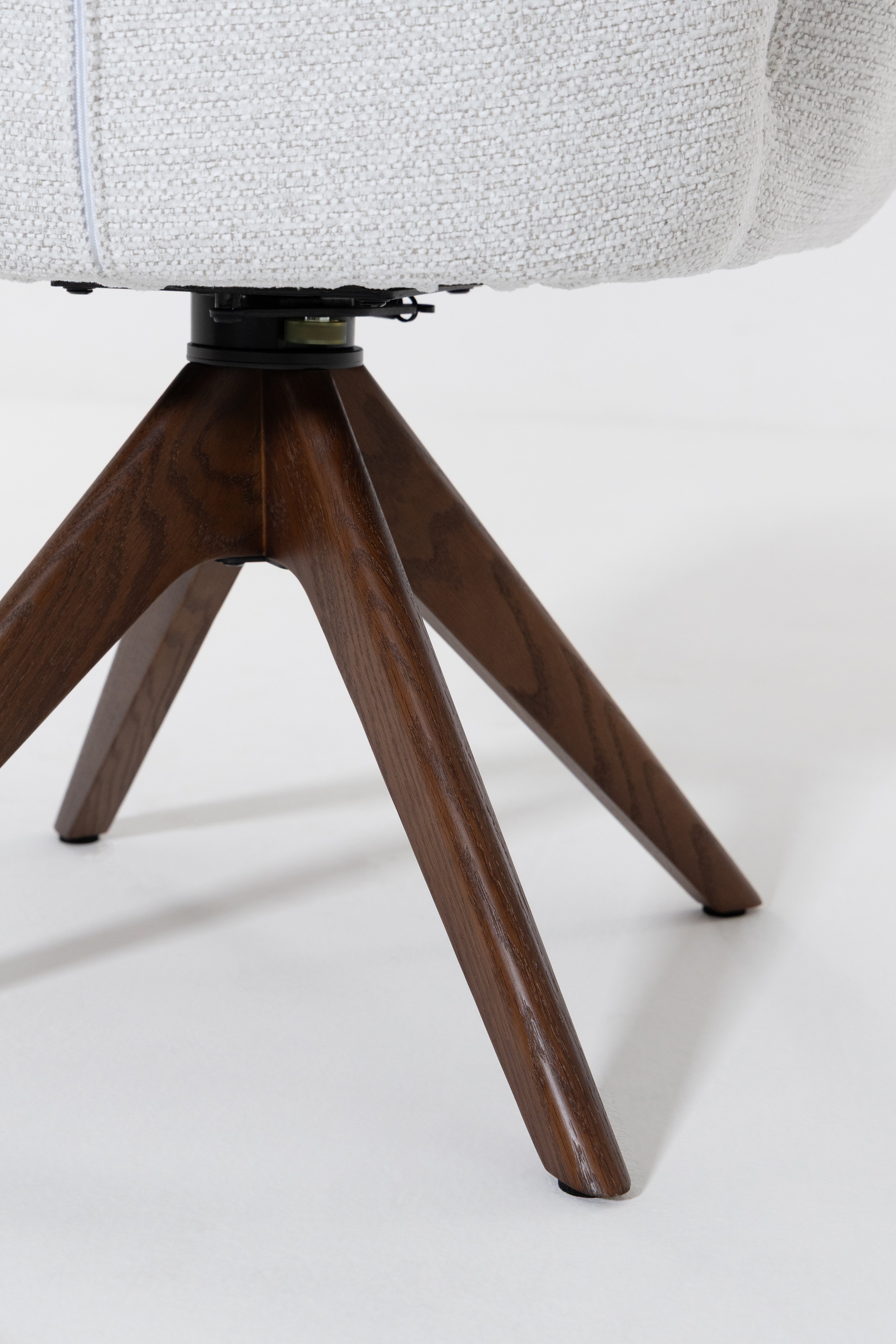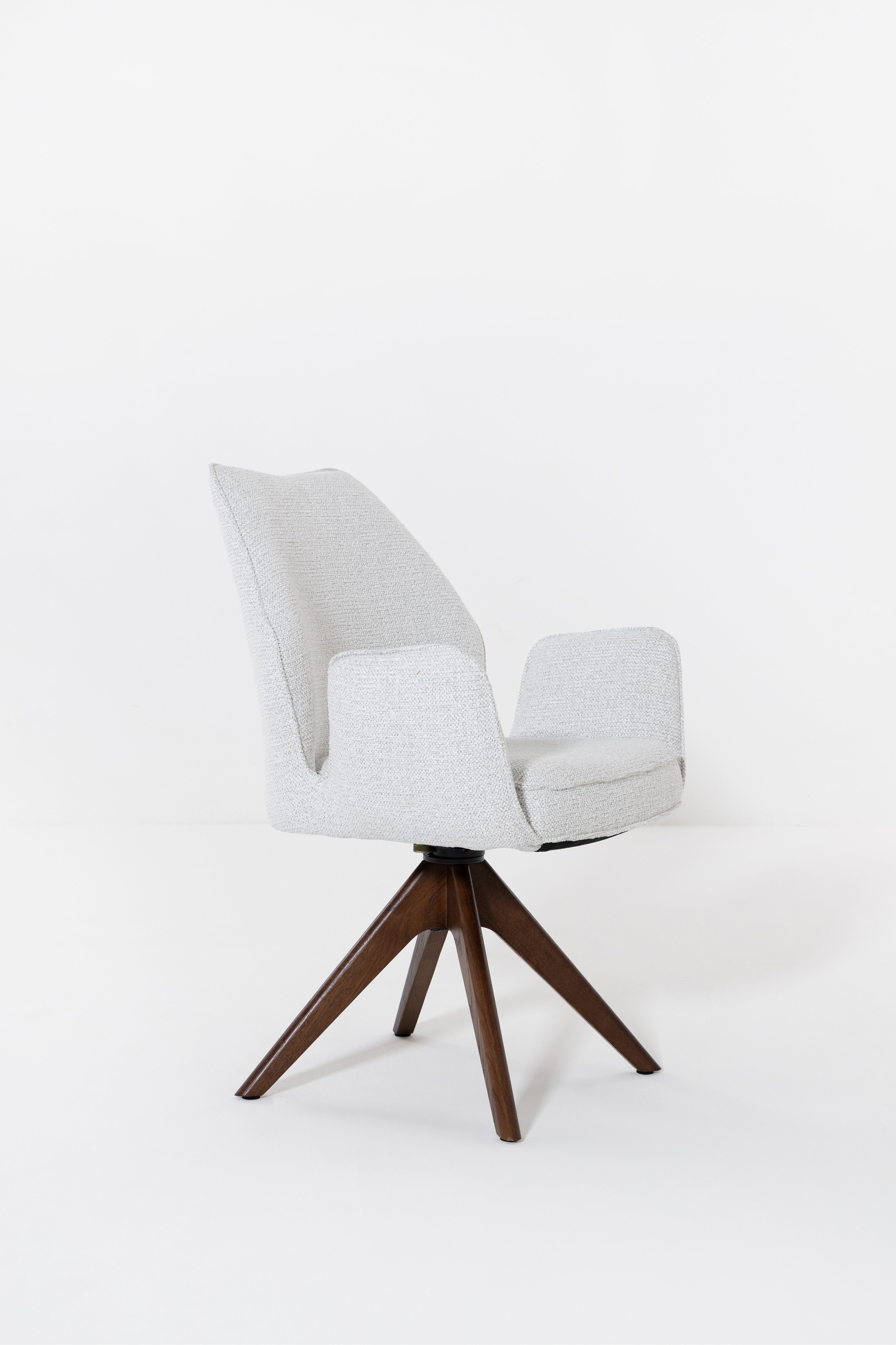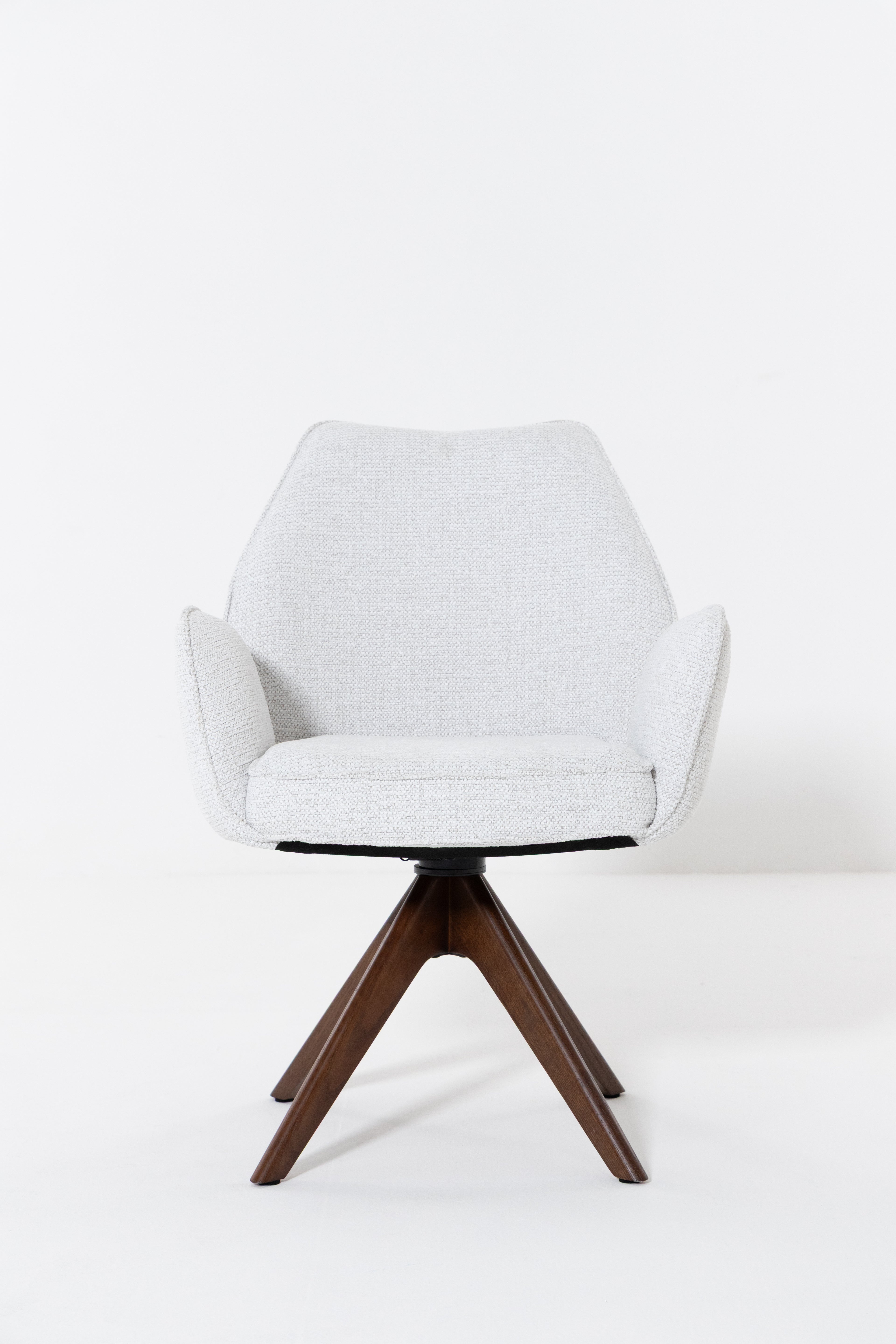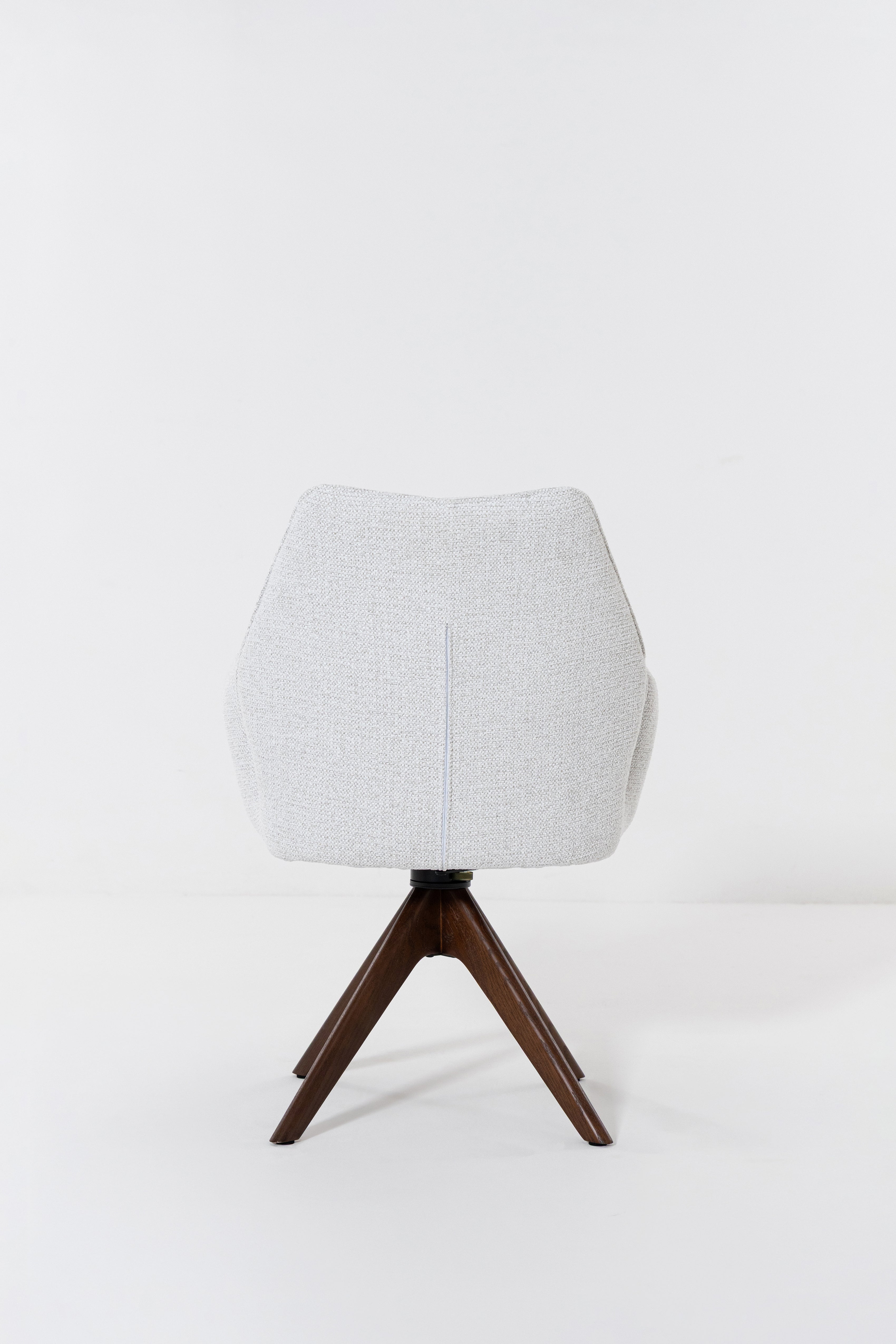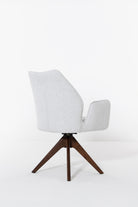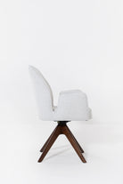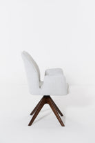 Designed to bring fluid movement and sculpted elegance to your dining space, this swivel dining chair features a softly curved backrest and plush cushioned seat wrapped in textured cream upholstery. The warm wood swivel base adds natural depth and architectural balance, creating a refined contrast against the light fabric. Its rounded silhouette and smooth rotation invite effortless comfort, allowing you to gather, host, and dine in a setting defined by modern sophistication and timeless warmth.
