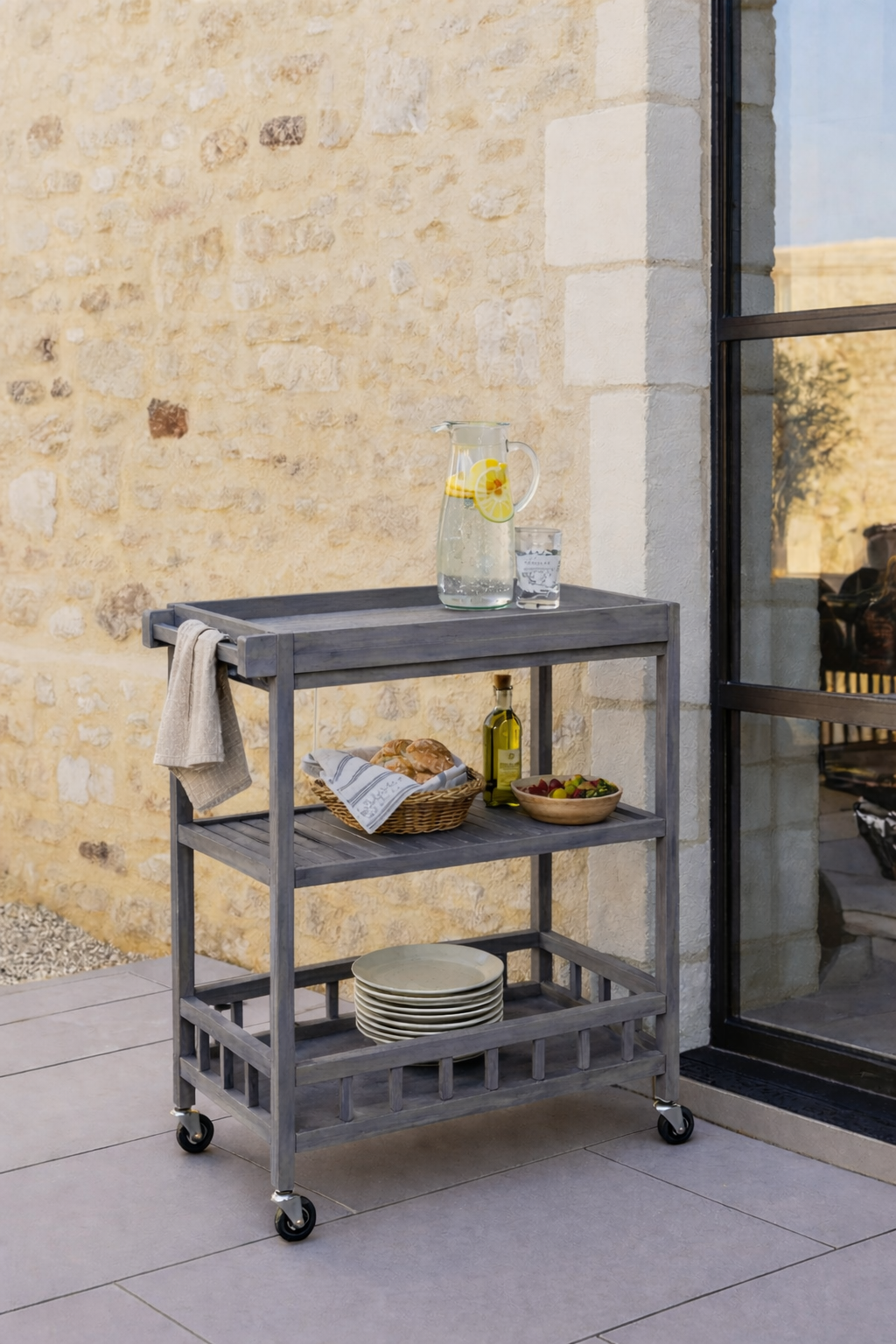 Envision effortlessly hosting gatherings with every drink and appetizer at your fingertips. This wooden trolley is your new, mobile centerpiece, designed to bring both style and convenience to your space. With its three-tier design and dusk grey finish, this trolley combines a rustic wooden aesthetic with modern functionality. The natural wood texture, slatted shelves, and smooth-rolling wheels make it both practical and visually appealing.