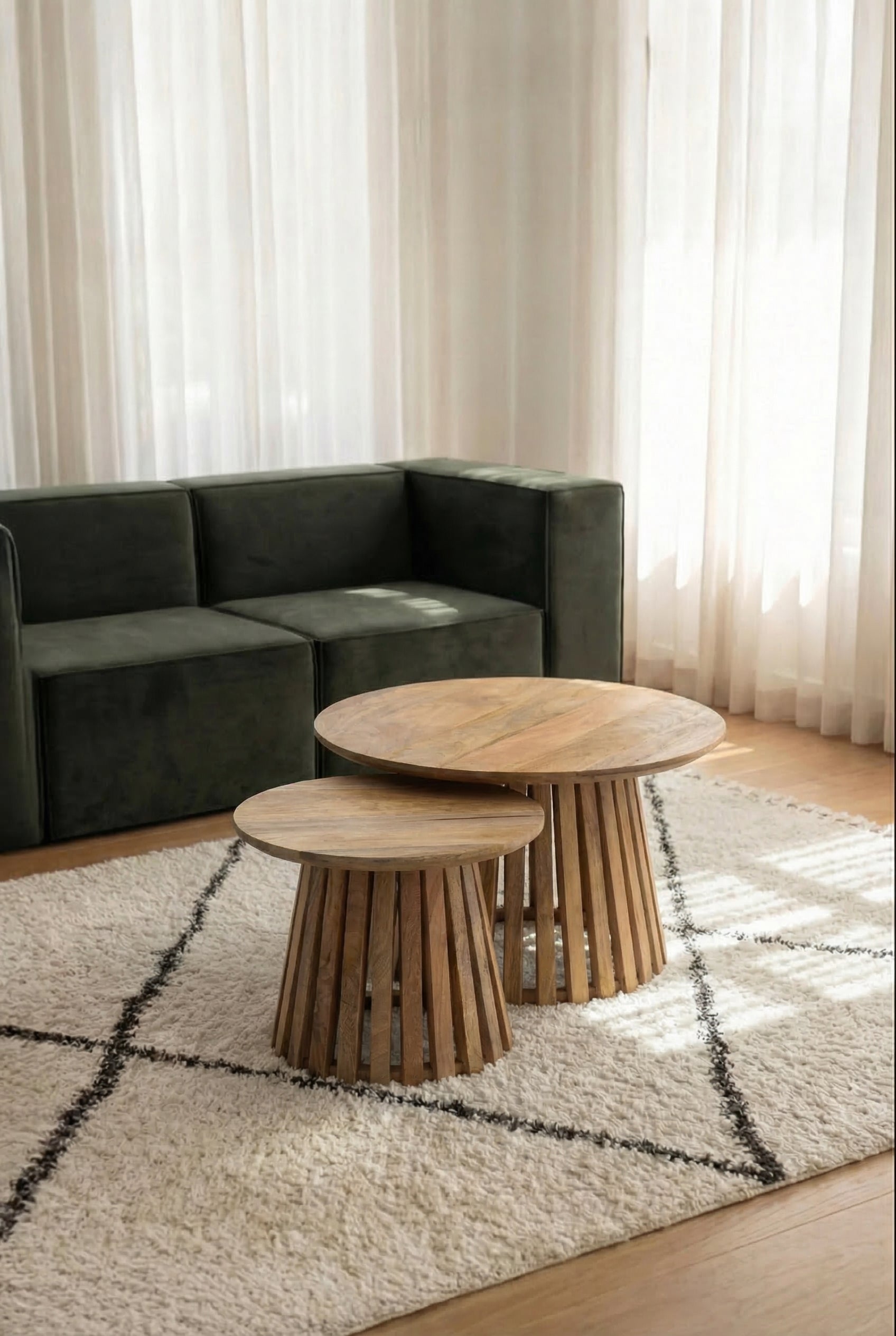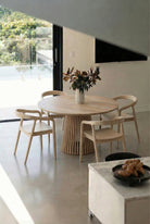 Crafted in warm natural wood, this round dining table features a smooth circular top resting on a sculpted fluted pedestal base that adds architectural depth and visual rhythm to your space. The vertical slatted detailing creates a refined texture while maintaining a clean modern silhouette. Its balanced proportions and organic wood grain bring warmth and elegance to your dining area, allowing you to gather, host, and style your space with timeless sophistication and understated luxury.