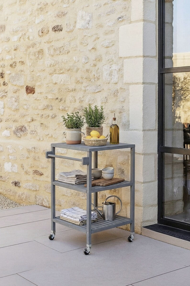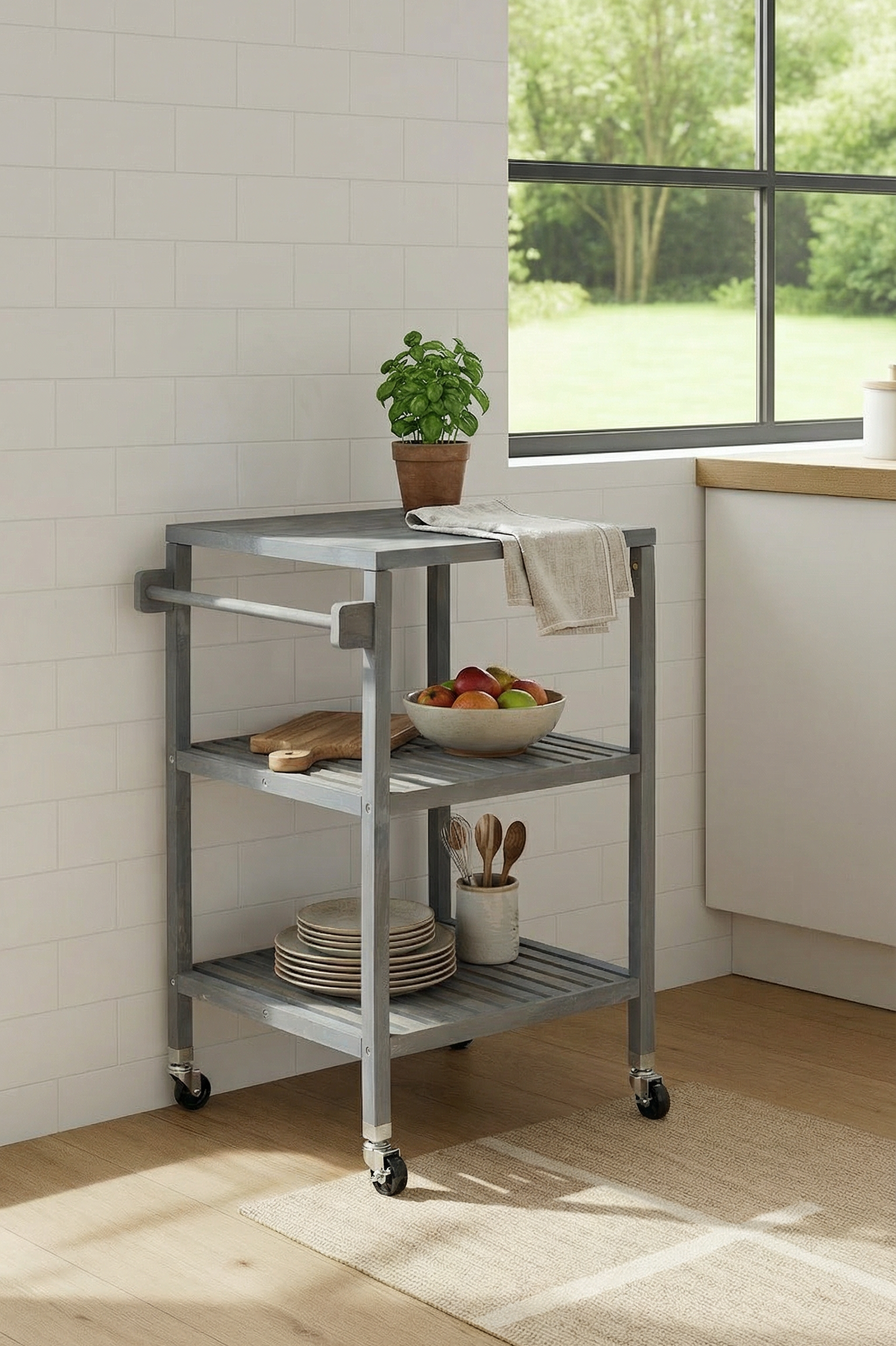 Step into modern elegance with this kitchen trolley in Dusk Grey, where your hosting moments become effortlessly stylish. The smooth rectangular top, paired with two slatted open shelves, offers ample space to store, serve, or organize essentials. Its sleek grey finish enhances the textured wood grain, while sturdy caster wheels glide smoothly, making it your go-to companion for kitchen prep, dining, or entertaining. Designed for you, it blends functionality with a refined contemporary look.