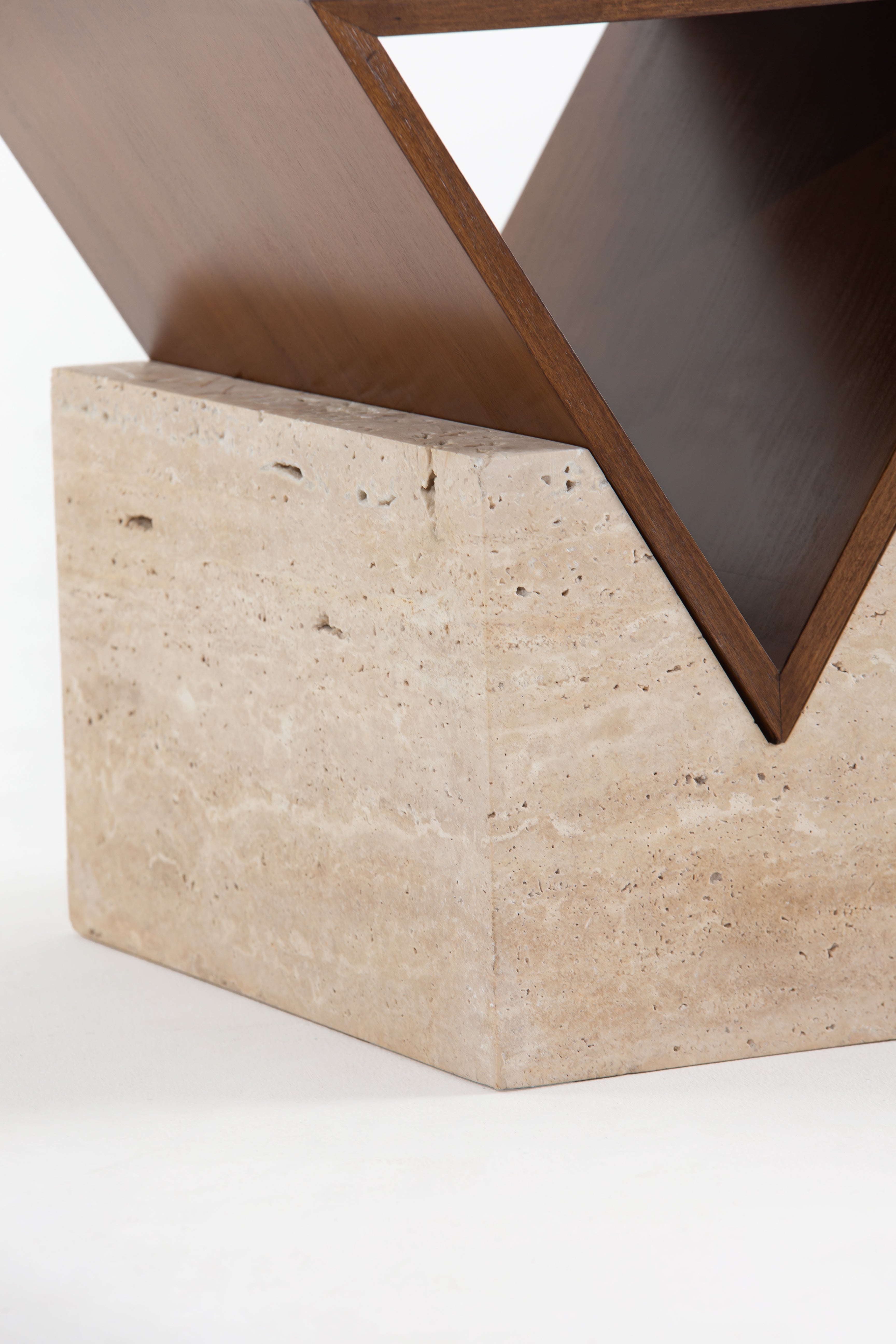 Tasya Beige Travertine Side Table With Wooden Top