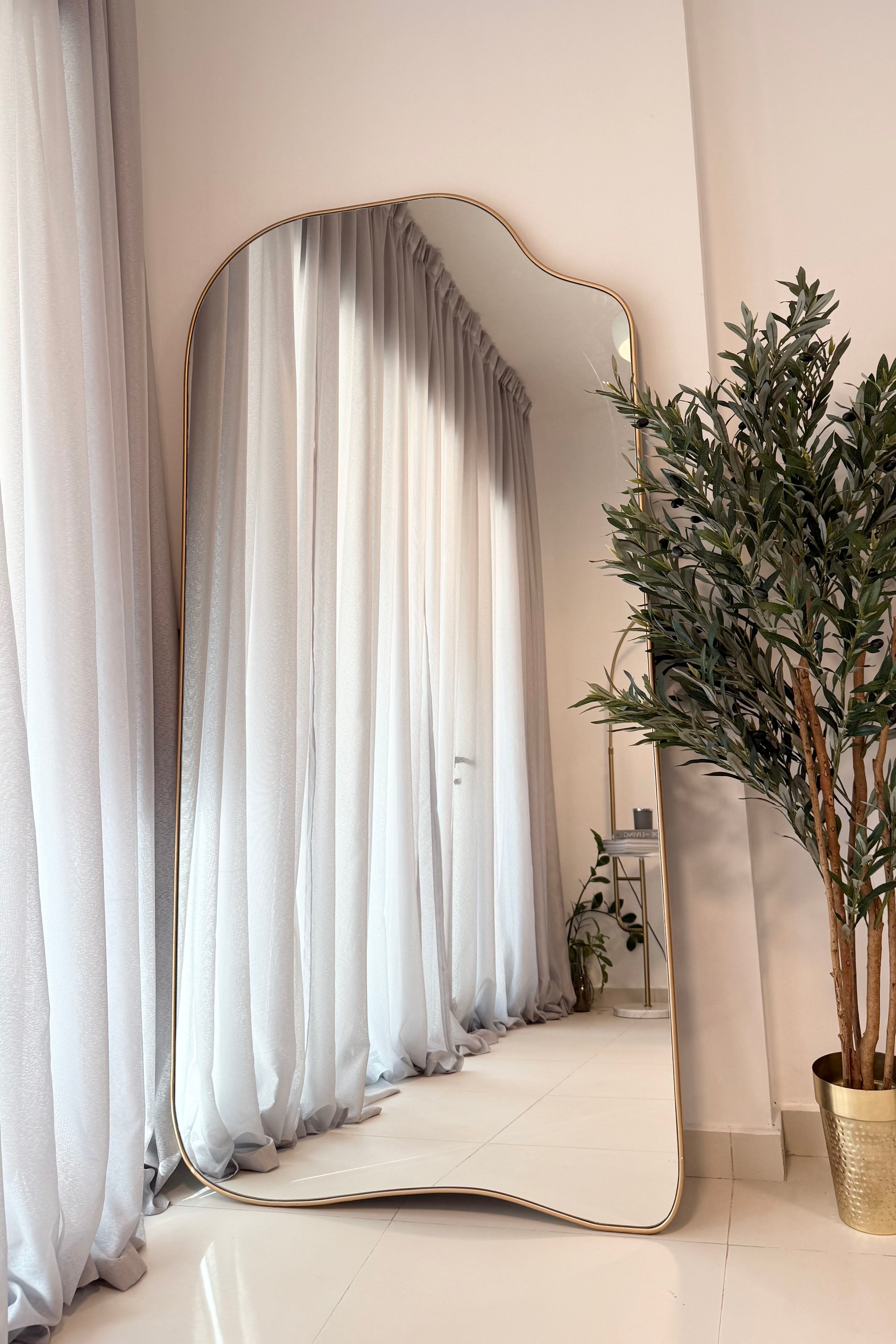 The Arcadia Gold Irregular Frame Mirror combines artistic elegance with functional design, featuring a unique, flowing shape that captivates attention. Its stunning gold-finished wooden frame adds a touch of luxury and warmth, creating a striking visual contrast against minimalist or neutral-toned interiors. This mirror not only serves as a practical addition for reflections but also transforms any room into a sophisticated living space with its bold, contemporary aesthetic.