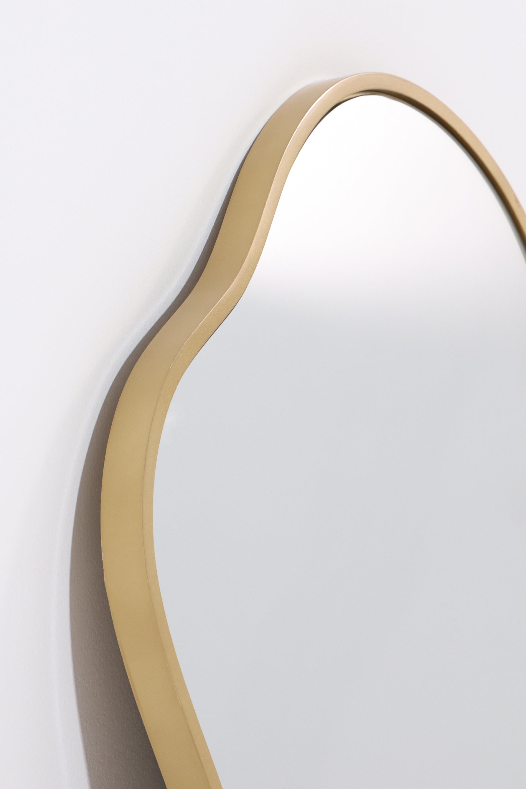 This mirror features a flowing irregular shape framed in a slim gold border that adds warmth and subtle shine. The reflective surface enhances light and depth, while its organic outline introduces movement that complements bedrooms, living areas, or entryways. The metallic edging contrasts elegantly with the glass, turning a functional piece into a refined accent suited to modern and contemporary interiors.