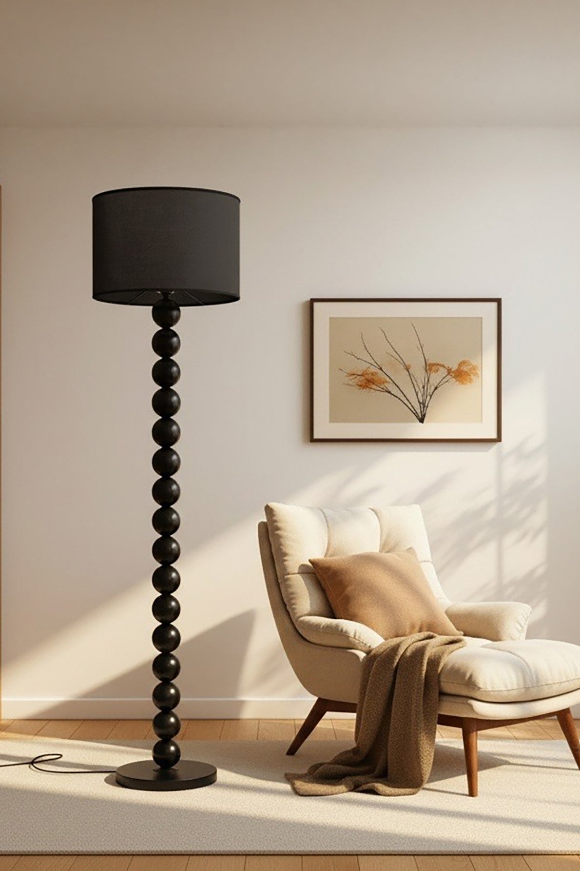 Elevate your decor with our Modern Black Beaded Floor Lamp, a stunning blend of style and functionality. Featuring a unique stand adorned with glossy black beads, this lamp contrasts beautifully against its sleek white shade, making it a standout piece in any modern or minimalist setting. Perfect for adding a touch of sophistication to your living room or bedroom, it provides both excellent illumination and a decorative accent that enhances your home's ambiance. Crafted for durability and timeless appeal, this floor lamp is an ideal choice for anyone looking to enhance their space with elegant lighting.