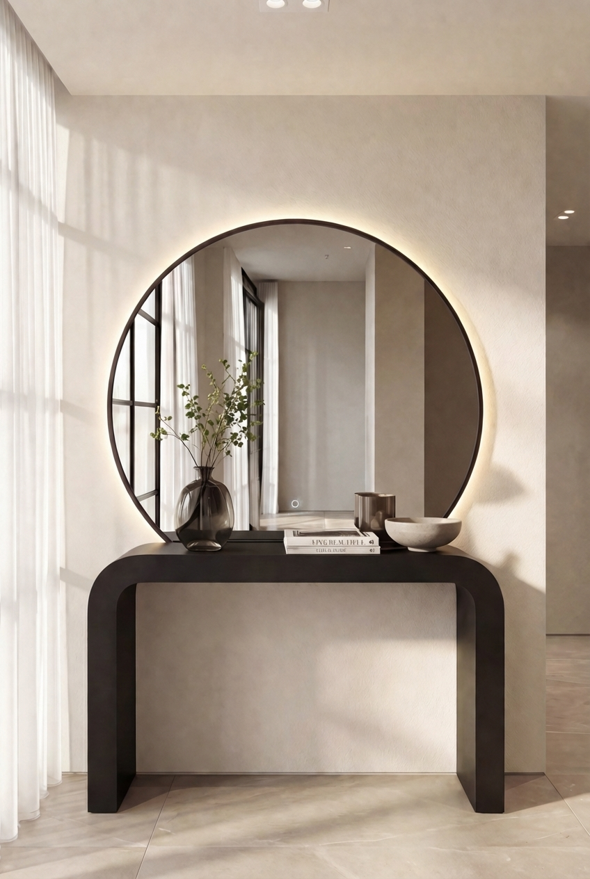 A striking balance of form and glow, this sculptural wall mirror transforms your space with soft ambient lighting and refined presence. The half moon silhouette creates a bold focal point while the integrated LED backlight casts a warm halo that enhances depth and atmosphere. Paired with clean lines and a contemporary black finish, it elevates entryways, living spaces, or bedrooms with a sense of modern luxury and quiet sophistication.