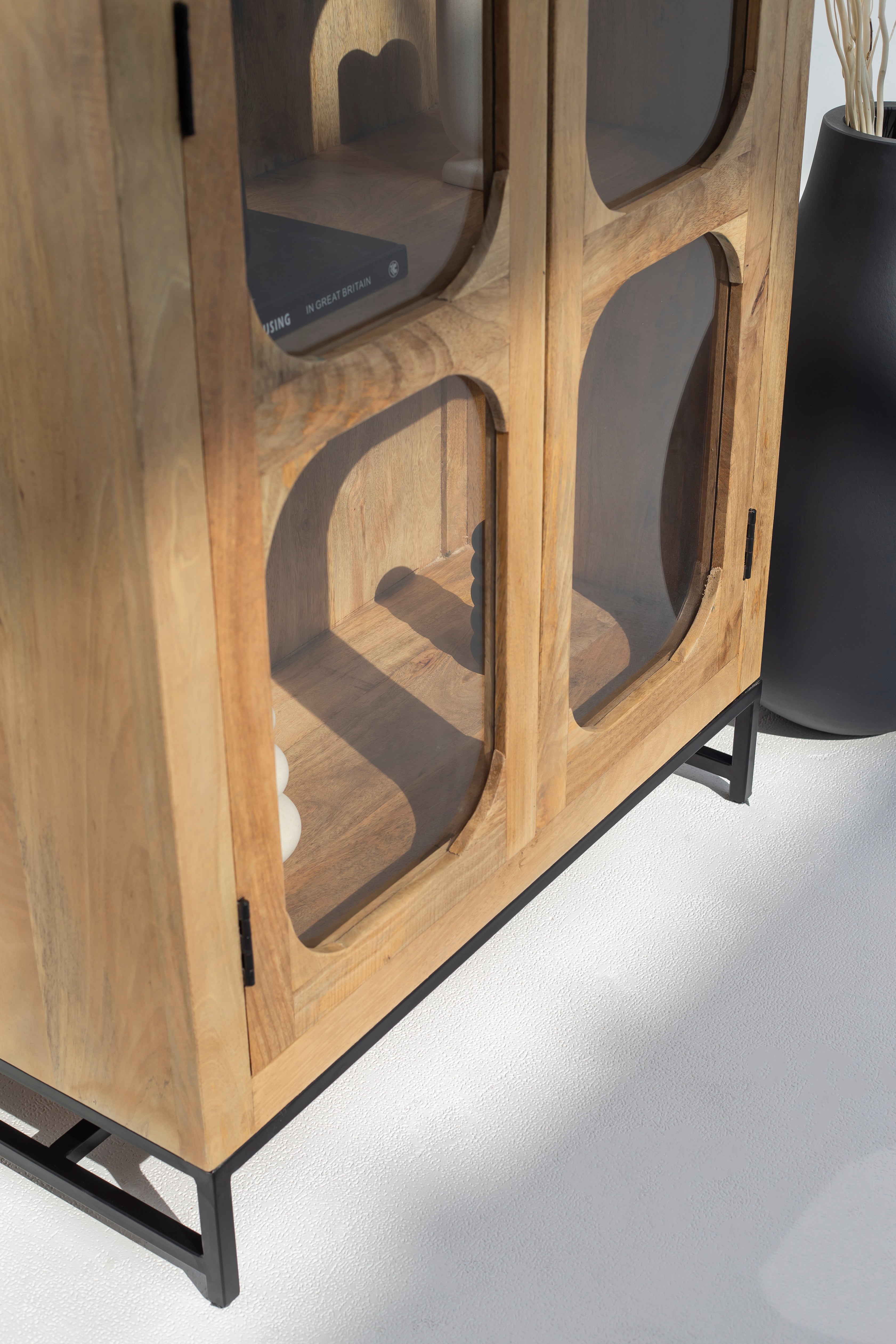 Add timeless charm to your living space with this mango wood cabinet. Featuring smooth natural grain textures, this cabinet is built to highlight its organic elegance. The curved glass-front doors frame your displayed items beautifully, while the robust wooden structure provides both style and durability. Elevated with a sleek black metal base, its clean lines and refined craftsmanship suit modern and rustic interiors alike. Ideal for showcasing decor or storing essentials.