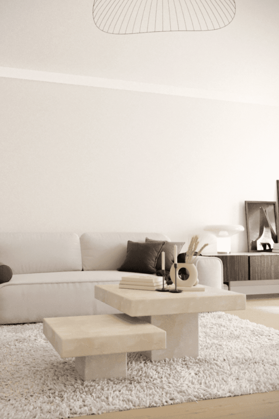 Add a cozy woven rug underneath to create a warm and inviting atmosphere. Complement the table's sophisticated design with a beautifully crafted vase, filled with pampas and flowers. To add extra comfort and style, place a cushion or two around the tables.