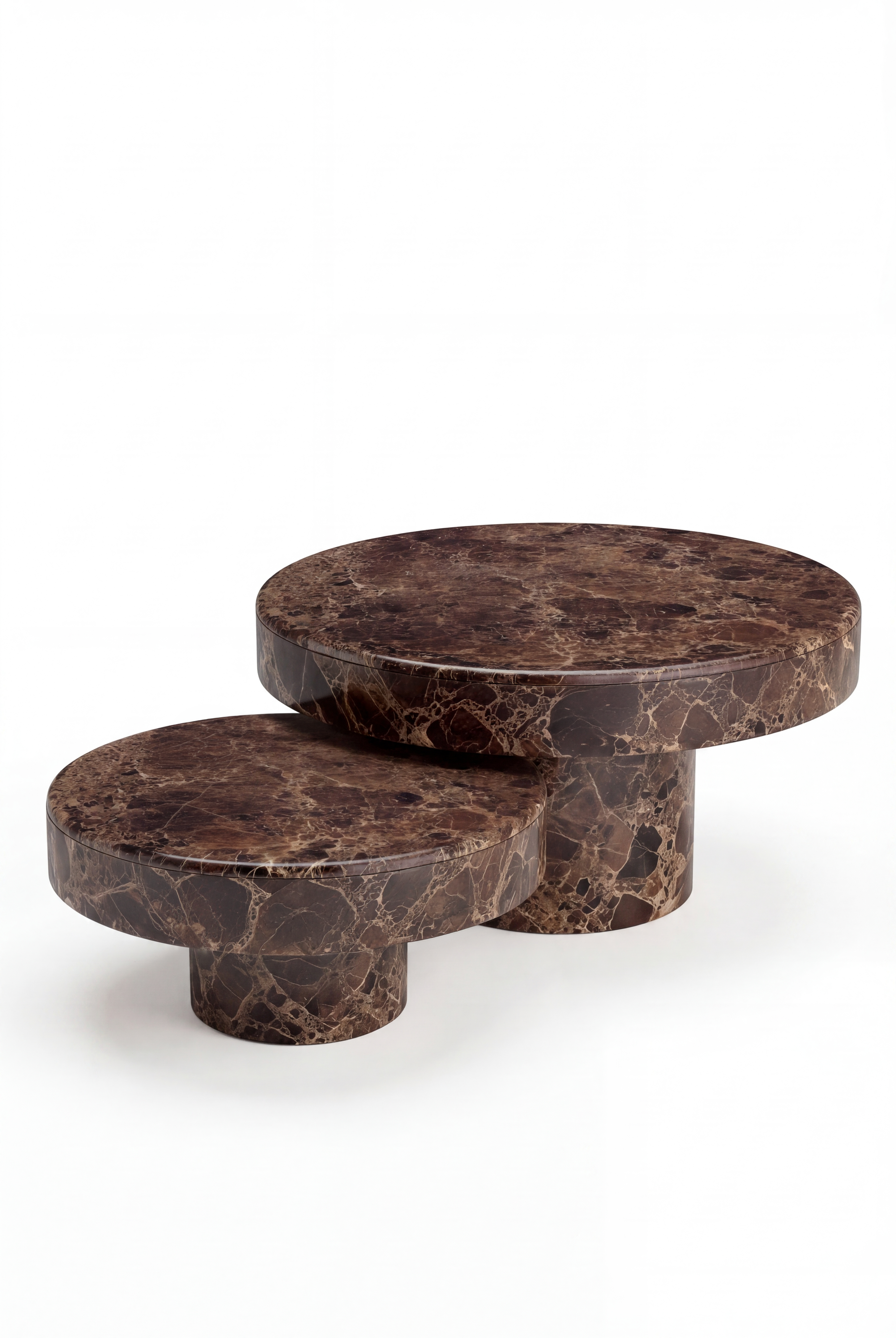 Deep brown marble with delicate, web-like veining creates a rich and sophisticated surface that feels both grounded and refined. The clean round top is paired with a solid cylindrical base, forming a balanced silhouette with soft curves and architectural presence. Smooth, polished, and timeless, it adds warmth and understated luxury to modern living spaces.