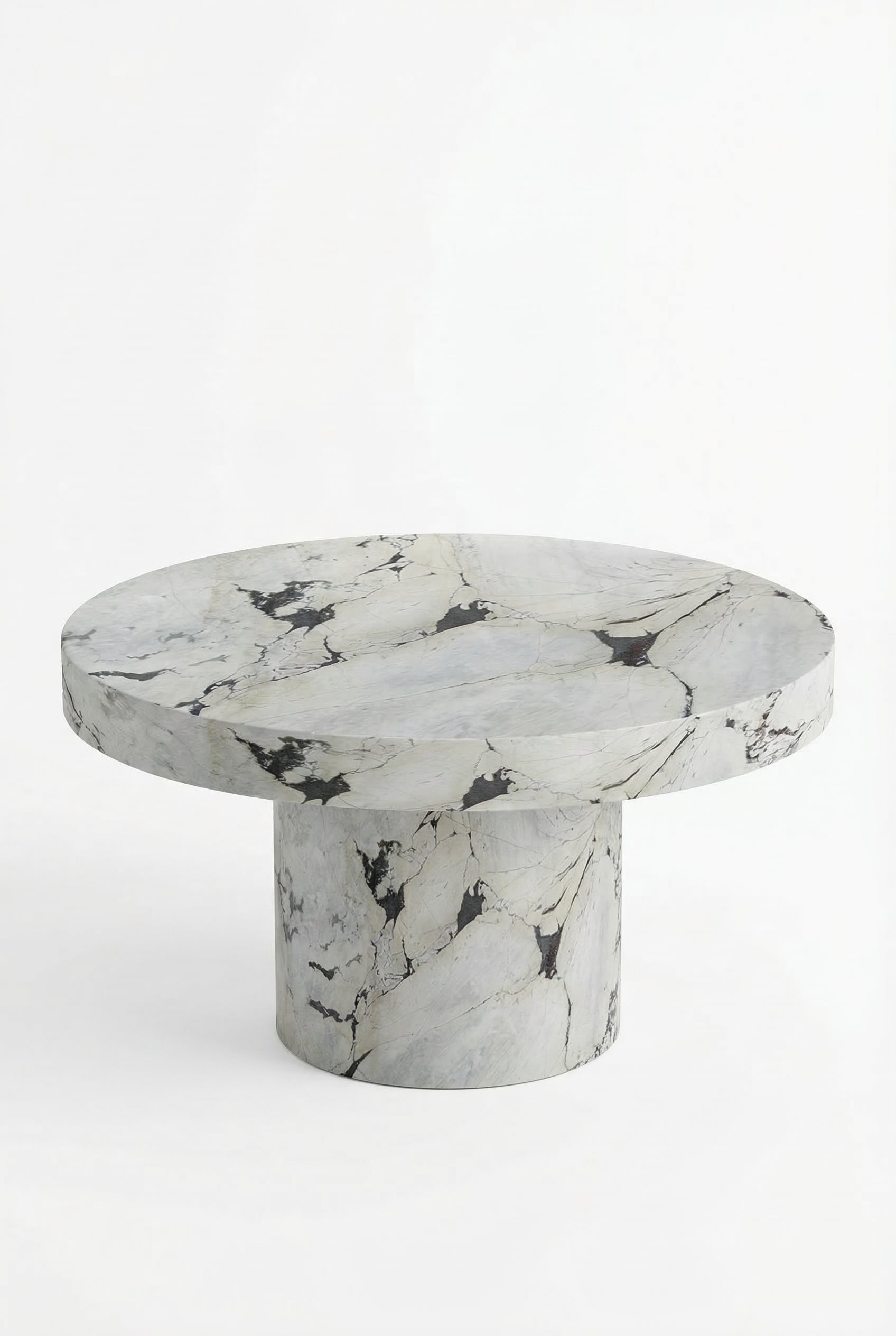 A bold round silhouette in Viola white marble brings effortless balance and refined simplicity to the space. The smooth circular top is enriched with dramatic charcoal veining that flows naturally across the luminous surface, creating depth and movement. Anchored by a solid cylindrical base, the design feels grounded yet elegant, offering a timeless focal point that enhances modern interiors with quiet luxury.