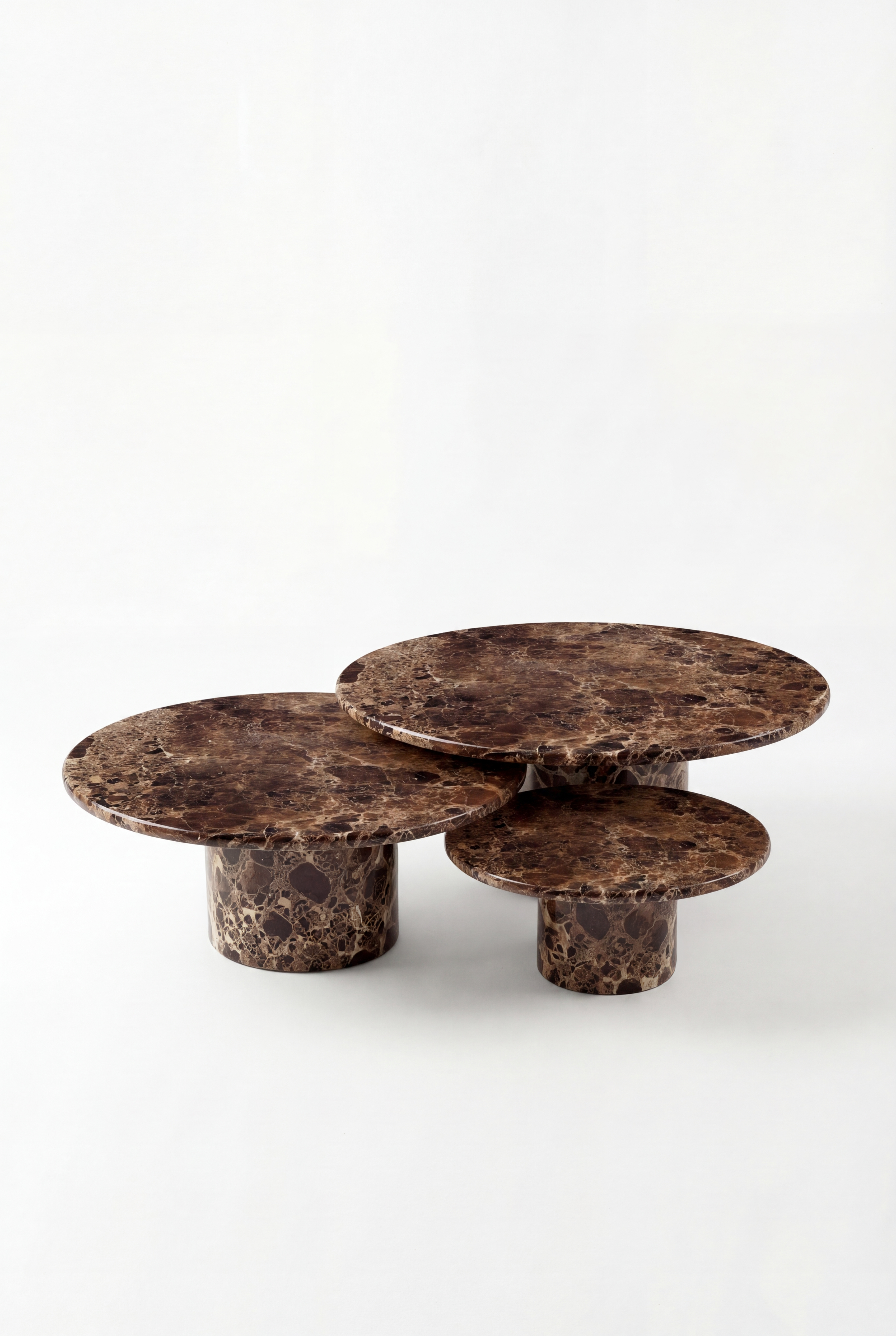 Rich dark Emperador marble with fine, natural veining flows across layered round surfaces, creating depth and visual rhythm. The tiered composition rests on cylindrical bases, forming a sculptural arrangement that feels both grounded and dynamic. Smooth and polished with warm espresso tones, it brings a refined, modern statement to your living space while offering versatile styling.