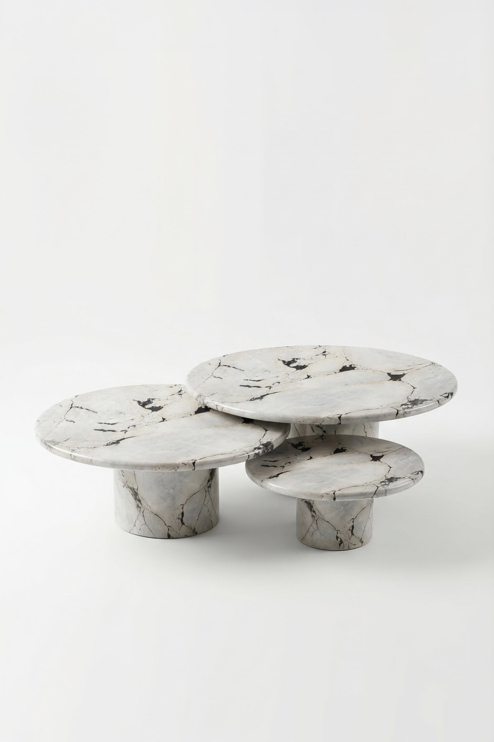 A sculptural composition of layered round forms in Viola white marble creates a striking yet harmonious centerpiece. Each tier reveals soft ivory tones enriched with bold charcoal veining, flowing naturally across the surfaces like abstract art. The varied heights introduce depth and dimension, while the cylindrical bases ground the design with quiet strength, bringing a refined, modern elegance to the living space.