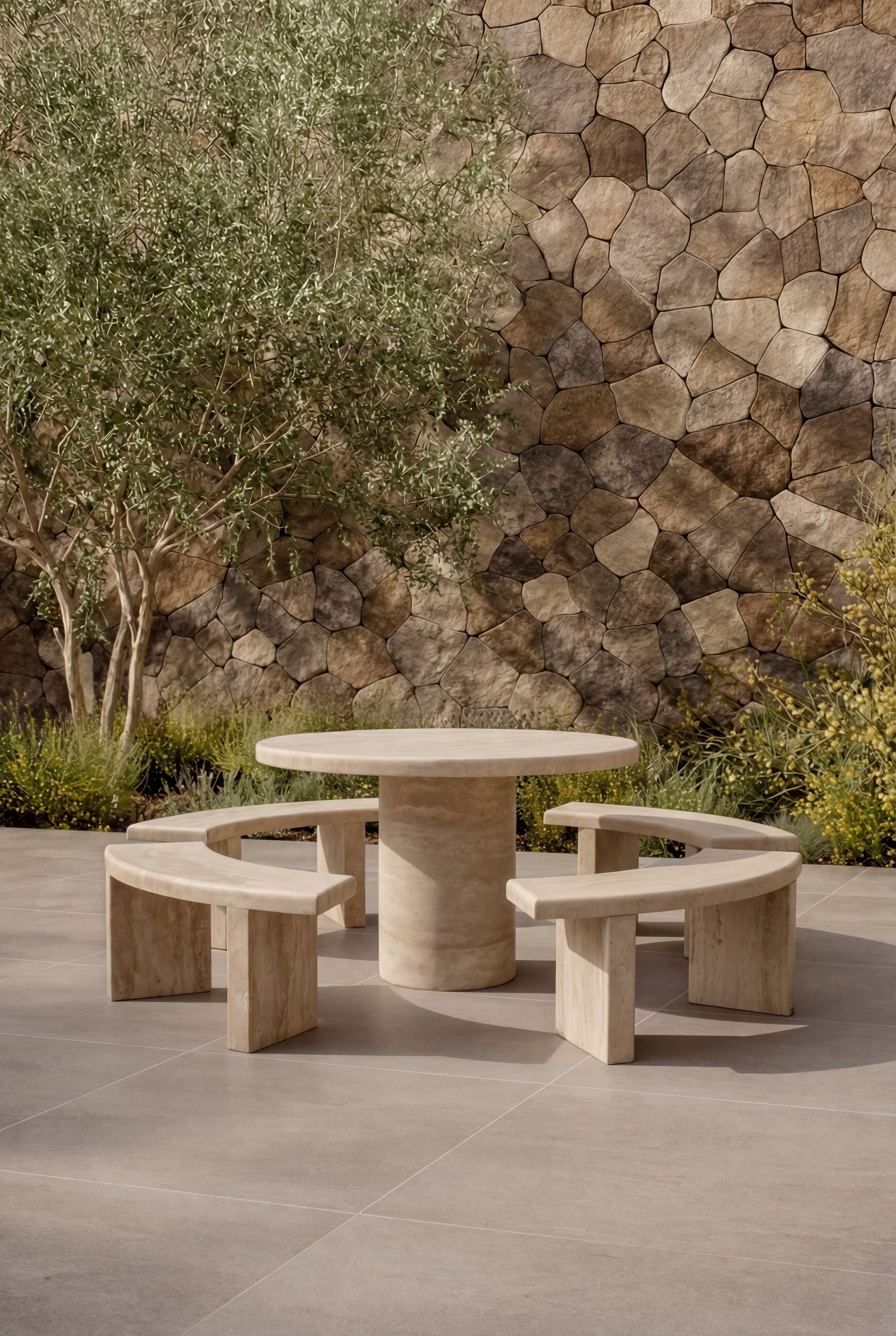 Imagine gathering outdoors around a dining set that feels sculptural and timeless. The round marble table, crafted in warm natural tones, becomes the focal point of your patio or garden, while the matching curved benches echo its form with balance and elegance. The polished stone texture and solid shape create a sense of permanence and sophistication, blending seamlessly with both modern and classic outdoor spaces. Designed to bring people together, it transforms every meal, from casual brunches to evening feasts, into an elegant experience with enduring style.