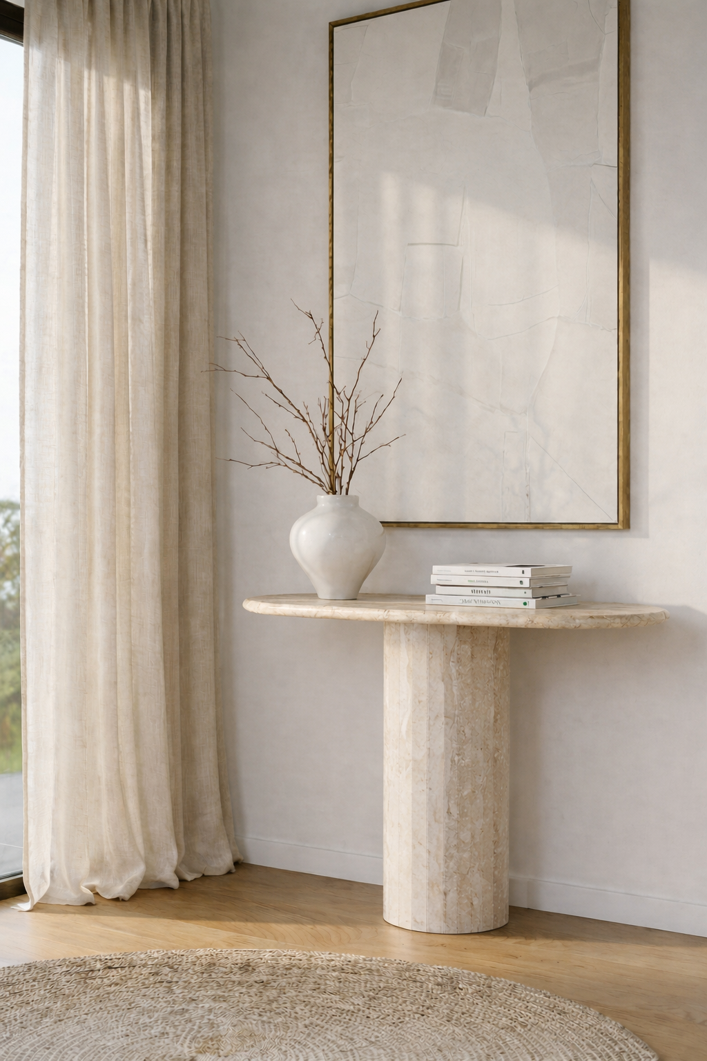 Crafted in luminous Brecia Beige marble, this console table showcases a smooth oval top resting on a vertically fluted cylindrical pedestal for a sculptural yet balanced silhouette. Soft creamy beige tones blend with delicate natural veining, creating a warm, organic texture that feels both timeless and modern. Its refined curves and architectural base elevate entryways, hallways, and living spaces, allowing you to style the surface with art, ceramics, or books while enhancing your interior with understated luxury and natural sophistication.