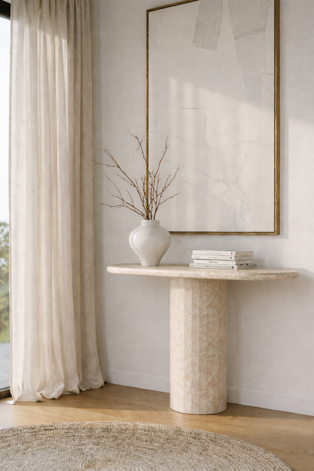 Crafted in refined Oryx marble, this console table features a smooth oval top resting on a vertically fluted cylindrical pedestal for a balanced architectural presence. Soft beige and creamy undertones blend with delicate natural veining, creating gentle movement and organic depth across the surface. The sculptural silhouette and warm stone texture bring timeless elegance to entryways and living spaces, allowing you to style ceramics, books, or decorative accents while elevating your interior with understated luxury and serene sophistication.