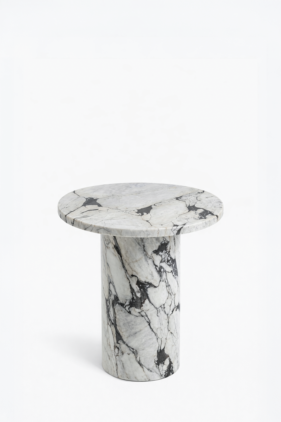 A refined round silhouette in Viola white marble brings sculptural elegance and natural artistry to the space. The luminous surface is enriched with bold charcoal veining that flows organically across the stone, creating striking visual depth. Its monolithic cylindrical base enhances the clean architectural form, offering a timeless statement that elevates interiors with modern sophistication and quiet luxury.