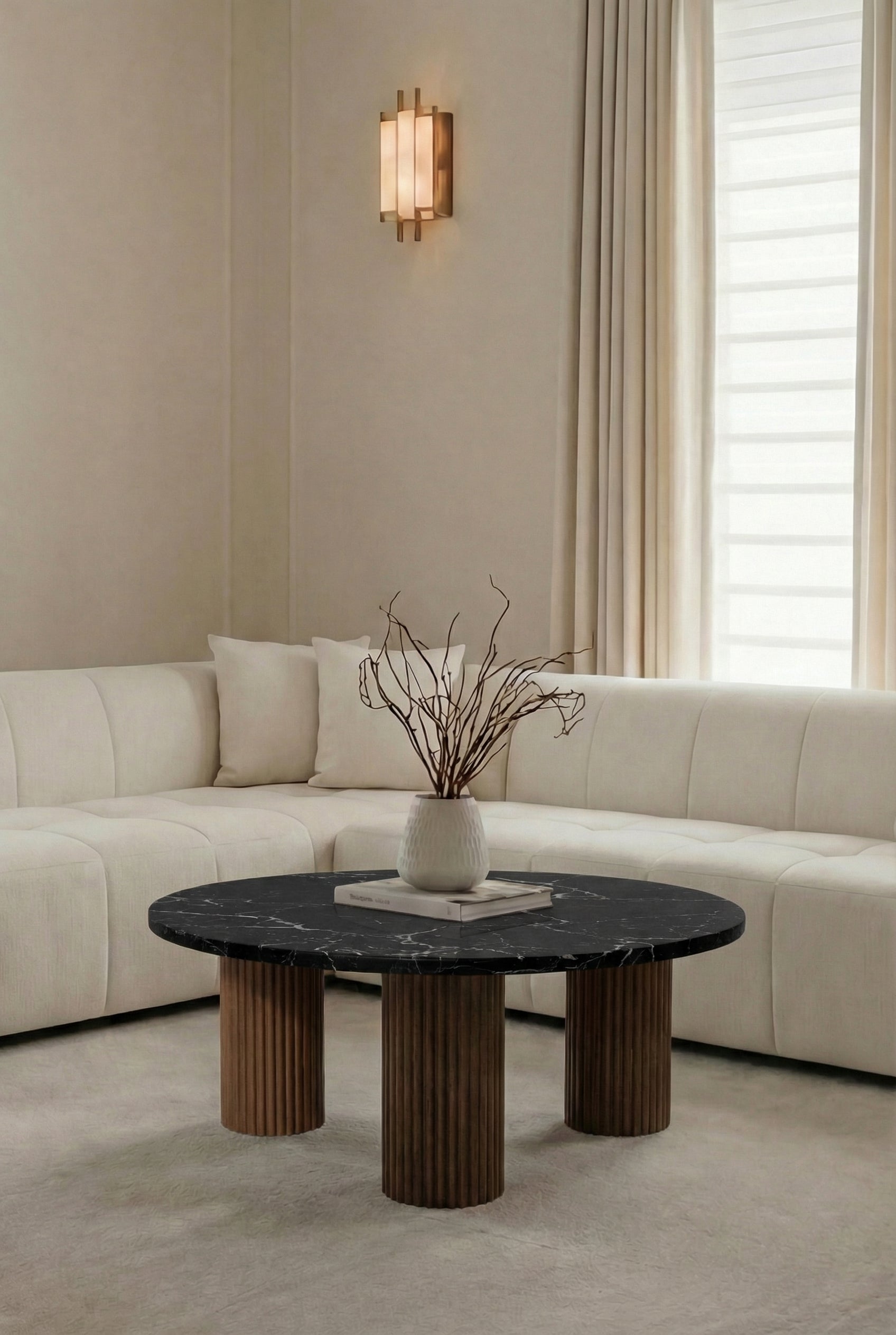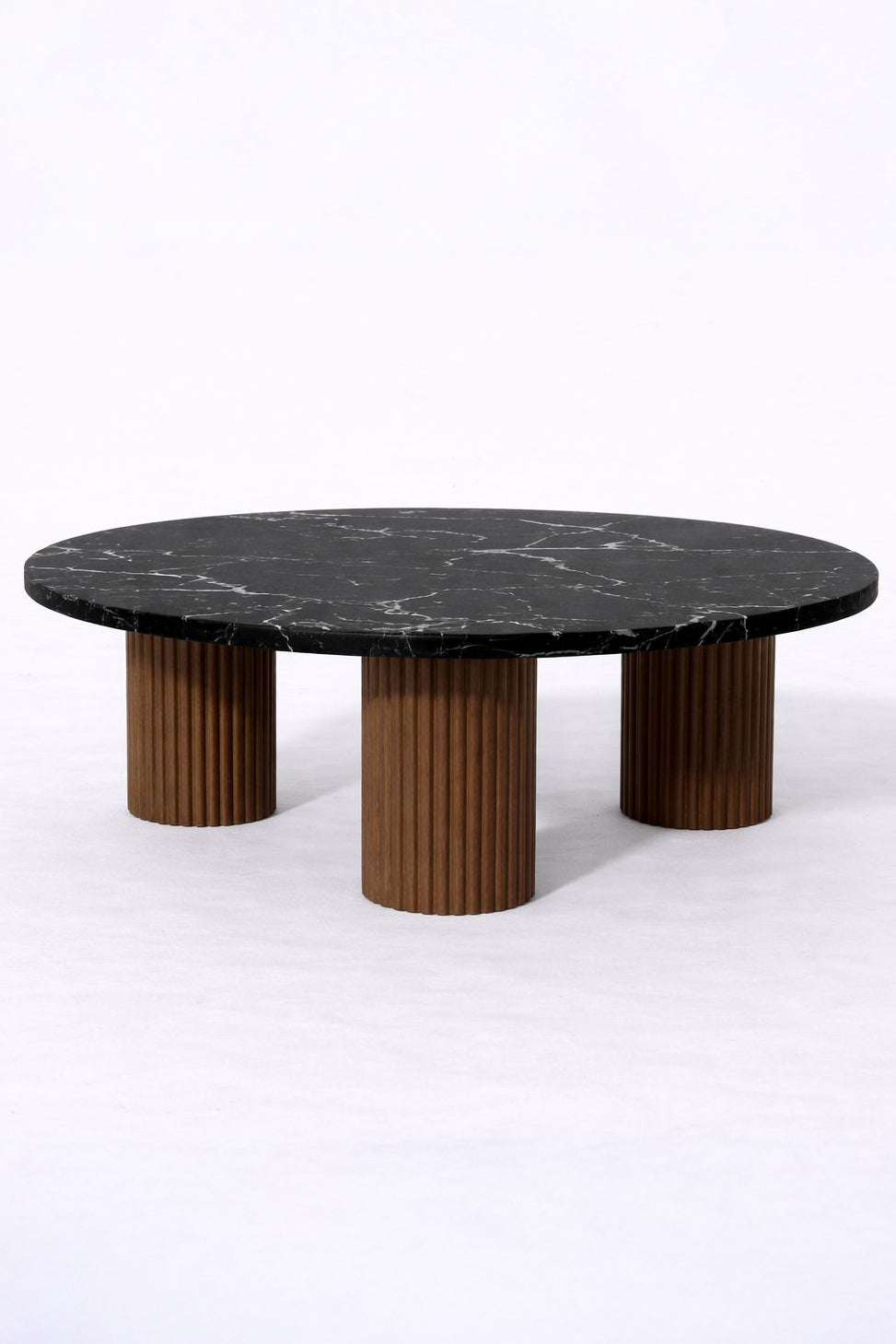Elevate your living space with the bold elegance of a rich black marble top paired with a dark wood base for a refined, timeless statement. The smooth round surface brings luxurious depth, while the fluted pedestal legs add sculptural texture and a beautifully grounded presence. Perfect for styling with books, candles, and decorative accents, it blends effortlessly with modern interiors, warm neutrals, and moody palettes. Please note that natural marble veining and tone vary from slab to slab, making each coffee table uniquely yours.