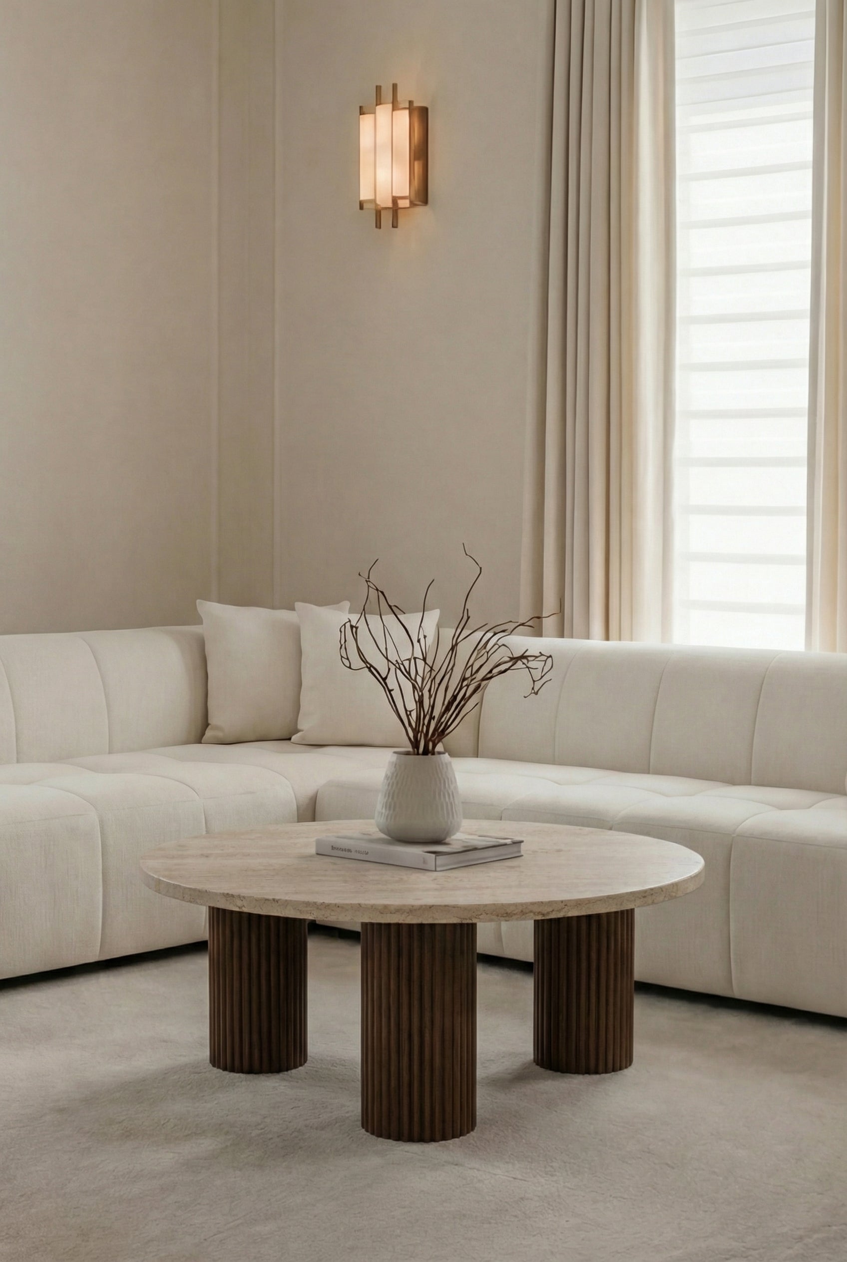 Bring natural elegance to your living space with the warm, organic beauty of a travertine top paired with a dark wood base for a refined, timeless look. The smooth round surface creates an inviting focal point, while the fluted pedestal legs add sculptural texture and a beautifully grounded silhouette. Perfect for styling with books, candles, and decorative accents, it blends effortlessly with modern interiors, earthy palettes, and warm neutrals. Please note that natural travertine features unique pores, tones, and patterns, so each coffee table will vary slightly and remain one of a kind.