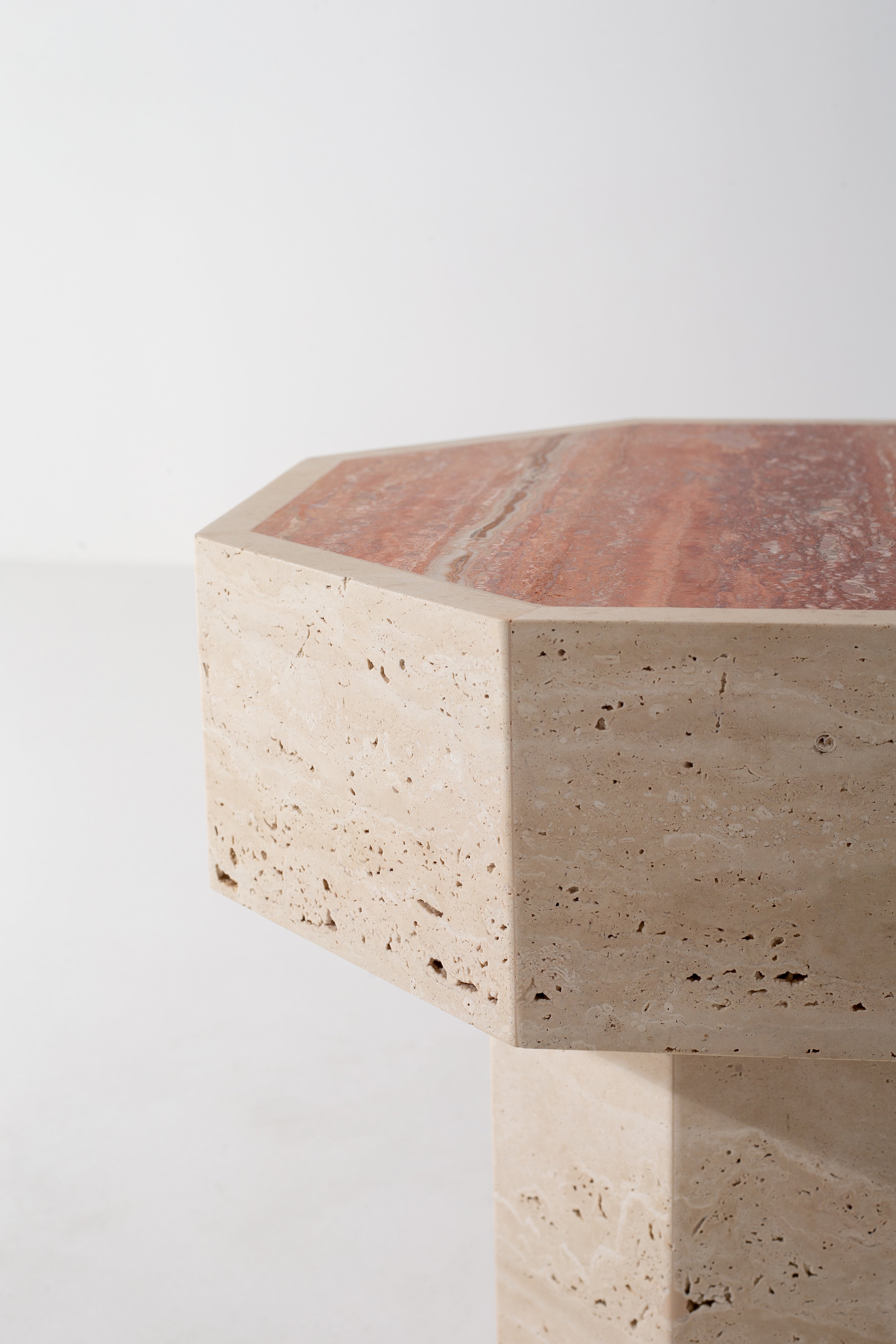 This Red Travertine side table presents a striking balance of warmth and structure through its octagonal stone top and solid architectural base. Natural tonal variation adds depth and individuality, while the geometric form creates a refined visual rhythm. Designed to stand confidently on its own, this piece works as both a functional surface and a sculptural focal point.