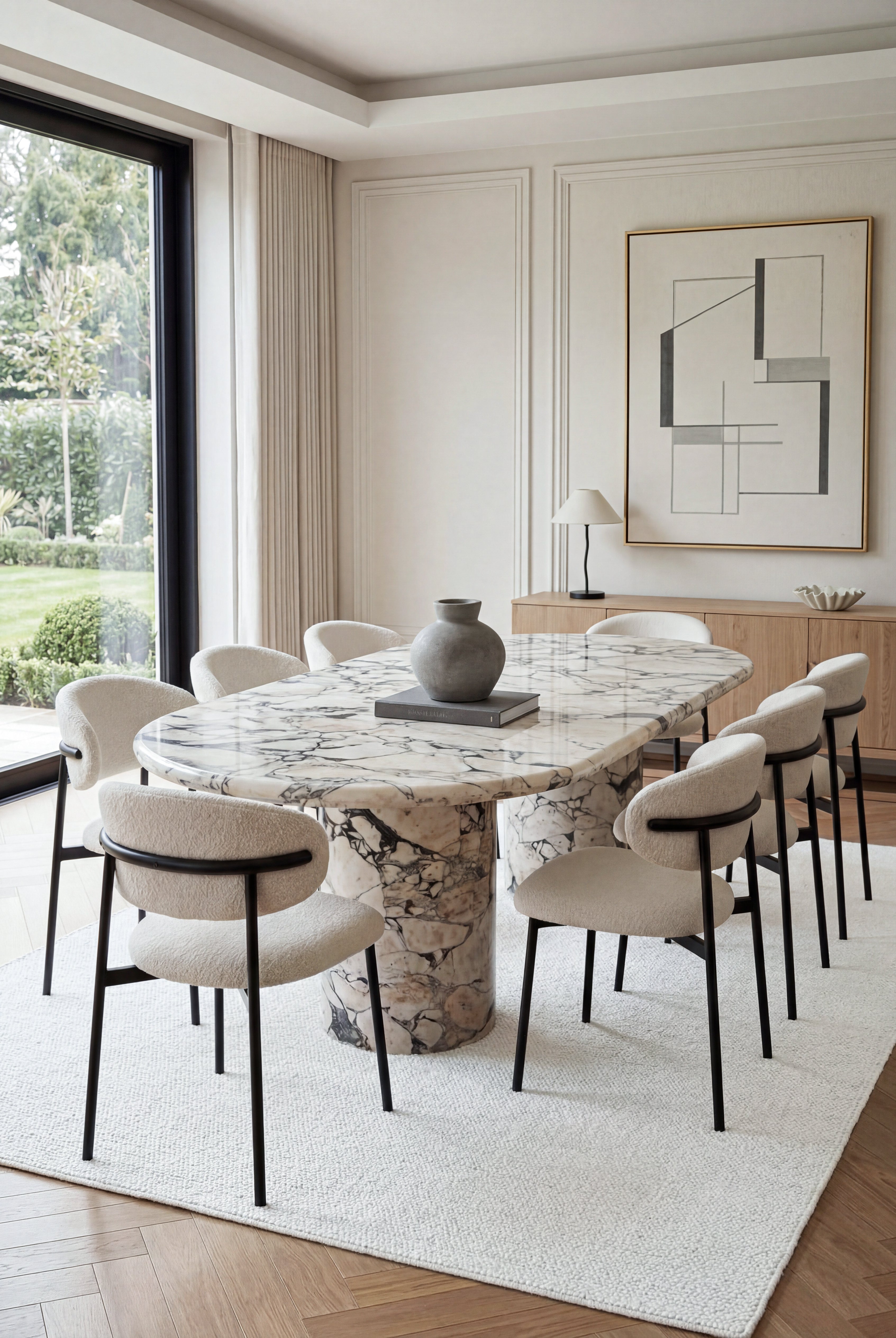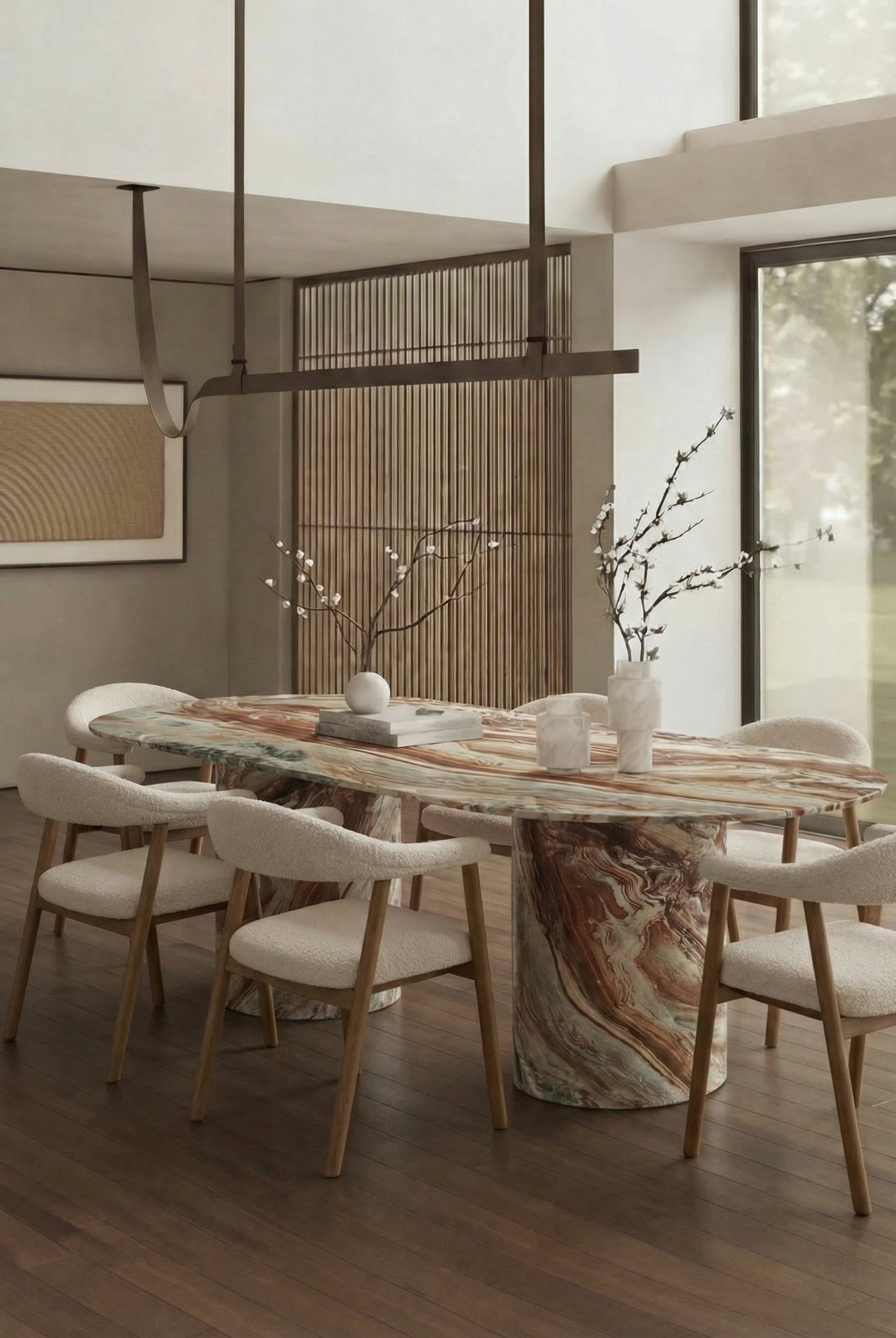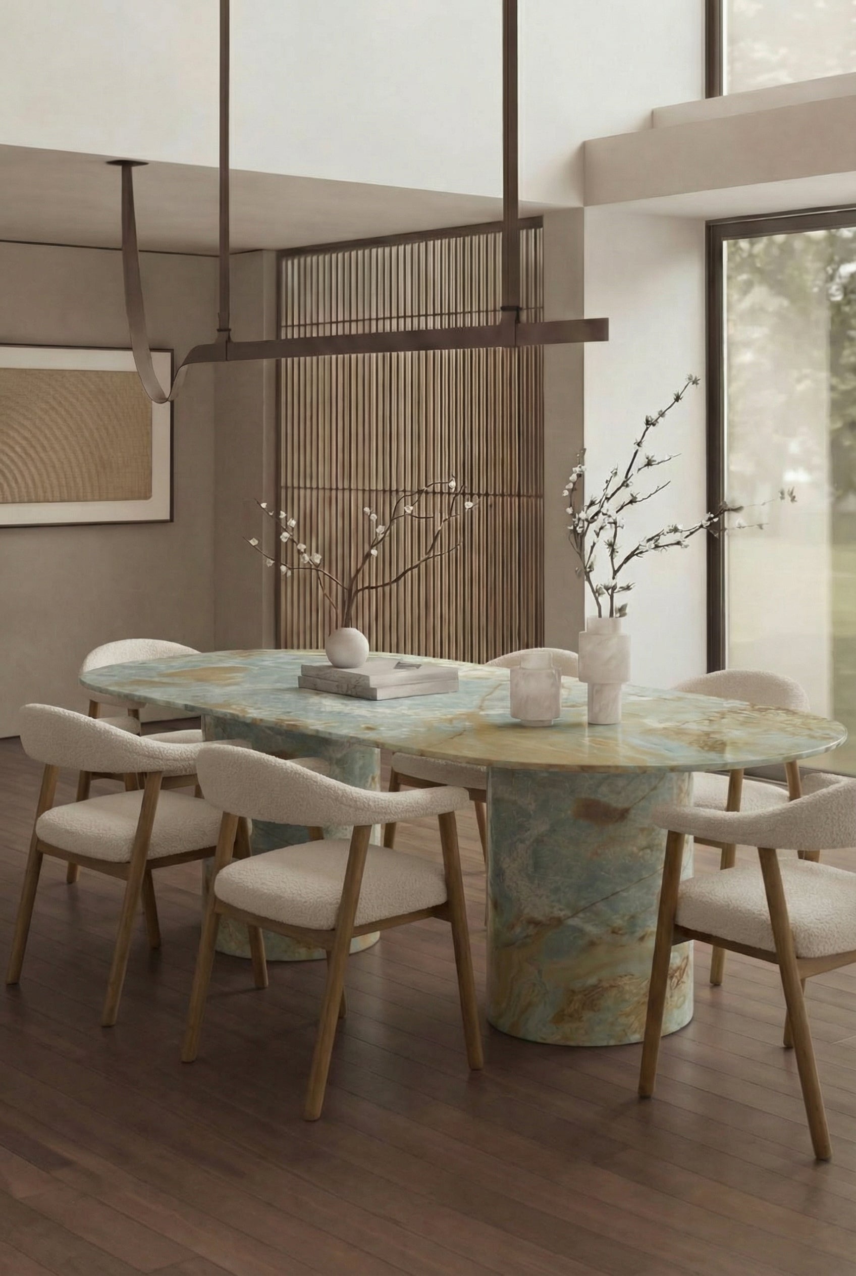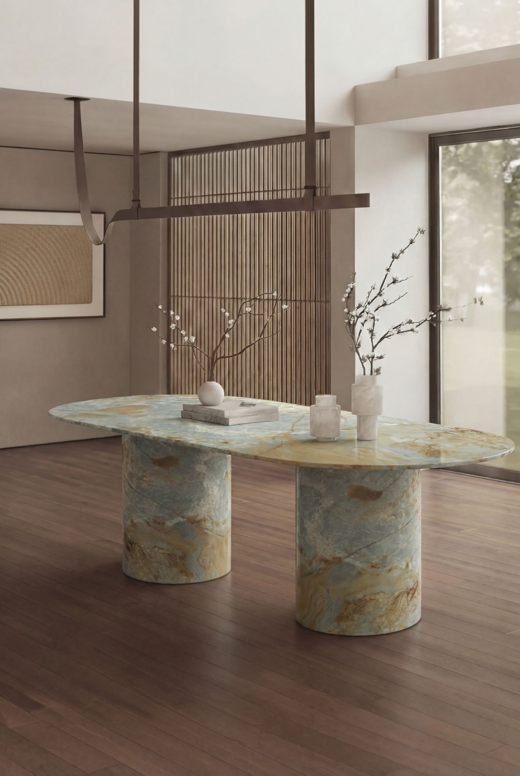Fluid blue tones and golden mineral veining create a mesmerizing centerpiece carved from luminous Blue Onyx. The smooth oval top rests on sculptural cylindrical bases, allowing the rich translucent stone patterns to flow across the surface like natural artwork. You elevate your dining space with a statement piece that blends refined luxury, organic beauty, and contemporary design.