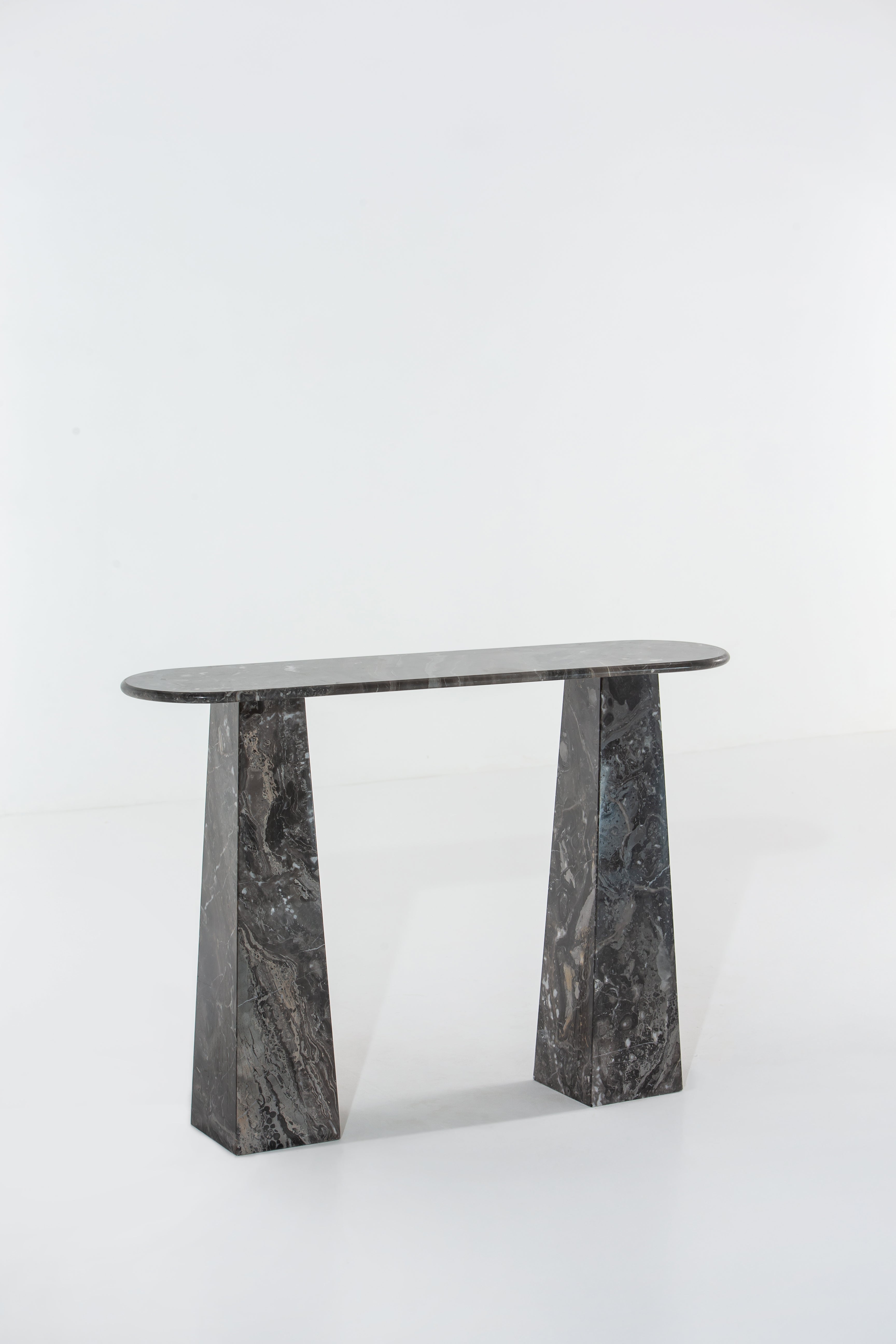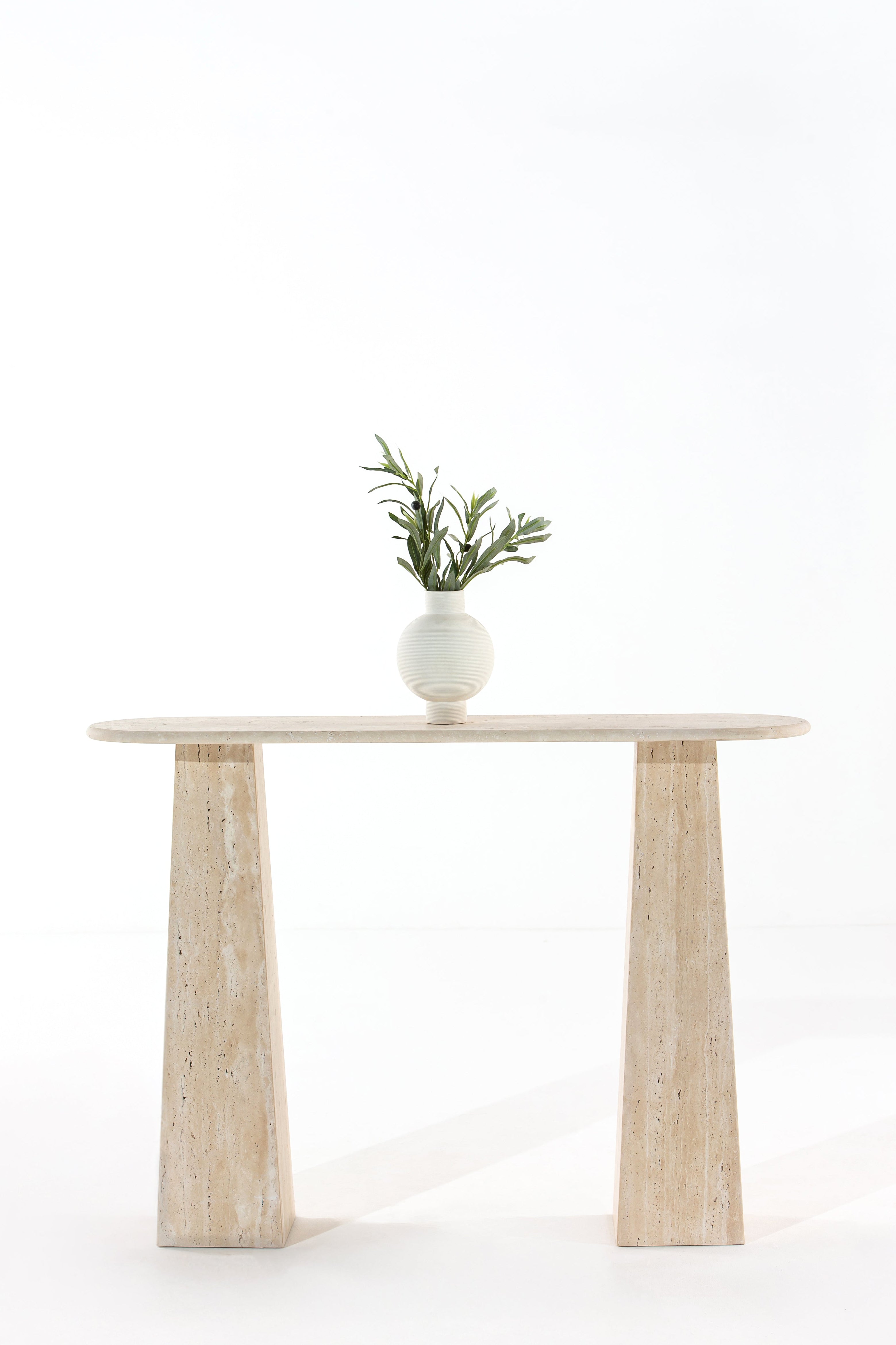 Striking a balance between minimalist form and rich materiality, the Stone Console Table is a sculptural accent designed to elevate hallways, entryways, and styled vignettes. Featuring a slim oval top and tapered block legs, this piece emphasizes proportion and symmetry, while showcasing the unique textures of natural travertine or dark marble. Each version offers its own mood—the warm beige travertine evokes earthy elegance, while the deep veined marble introduces bold sophistication. Whether used as a display surface or a functional console, this design anchors your space with refined simplicity and quiet strength.