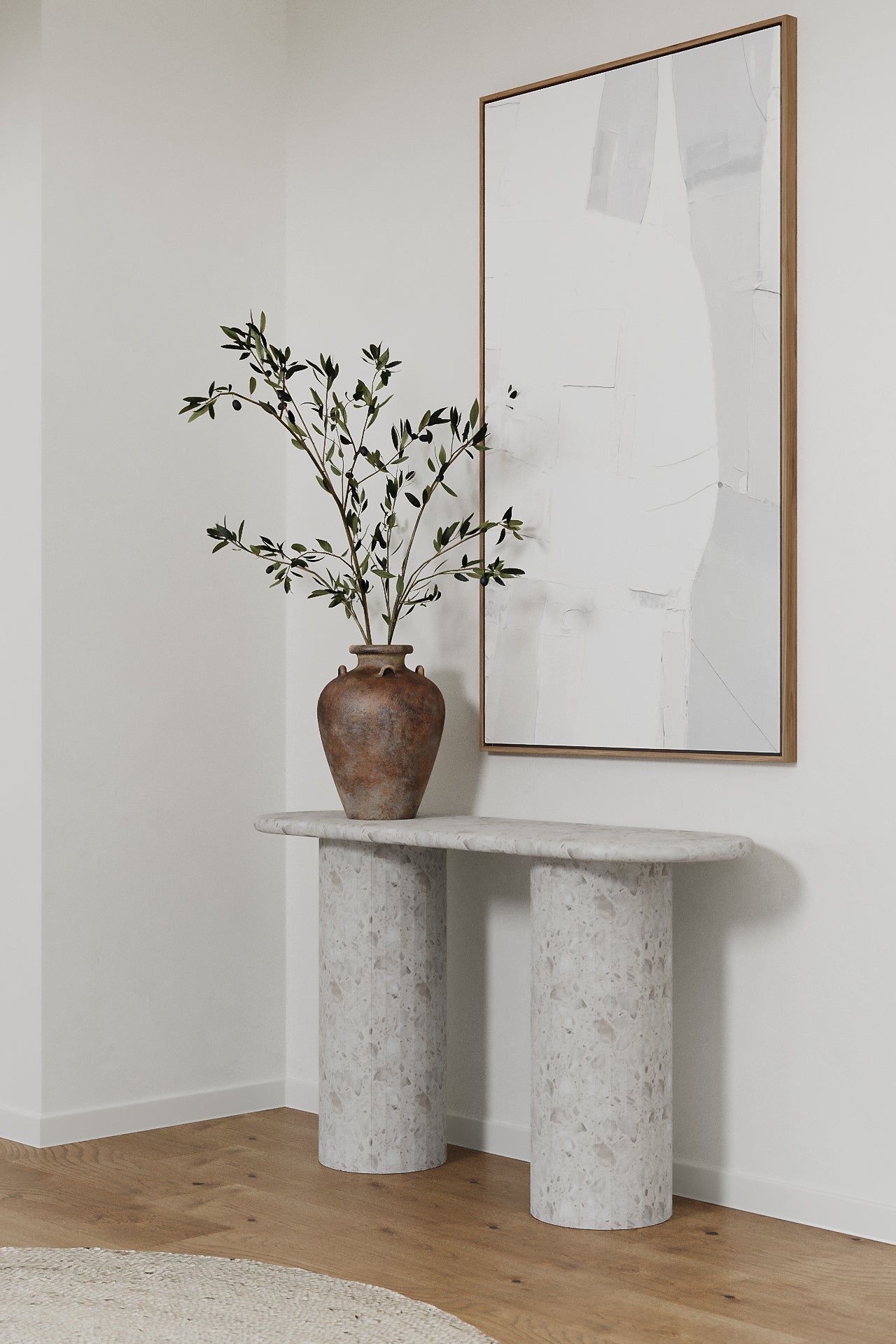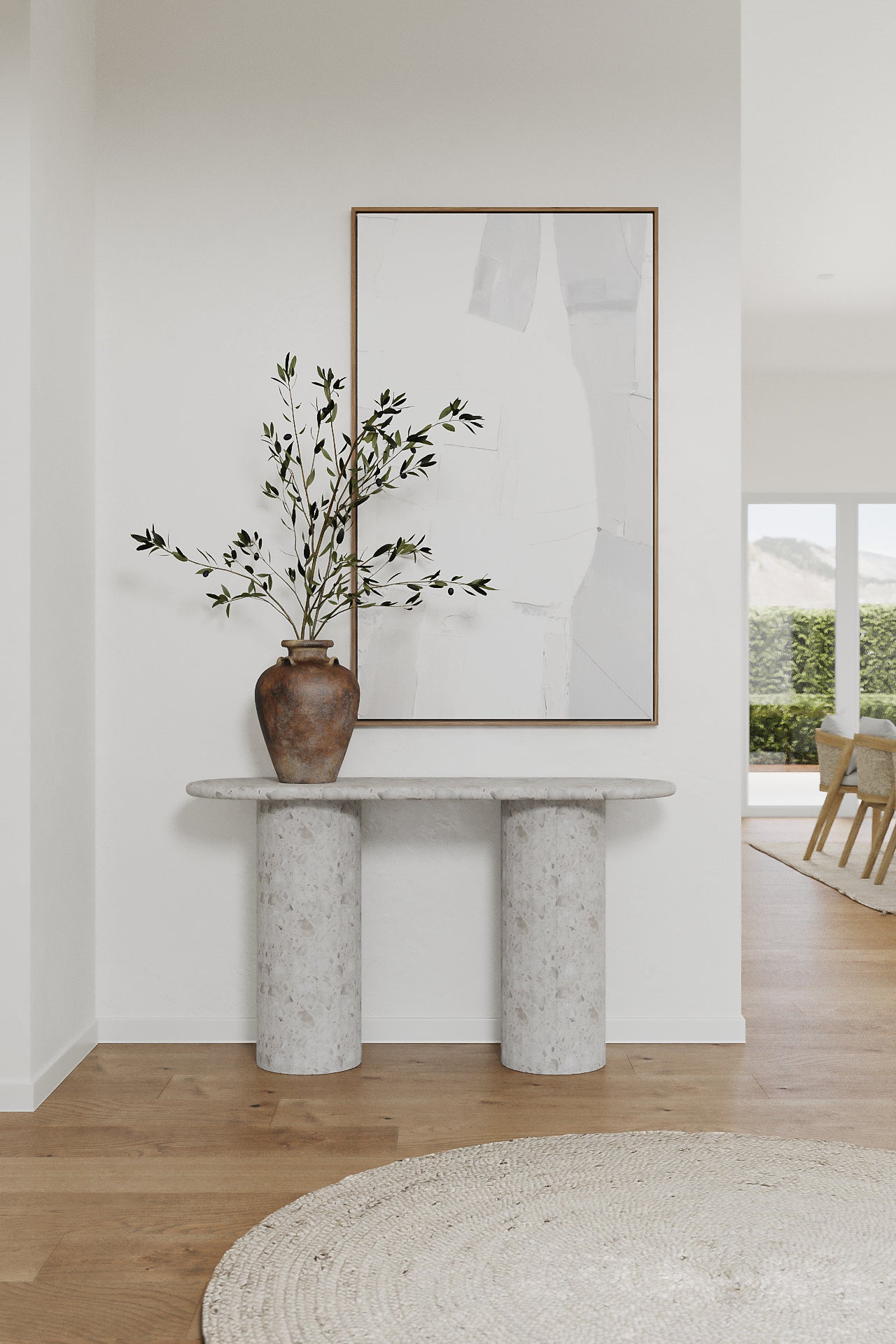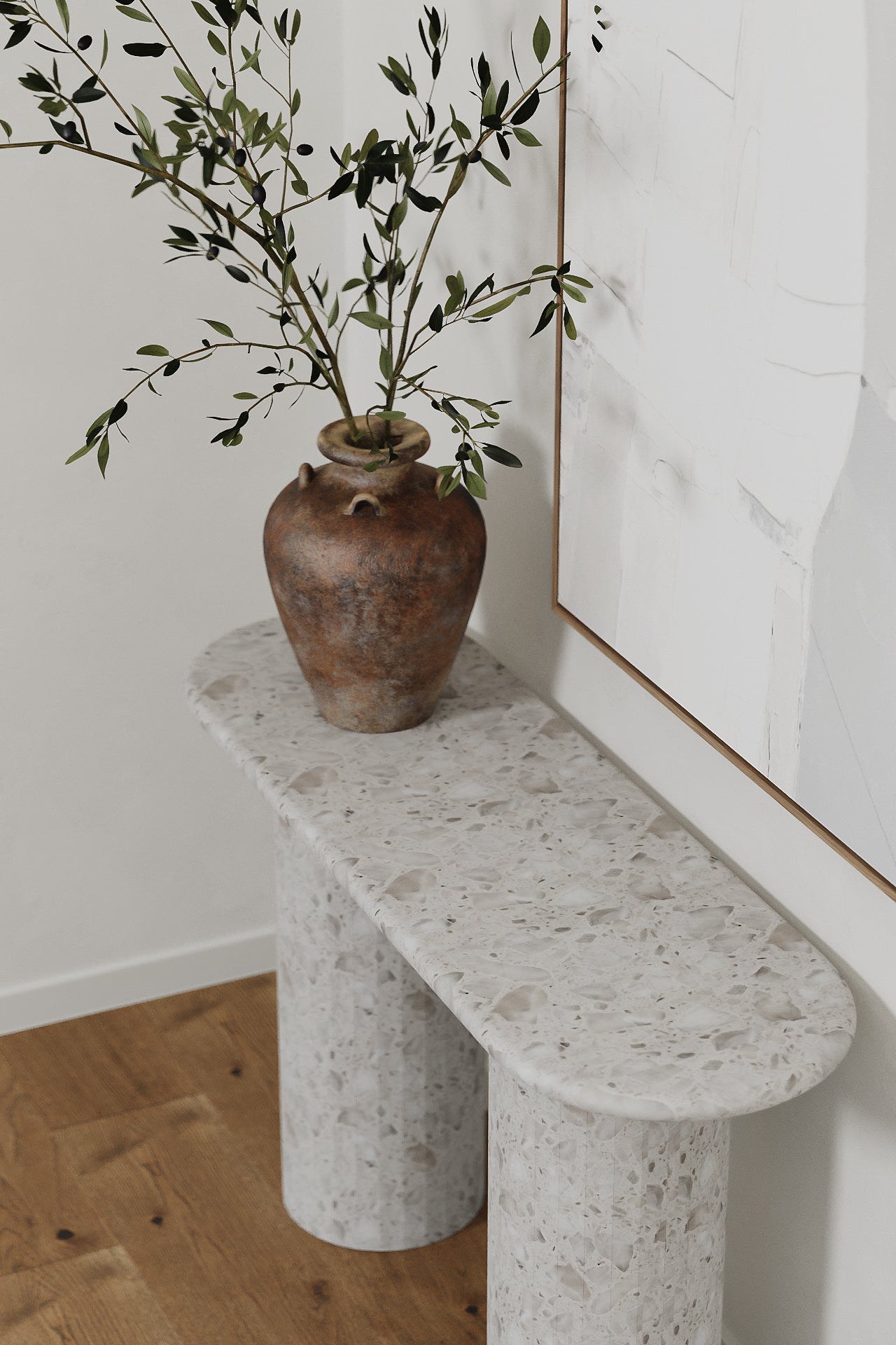 You elevate your interior with a console table crafted in luminous Bianco terrazzo, offering a soft blend of white stone fragments that create natural depth and subtle patterning. The smooth oval top brings a refined, flowing silhouette, while the rounded pillar bases add sculptural balance that anchors your entryway or living space with quiet sophistication. Its polished terrazzo surface catches light beautifully, making decor pieces, candles or ceramics feel effortlessly curated. Whether styled minimally or layered with accents, it becomes a serene focal point that blends modern charm with timeless material elegance.