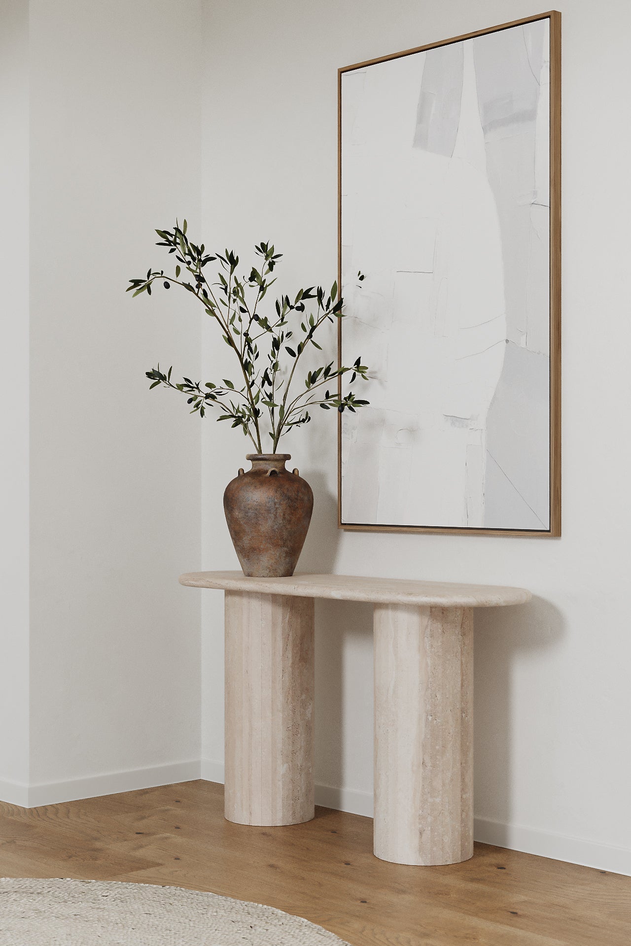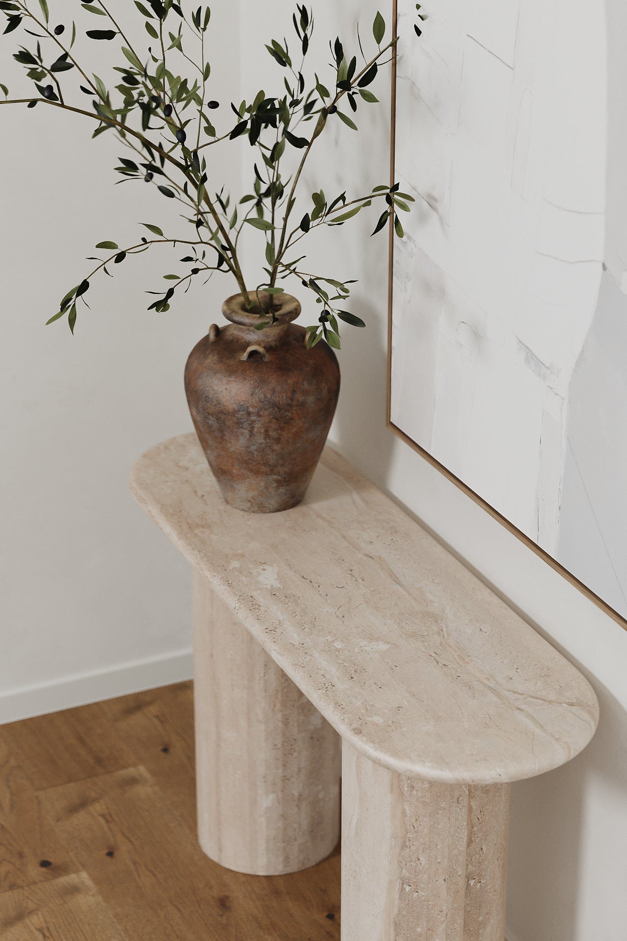 You enrich your home with a console table crafted from Brecia Beige marble, a stone admired for its warm tones, layered veining and natural depth. The smooth oval top creates a soft flowing silhouette, while the rounded pillar bases give the piece a sculptural balance that anchors your entryway or living space with quiet sophistication. Light enhances the marble’s organic patterns, making each console unique and visually captivating. Whether styled with candles, ceramics or curated decor, it becomes a refined focal point that blends timeless stone beauty with modern understated elegance.
