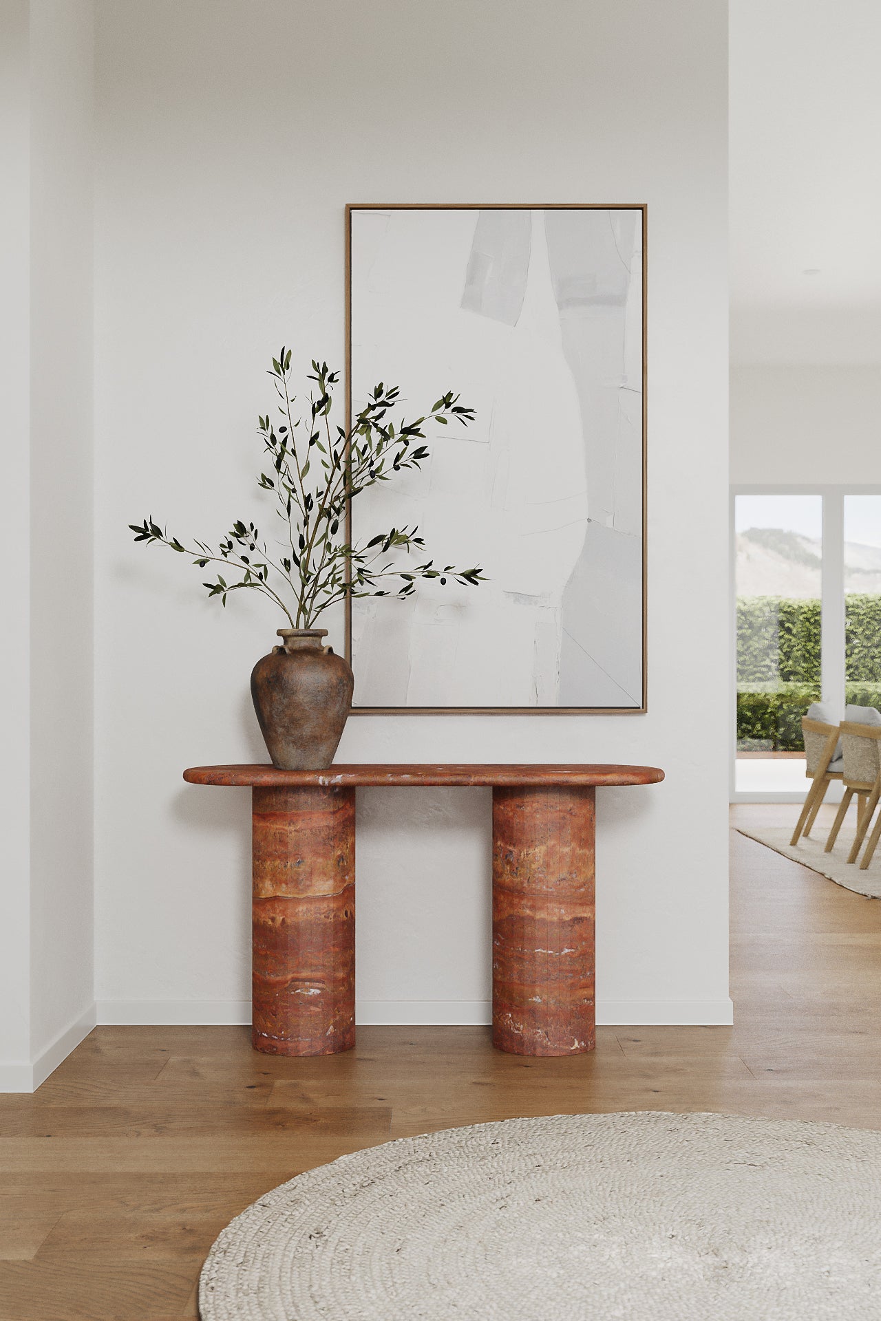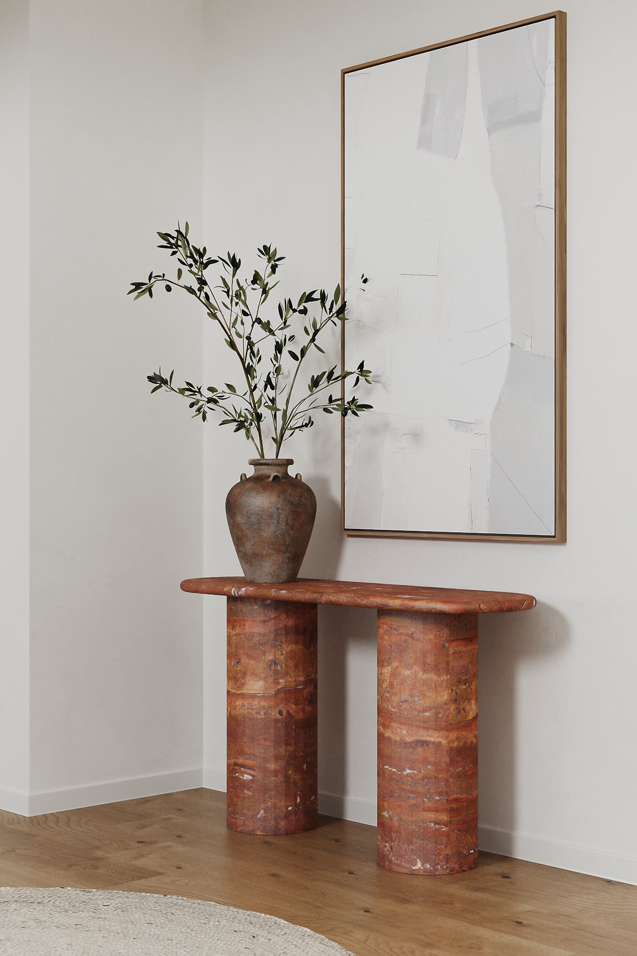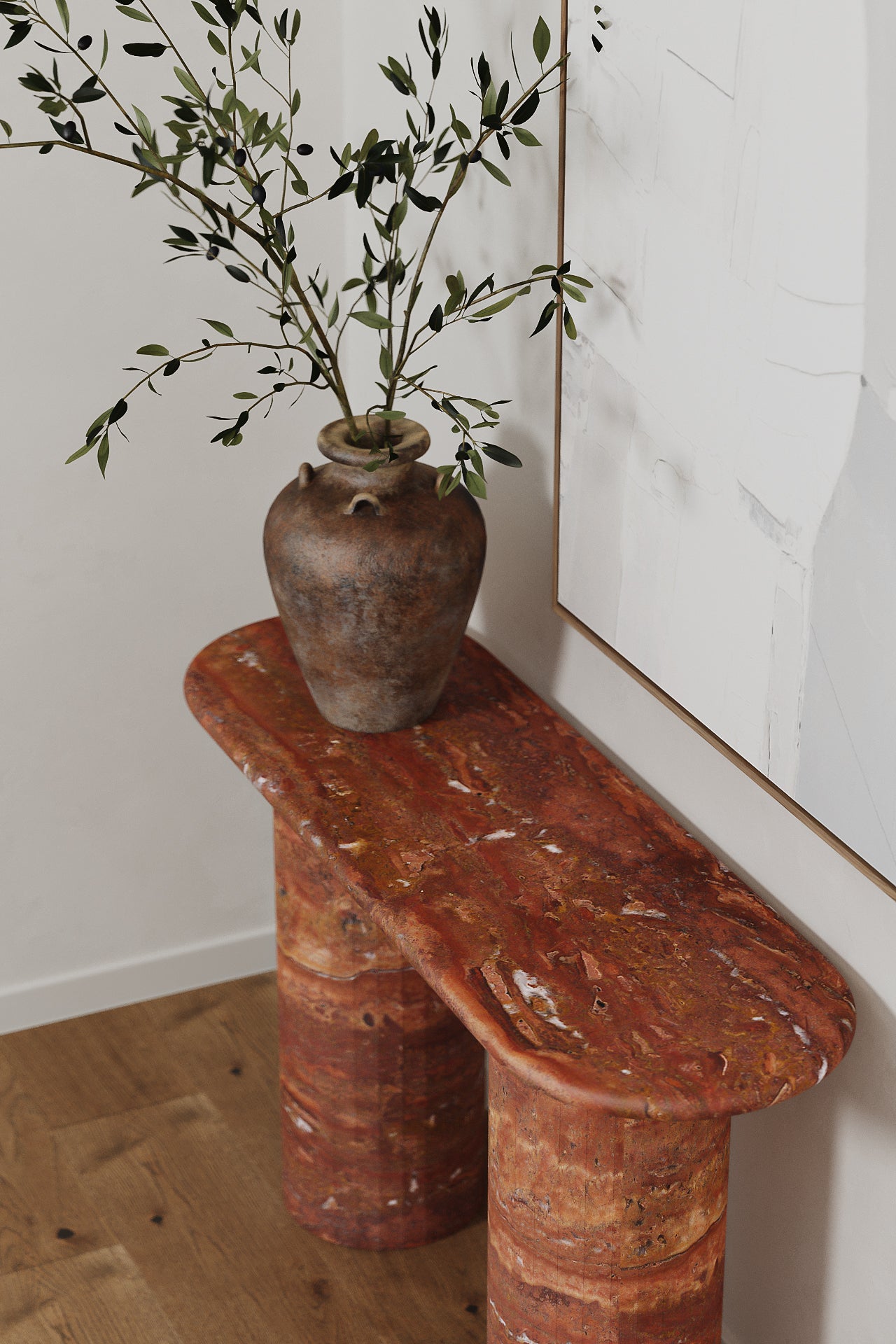 You enrich your home with a console table sculpted from striking red travertine, a natural stone celebrated for its warm earthy tones and unique organic patterns. The smooth oval top brings a refined flow to the silhouette, while the rounded pillar bases ground the piece with sculptural presence and timeless character. Sunlight enhances the depth of the stone, revealing soft variations and natural textures that make each console truly one of a kind. Whether styled with candles, ceramics or curated decor, it becomes a captivating focal point that blends modern elegance with the raw beauty of travertine.
