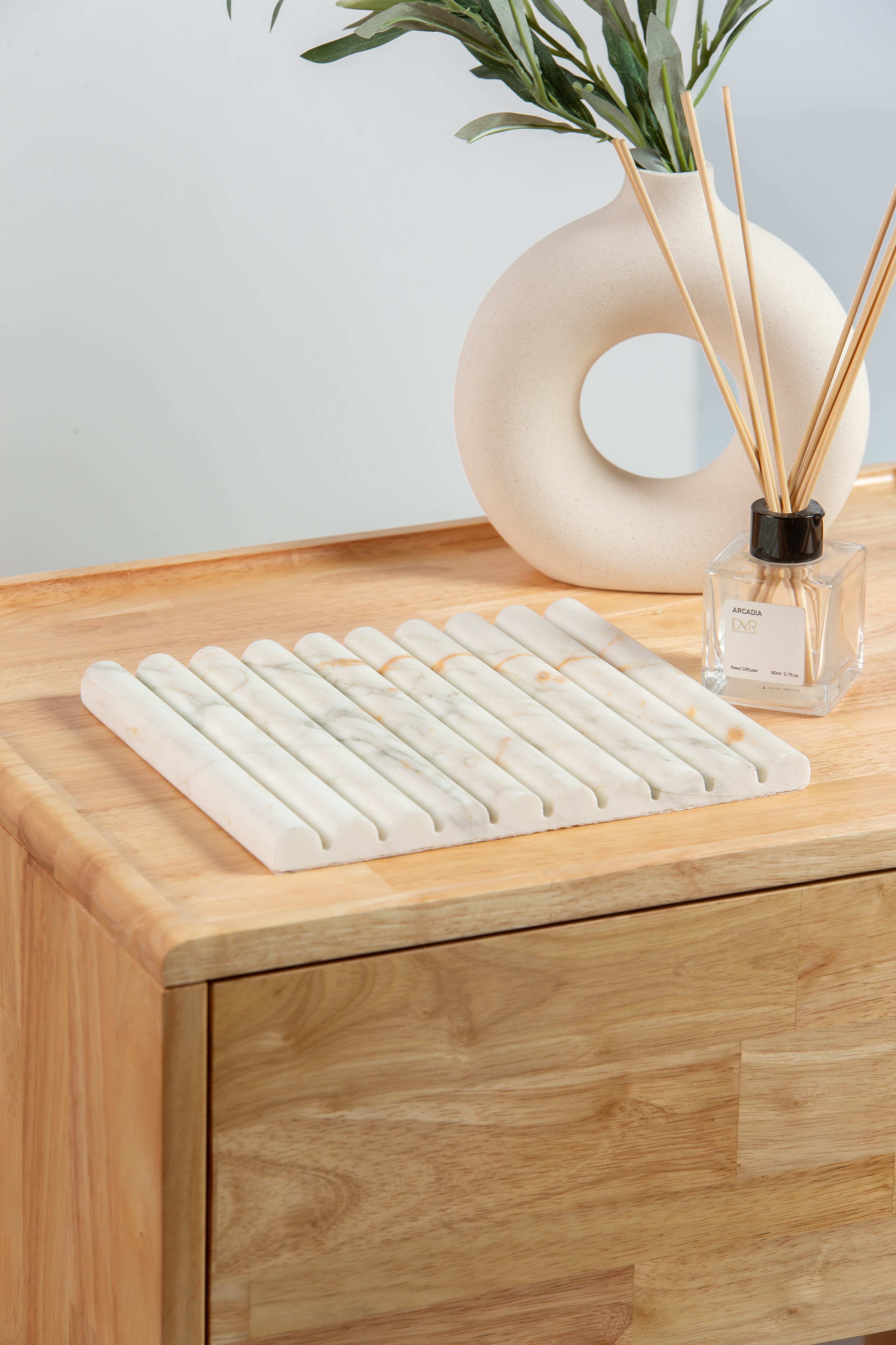 A true masterpiece of natural elegance and refined design. Its pristine white base interwoven with delicate golden-brown veining—characteristic of premium Calacatta Oro marble—instantly captivates, bringing sophisticated warmth to your home decor. The distinct ribbed design offers a captivating texture and a modern, minimalist aesthetic, making this rectangular tray a versatile and stylish addition to any room. Whether used as a chic vanity organizer, a decorative centerpiece for your coffee table, or an elegant way to display candles and jewelry, this durable and stunning marble piece invites you to elevate your interior with its timeless beauty. Indulge in the tactile pleasure of genuine marble and transform your space into a sanctuary of style with this unique and functional tray.