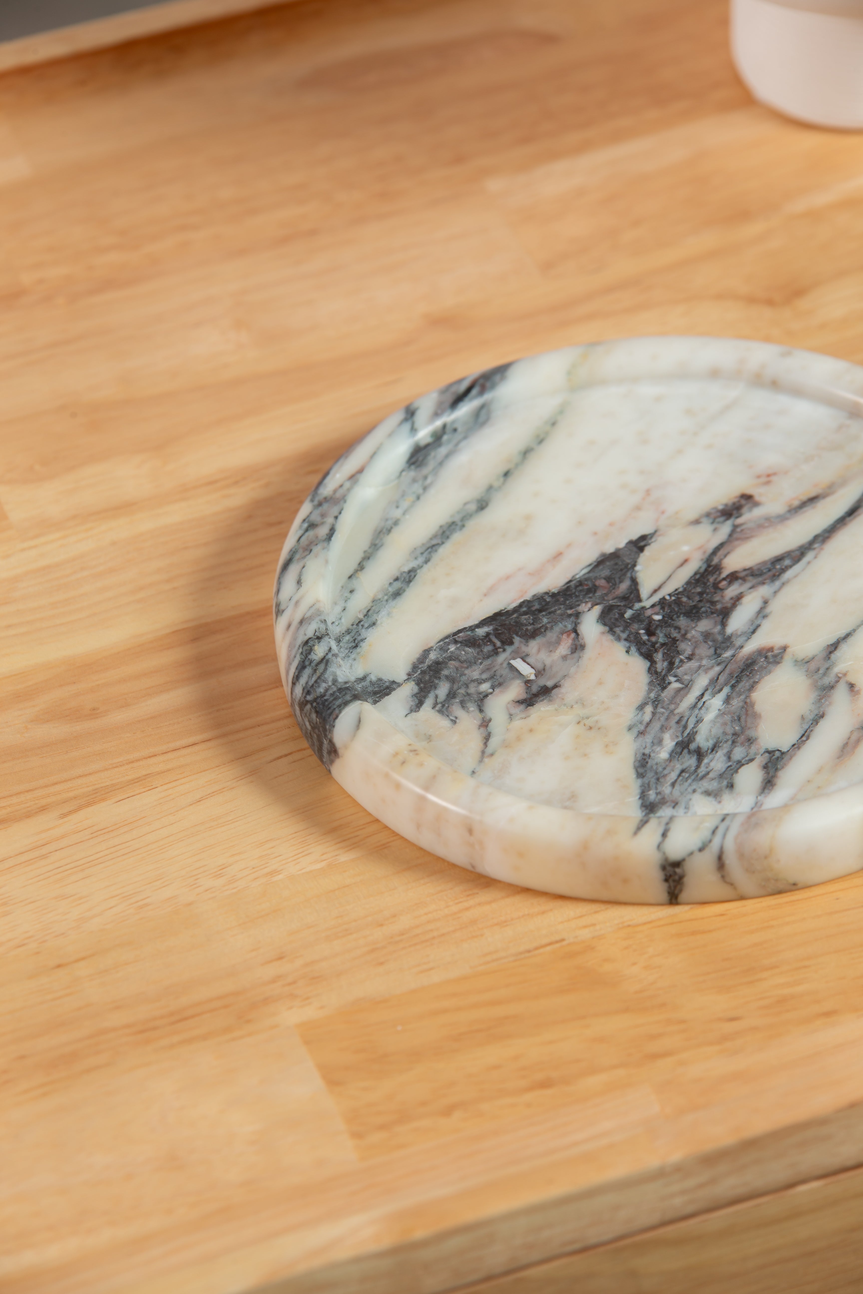 Crafted from exquisite Viola marble, this round centrepiece boasts a captivating blend of creamy whites, subtle grays, and dramatic dark veining, creating a unique and artistic design that is sure to draw the eye. Its smooth, cool texture invites touch, while the substantial feel speaks to its premium quality. Imagine this versatile marble slab gracing your dining table as a stunning centrepiece, serving as a chic base for candles and decorative objects, or protecting your surfaces as a luxurious coaster for your most prized drinks. Let its natural beauty transform your space and become the protagonist of your refined interior design. Perfect as a decorative tray, marble coaster, or elegant centrepiece, the Viola Centrepiece Slab is a statement piece for the discerning homeowner.