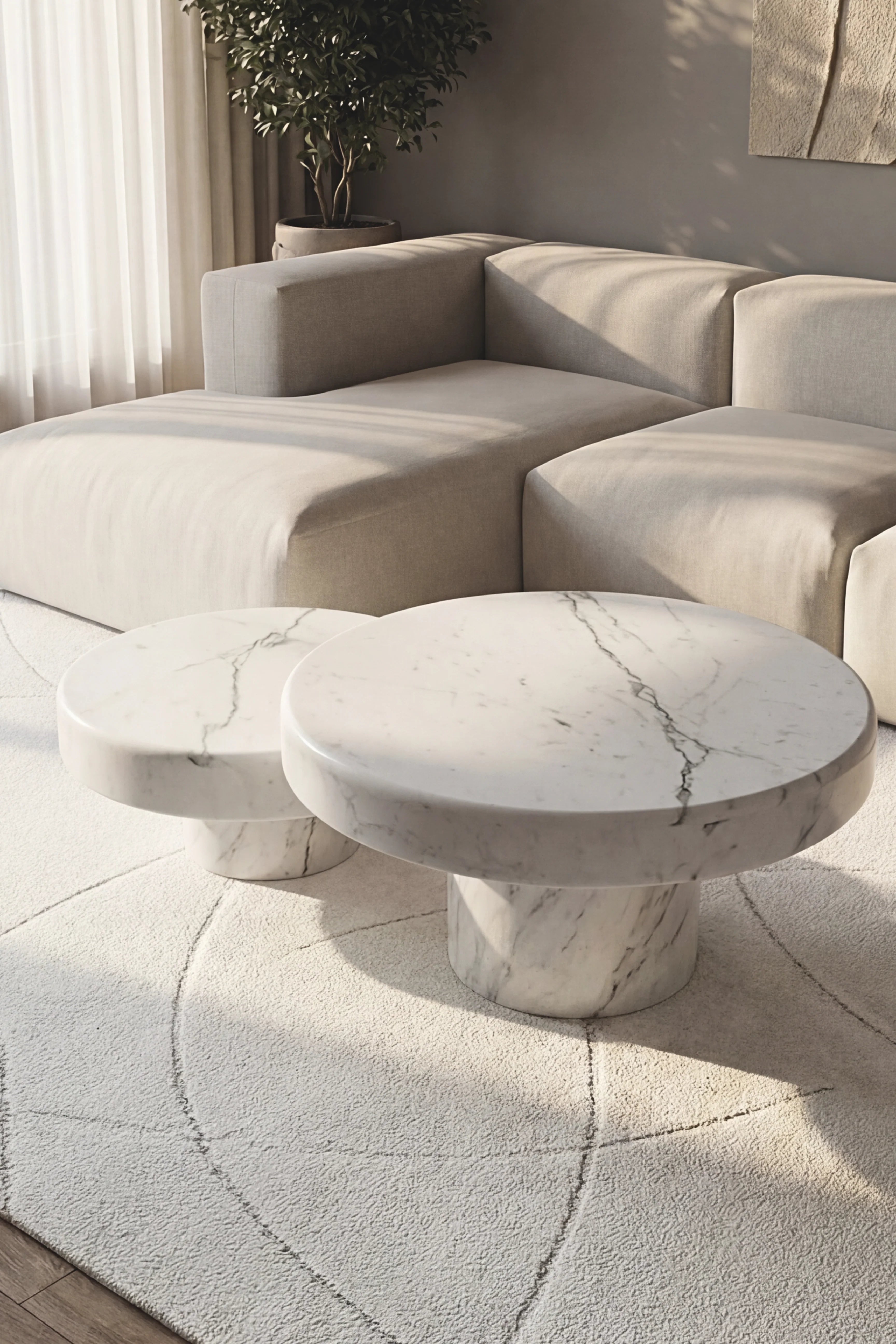 Bring a crisp, gallery worthy elegance into your living room with a round marble centerpiece that feels both sculptural and serene. The luminous white surface is traced with natural Calacatta veining, adding depth and refined character while keeping the space light and airy. Its smooth silhouette and grounded base create a balanced statement that pairs beautifully with soft neutrals, modern textures, and minimalist styling. Perfect for curated books, candles, and everyday moments, it’s a timeless piece designed to elevate your home with quiet luxury.