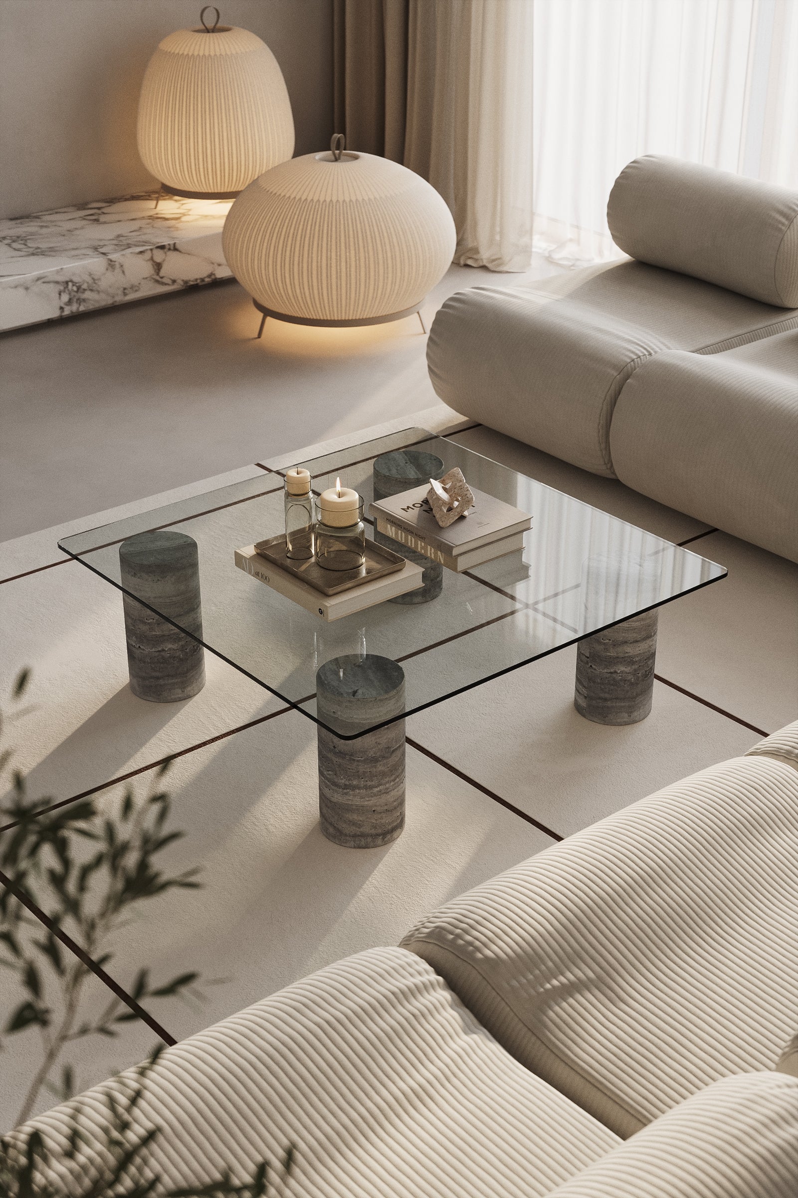 A clear glass top is elevated by cylindrical grey travertine pillars, revealing natural veining and layered stone texture beneath the surface. The contrast of transparency and mineral depth creates a composed, architectural presence. Light moves effortlessly across the glass while the stone grounds the design. Sculptural yet understated, it anchors the living space with calm confidence. A refined focal point that brings material richness and modern balance to contemporary interiors.